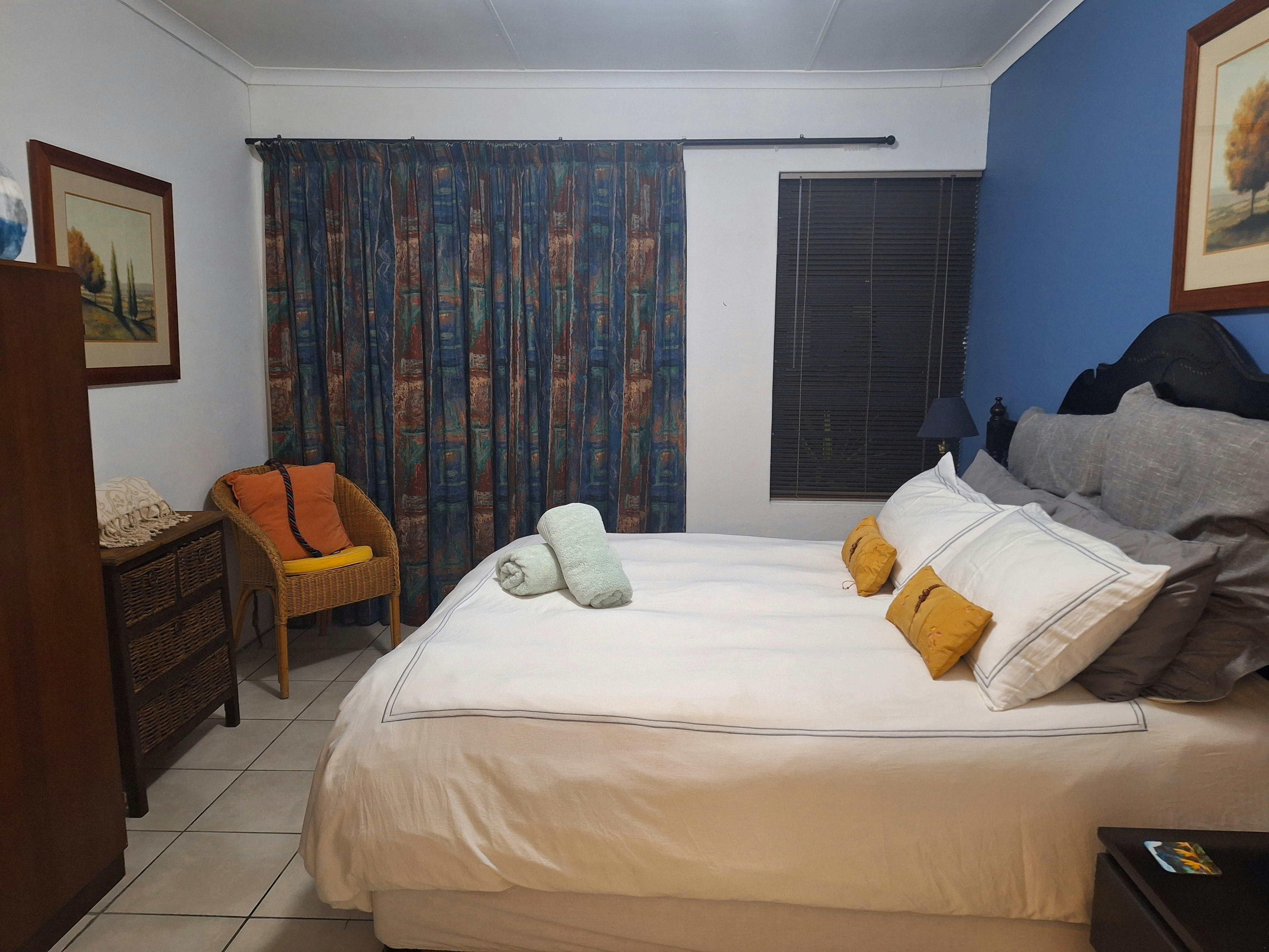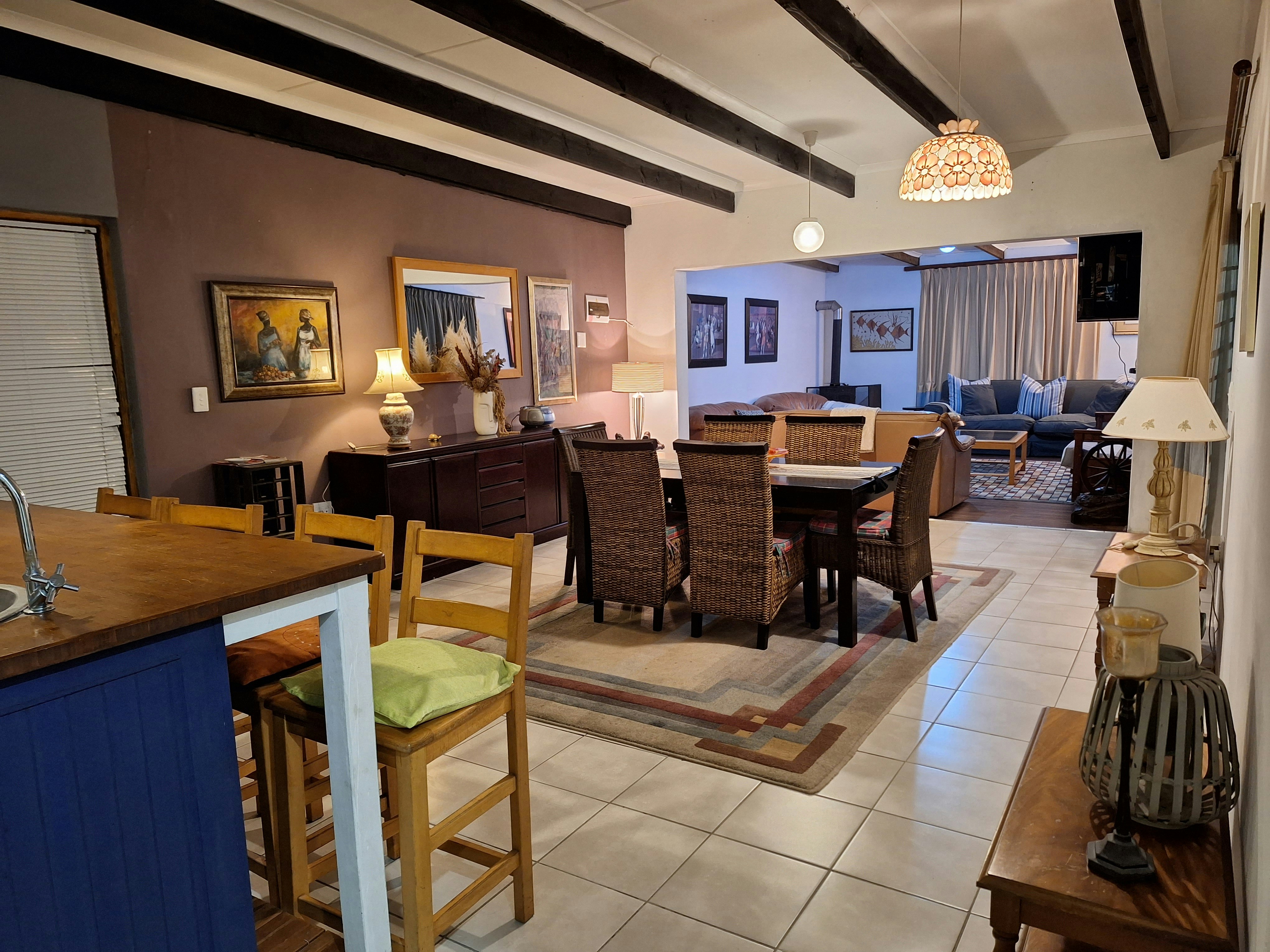 The spacious kitchen is well-equipped with a fridge-freezer, microwave, oven, gas stove, dishwasher, washing machine, toaster, kettle, cutlery, and crockery. The living area features a TV with DStv, comfortable seating, and glass doors opening onto the patio. Two folding tables are available in the living area and in the kitchen.