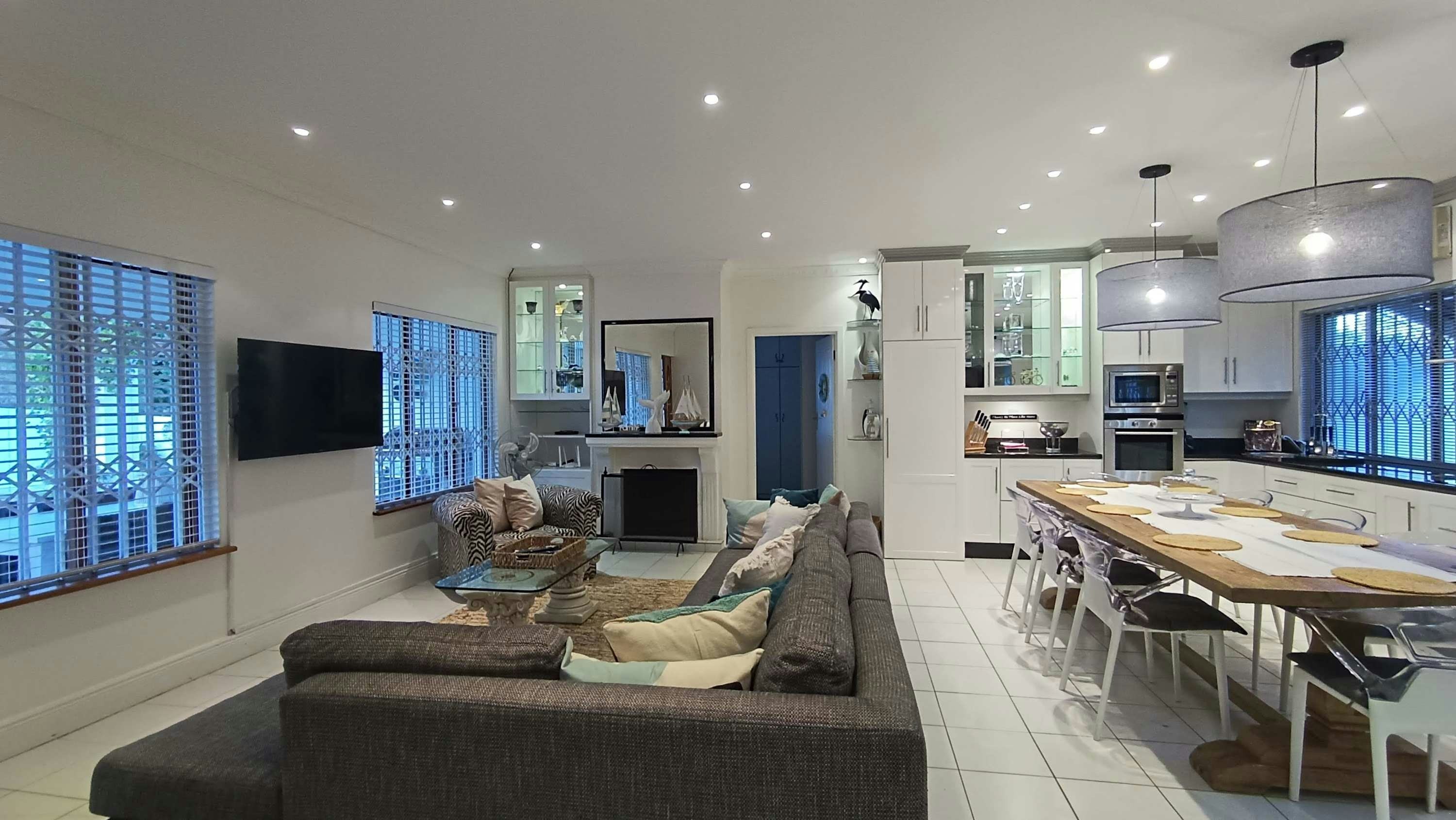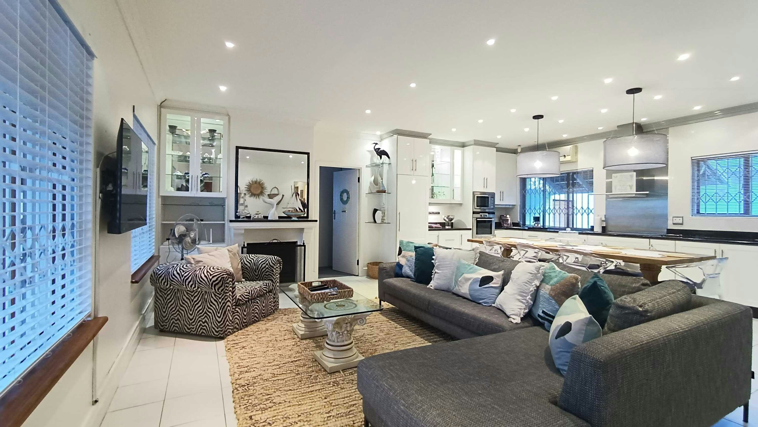 The house comprises an open-plan kitchen, lounge and dining area. The kitchen is equipped for self-catering with a fridge, oven, stove, and microwave, as well as a washing machine, tumble dryer and dishwasher for convenience. The lounge is equipped with a TV with the DStv Now and Netflix app. There is also an inverter and battery backup for the lights, TV and Wi-Fi in case of load shedding.