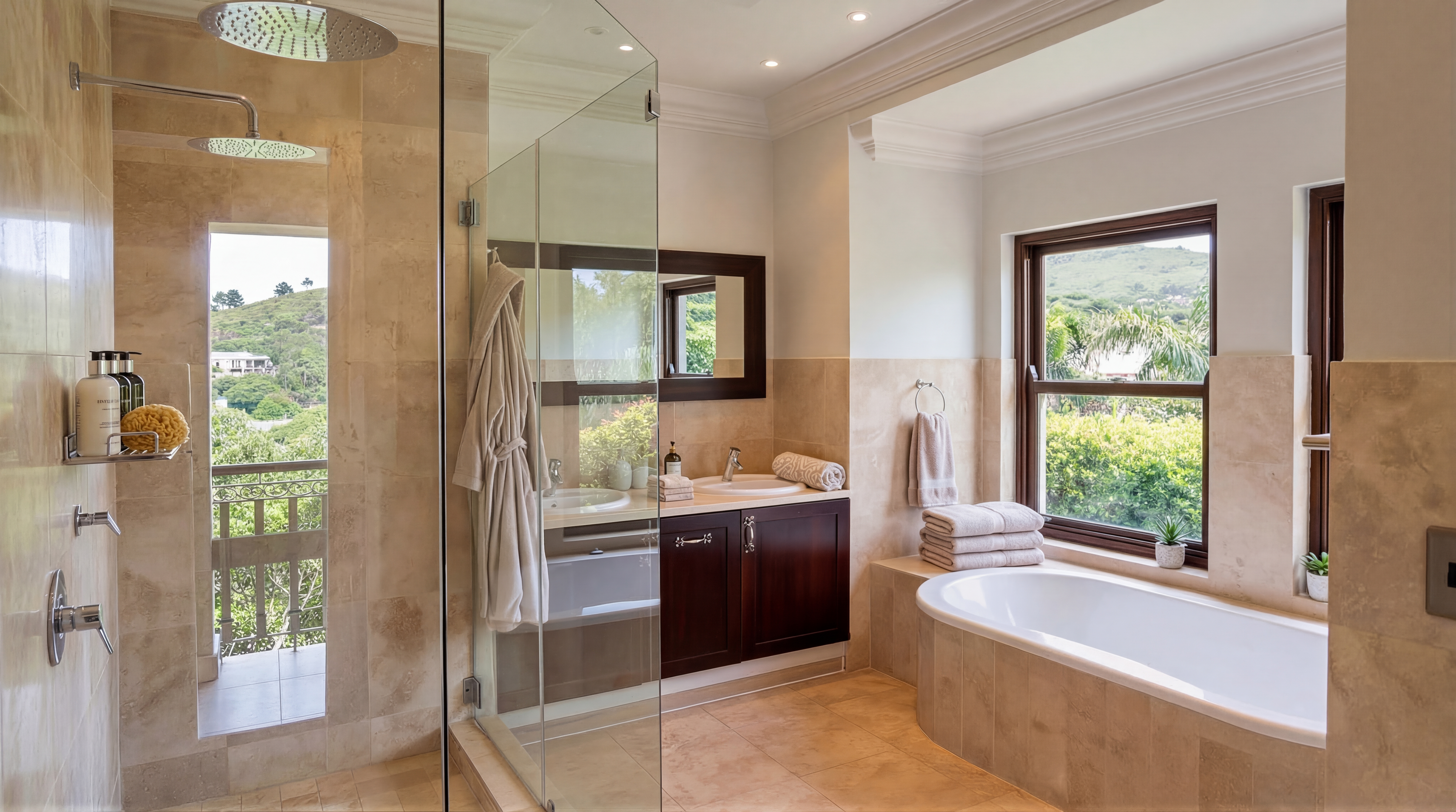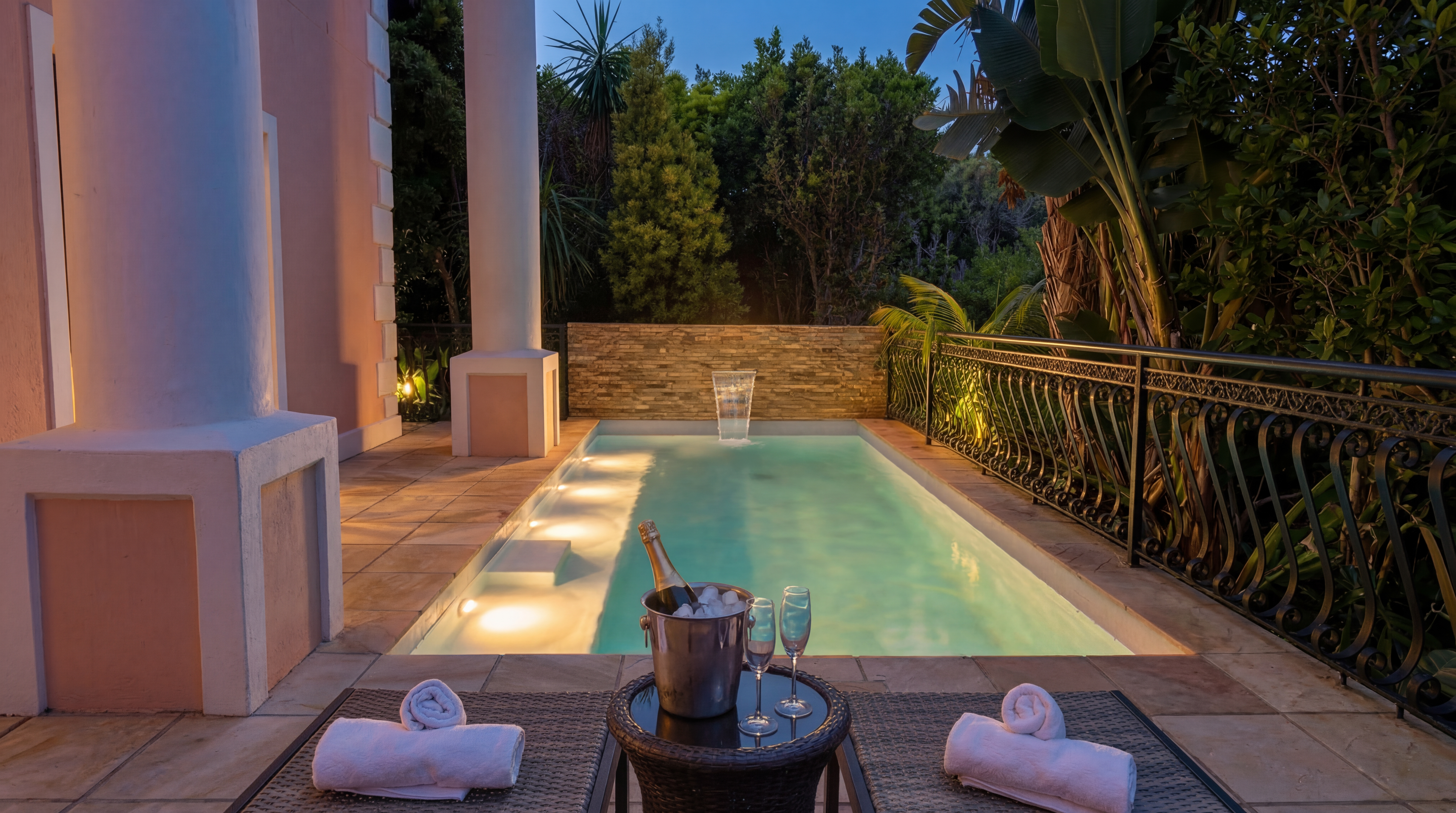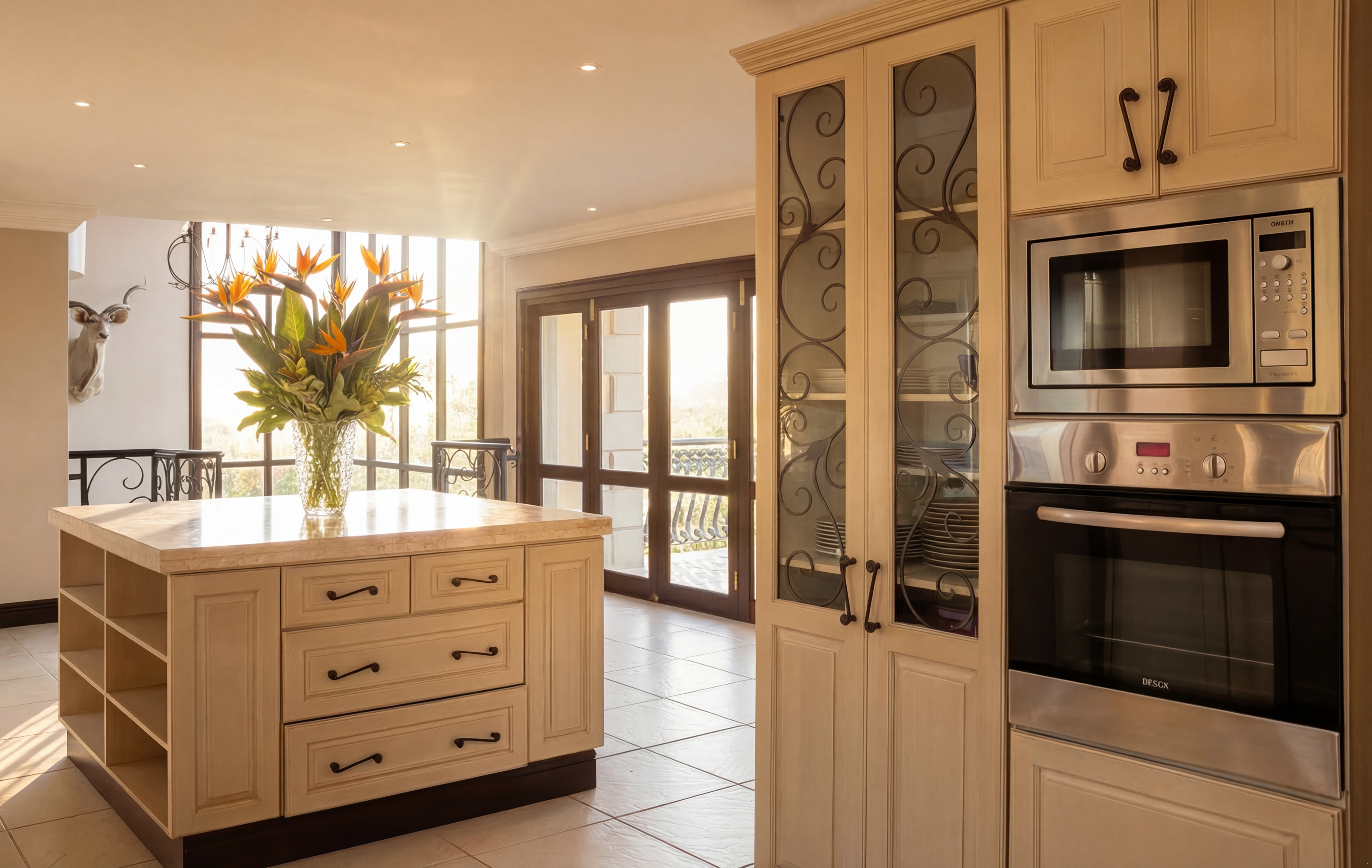 The villa has a lovely swimming pool with a view, as well as ample relaxation areas. Housekeeping is done on Mondays, Wednesdays and Fridays, except for public holidays. The villa is protected by a comprehensive house alarm which is linked to an armed response company, and all gates are controlled by remote access.