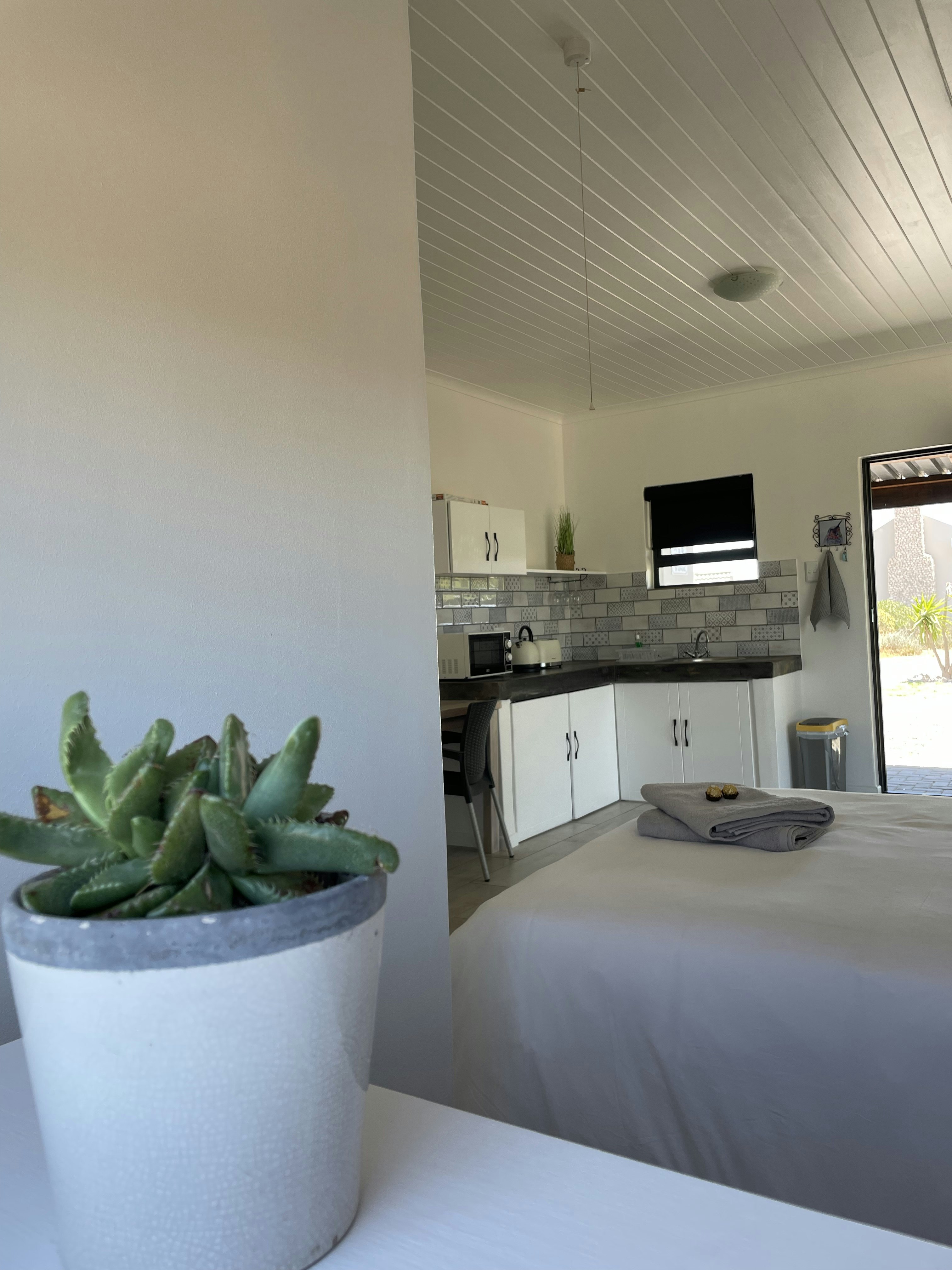 Strandlopertjie is a one-bedroom semi-detached apartment with its own entrance. The bedroom is furnished with a double bed and has a bathroom fitted with a shower, basin, and toilet. There is a sleeper couch in the lounge area that is suited for 1 child on a prior arrangement. The kitchen is equipped with a gas plate, microwave, and fridge as well as tea-and-coffee-making facilities. There is a smart TV in the lounge area and the patio is enclosed with braai facilities.
