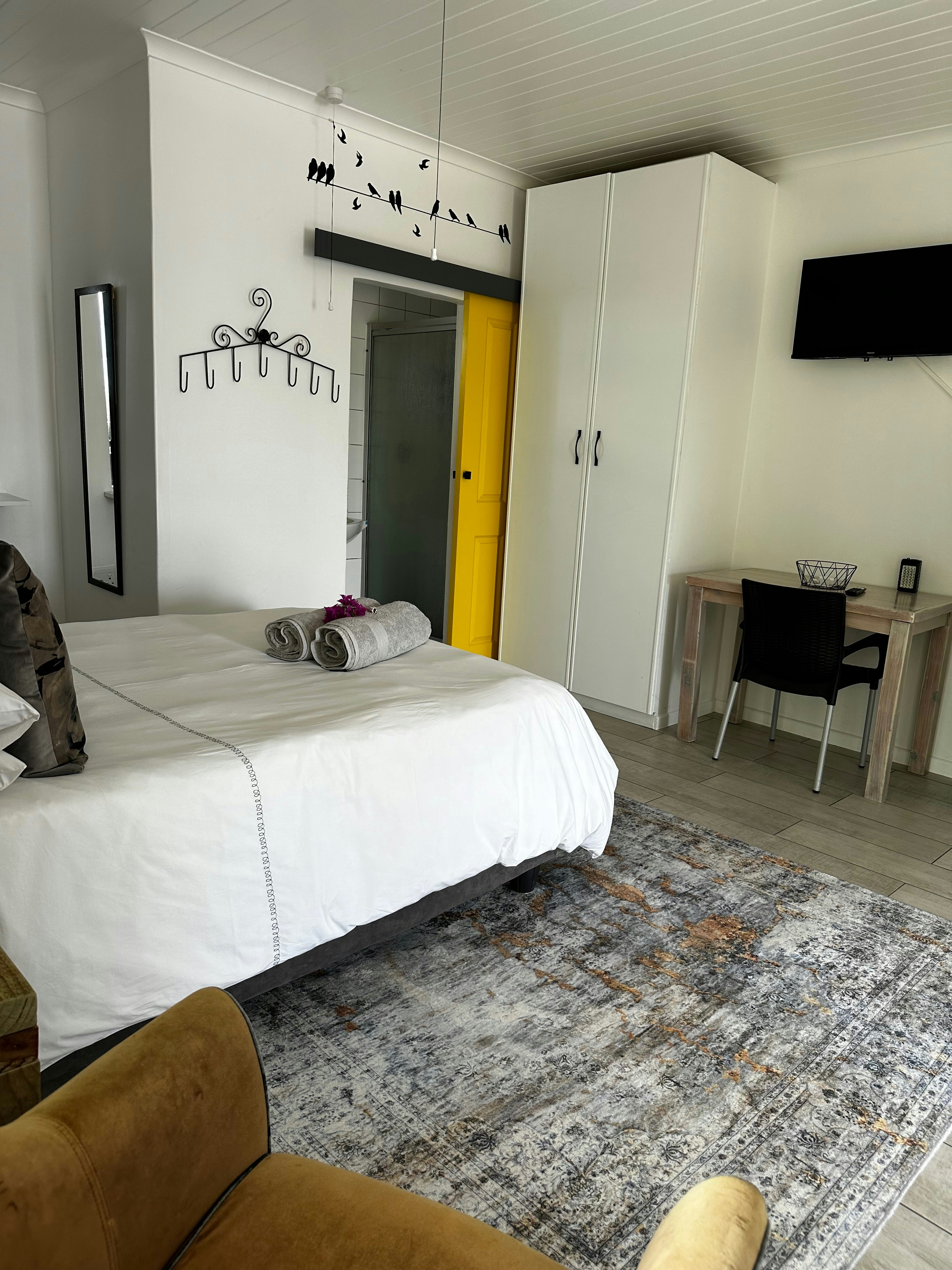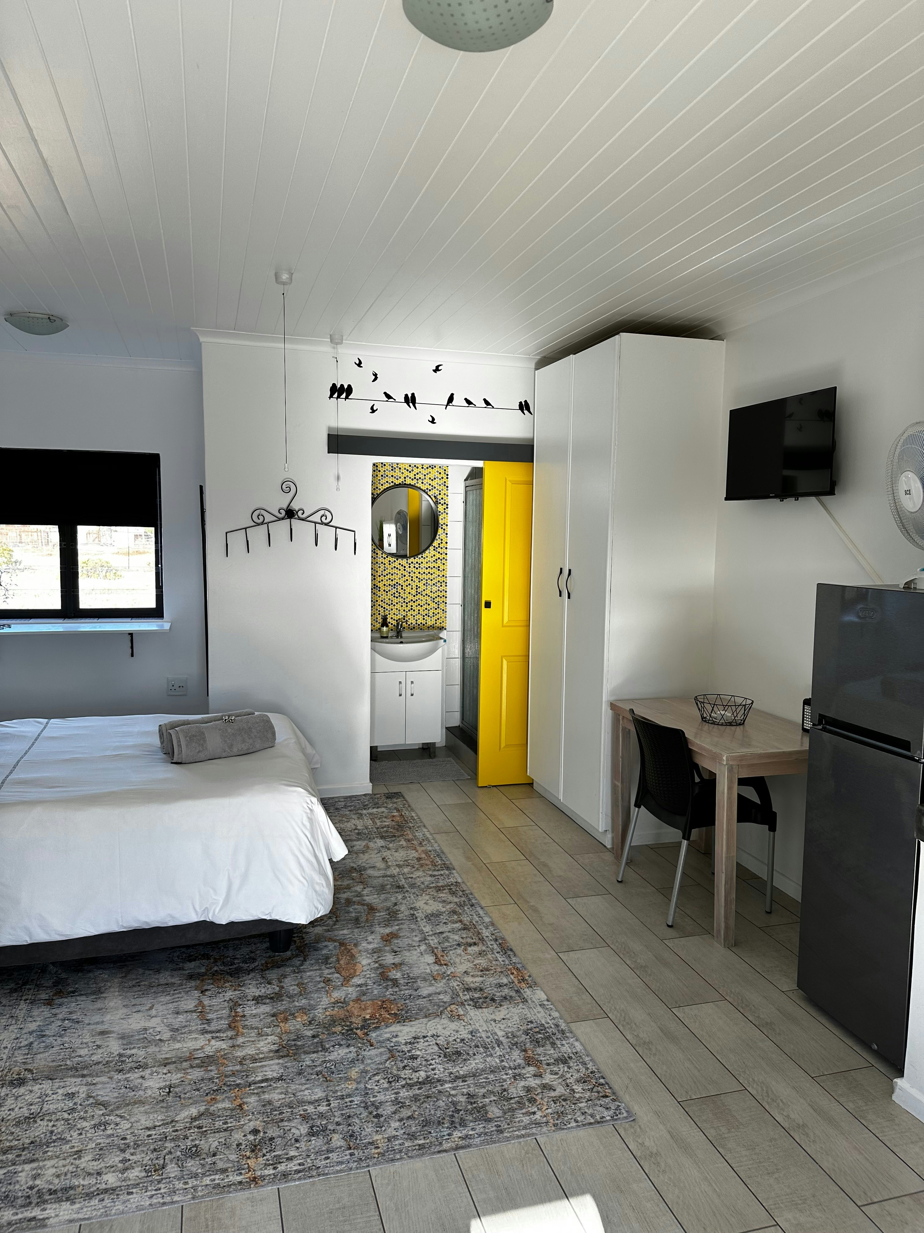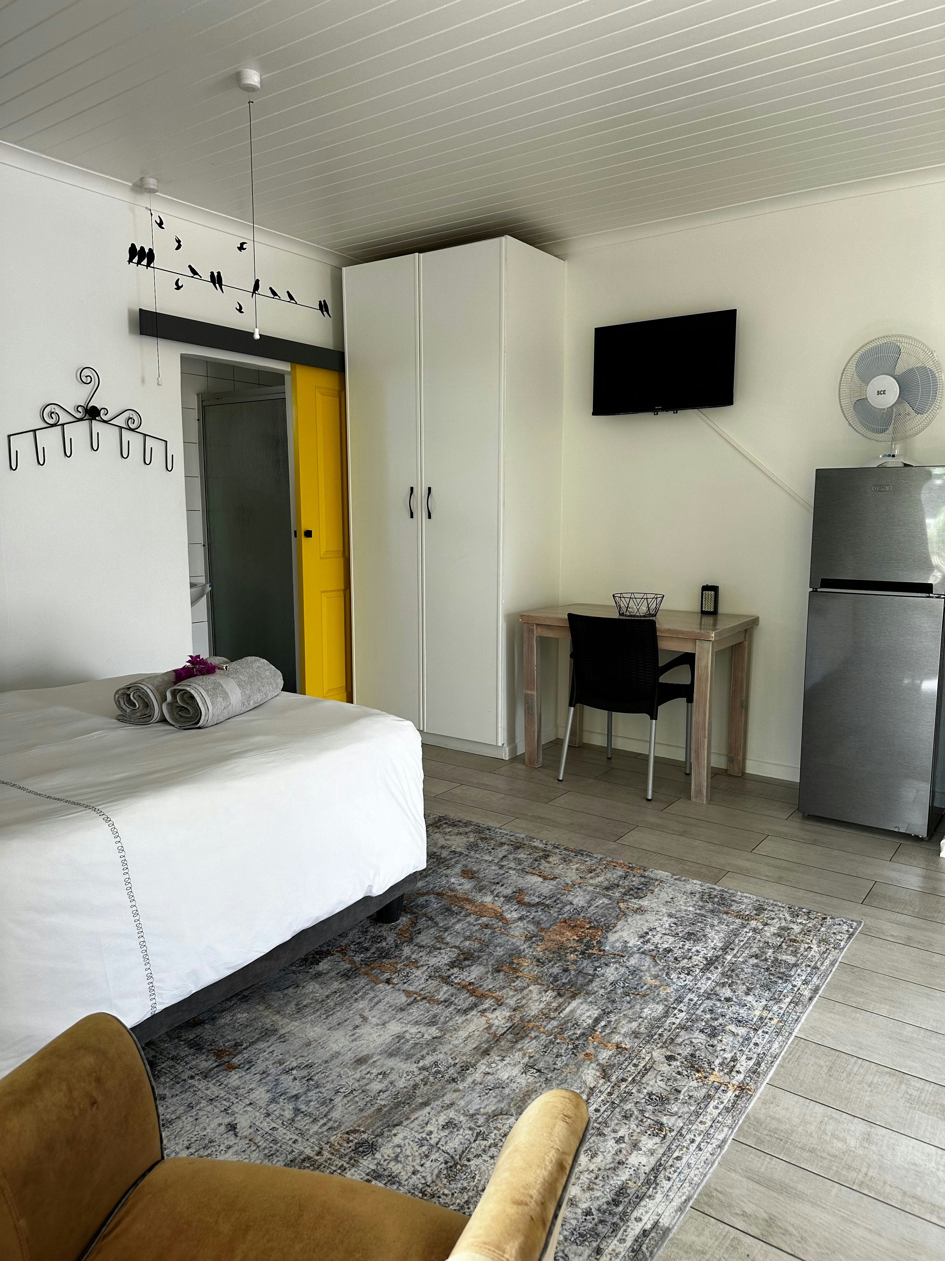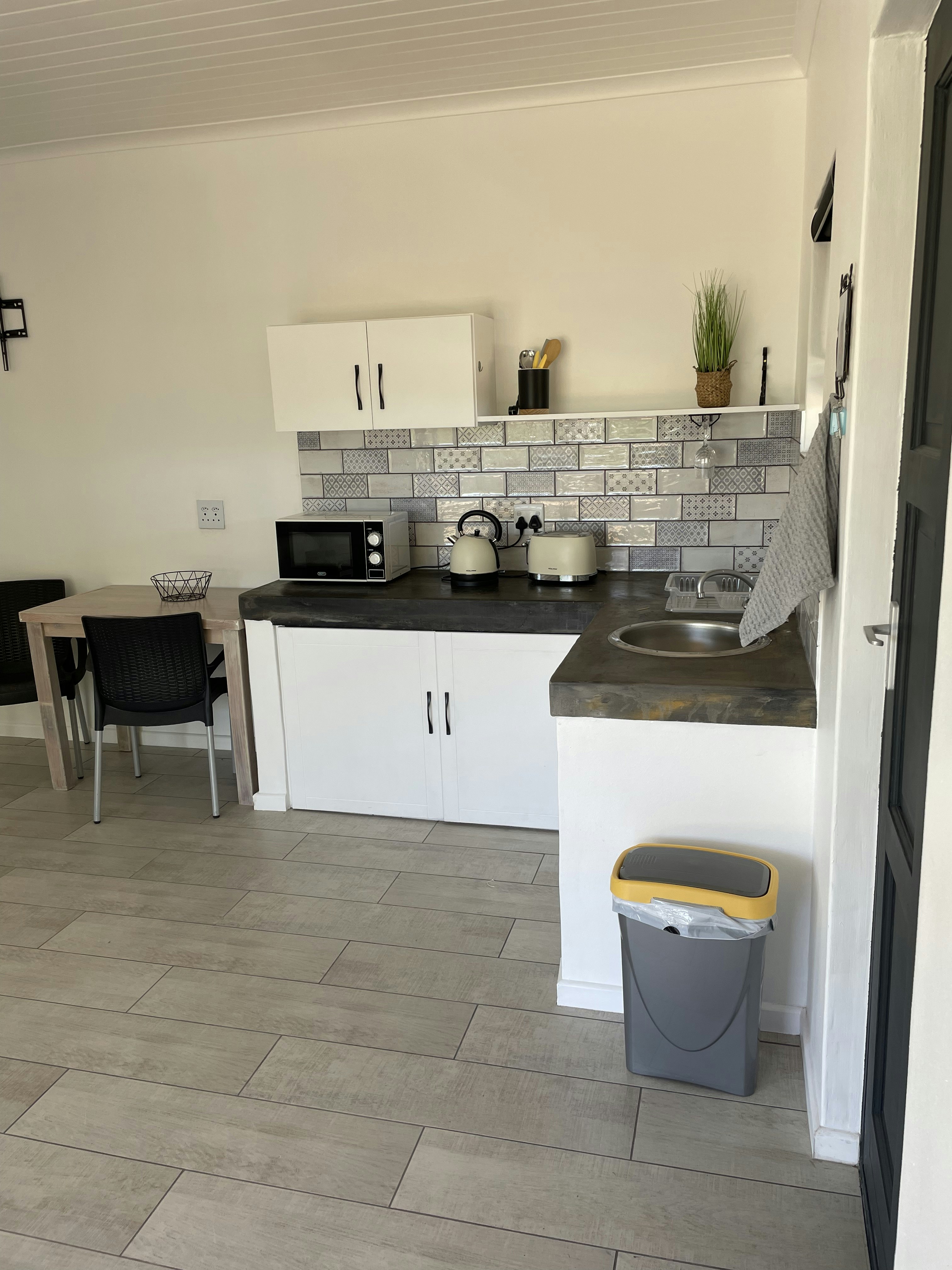 Suikerbekkie is suited to accommodate 2 adults and is furnished with a double bed. All bedding is provided. The bathroom is fitted with a shower, basin and toilet. Other facilities include a small kitchen equipped with all the necessaries, no stove but light cooking can be done on the gas plate provided. The braai room has a TV, (Netflix is available), a couch, table and chairs. Outside is a lapa, and hopefully, you can spot a Suikerbekkie flying around. We are close to restaurants, Laguna Mall and the beach Suikerbekkie is your spot.