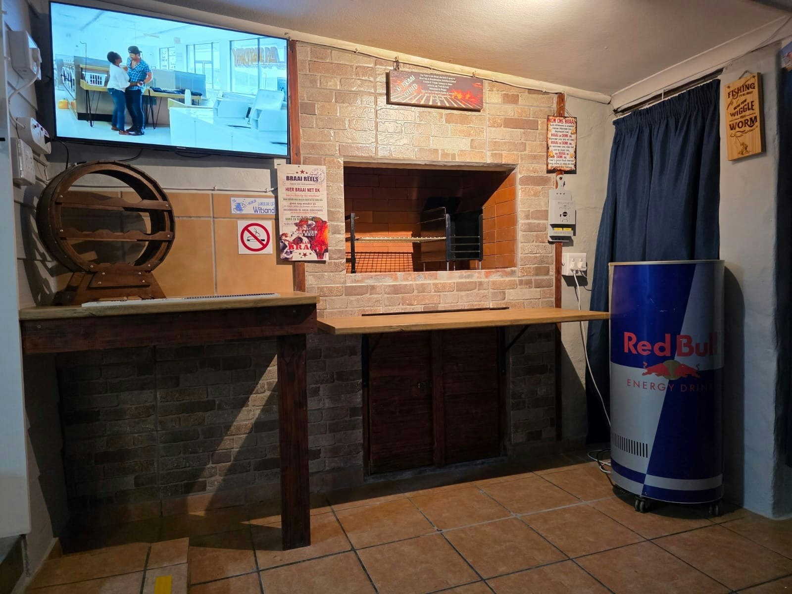 The open-plan living area features a fully equipped kitchen with a stove, oven, microwave, fridge-freezer, cutlery and crockery, as well as tea- and coffee-making facilities. A washing machine and a breakfast counter with stools are also available. The kitchen leads into a lounge with comfortable sofas and a wall-mounted TV. The house also boasts an entertainment area with an additional TV for streaming. Outside, there is a large portable braai with 6 plastic chairs for a relaxed get-together. Please note, while photos show an indoor braai, it is unfortunately not operational.