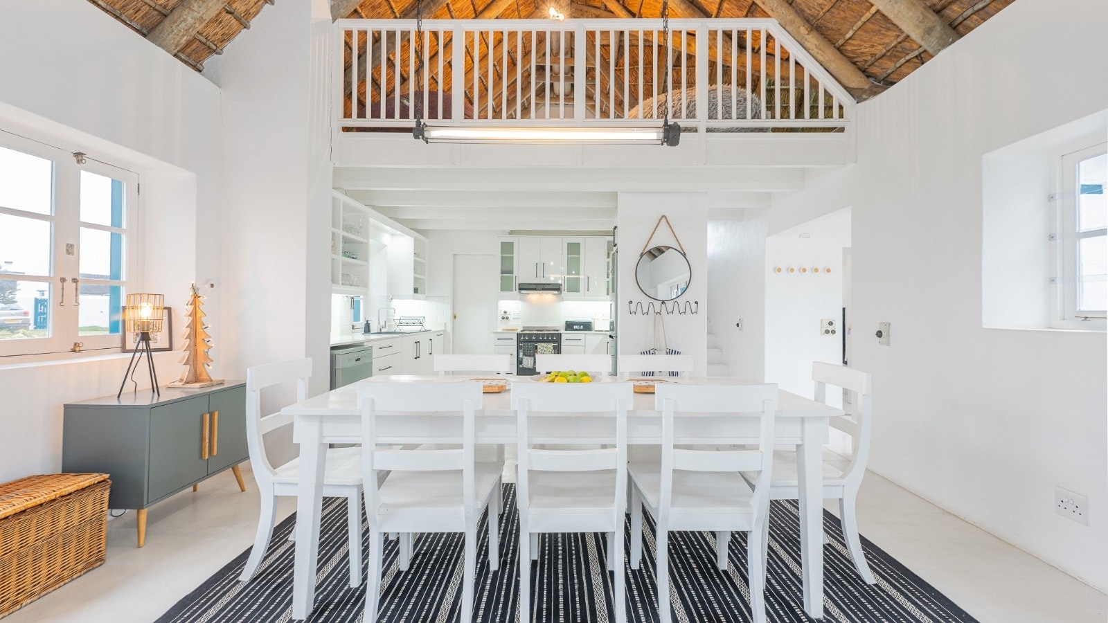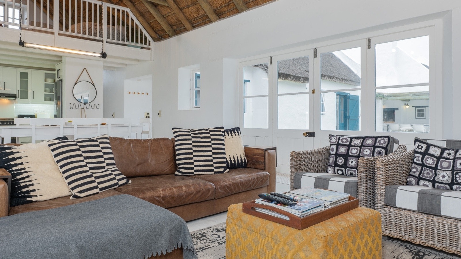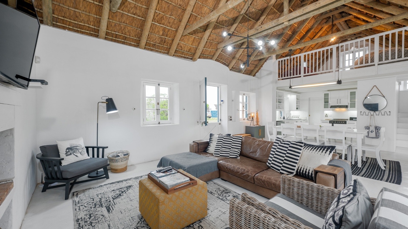Die oopplan-leefarea het 'n stylvolle kombuis wat met 'n gasstoof, elektriese oond, mikrogolf, yskas-vrieskas, eetgerei, breekware en 'n skottelgoedwasser toegerus is. Dit lei na die etenstafel met oorgenoeg sitplek. Die sitarea het gemaklike sitplek, 'n kaggel en platskerm-TV met DStv. Gratis WiFi is beskikbaar.
