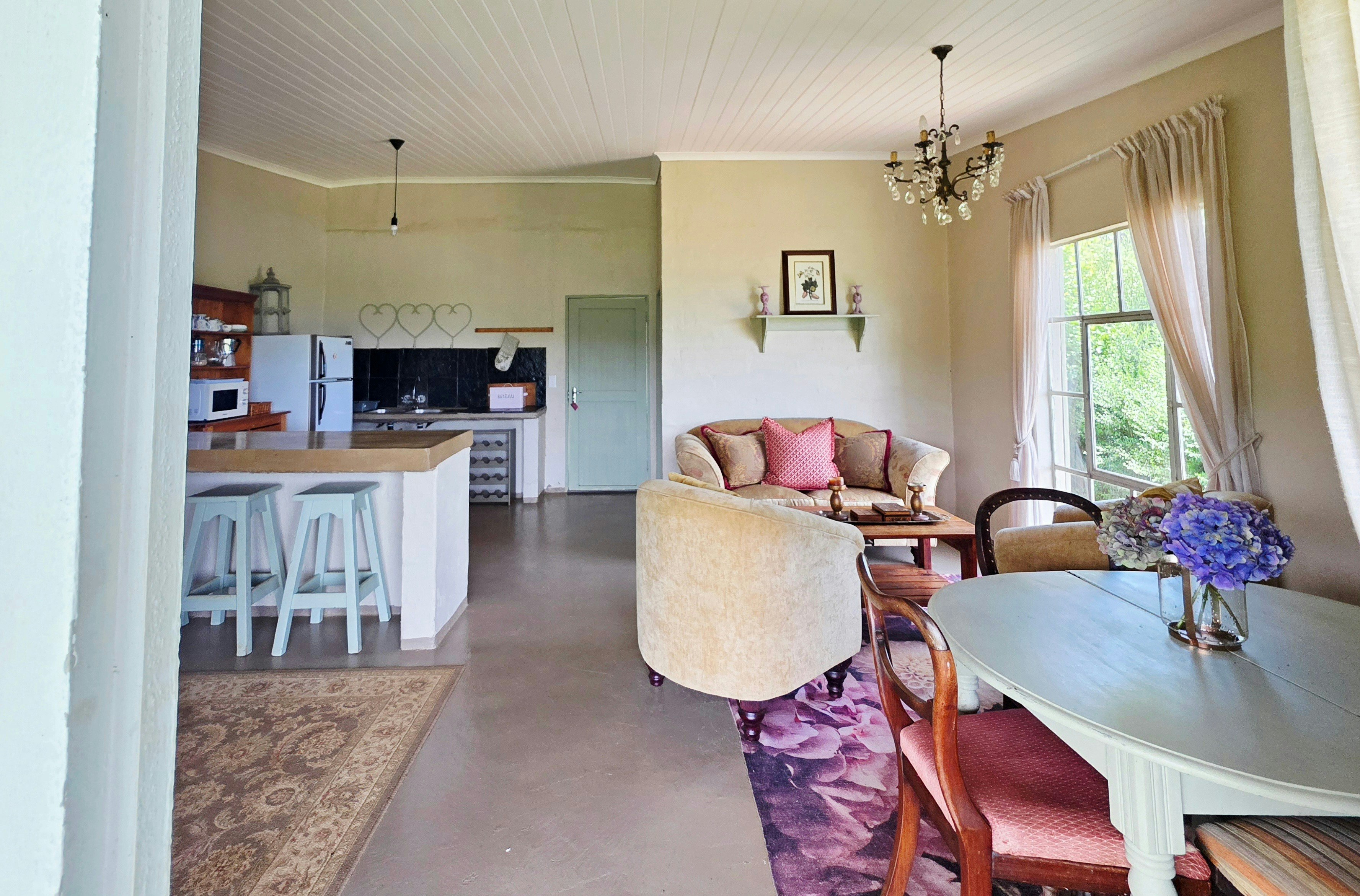 Die oopplan-leefarea sluit 'n kombuis in wat toegerus is met 'n tweeplaatstoof, oond, mikrogolfoond, yskas-vrieskas, ketel, eetgerei, breekware en gereedskap. 'n Ontbyttoonbank vloei in die sitkamer, wat gemaklike sitplek en 'n eetkamertafel vir vier bied, en maak oop na 'n stoep met uitsig oor 'n dam.