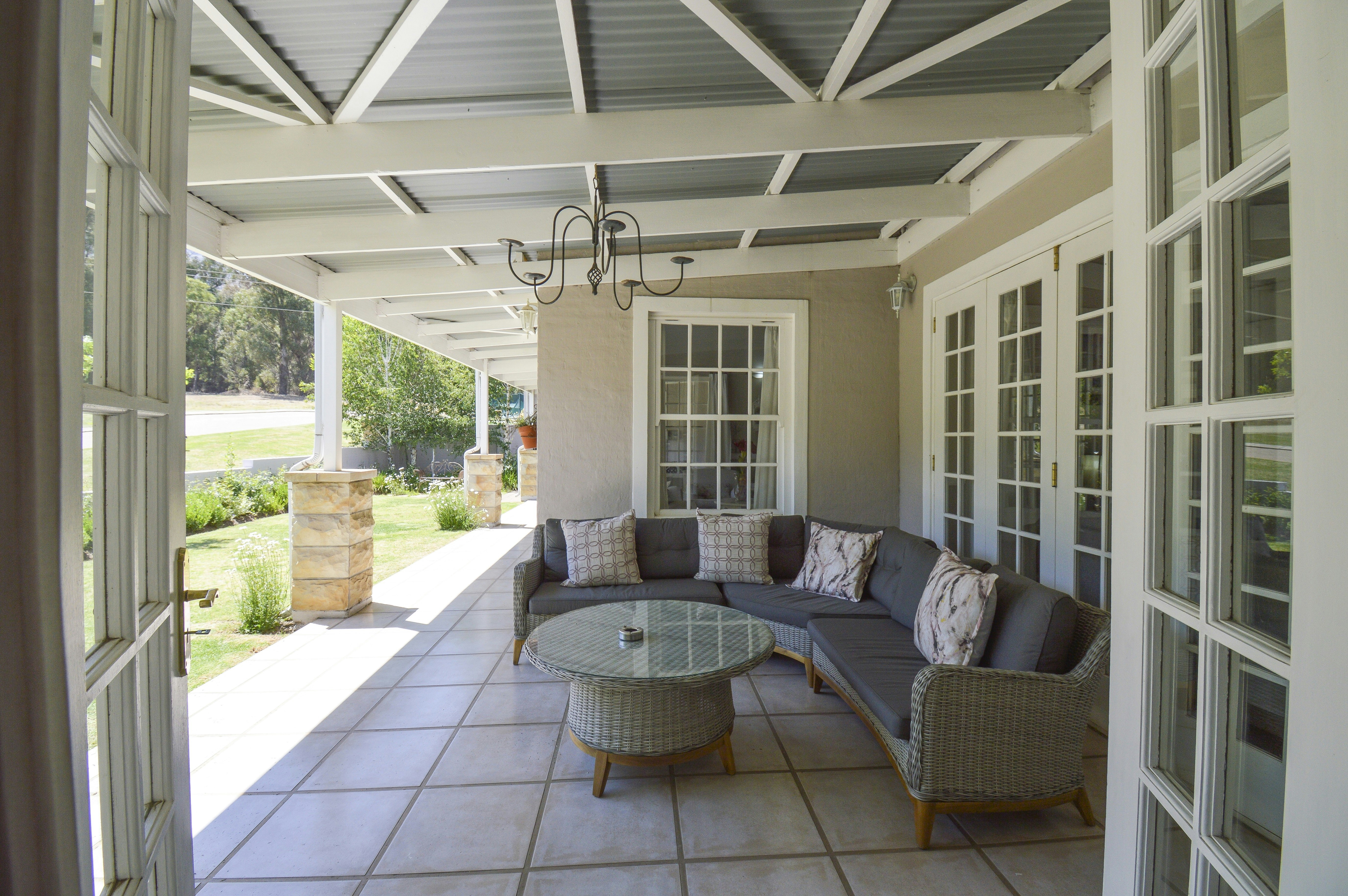 The living area leads to a covered patio with views of Mount Horeb. There is a large wood-burning fireplace in the lounge. Braai facilities are available, along with 2 covered parking bays and additional on-site parking. The house is fully furnished and serviced daily.