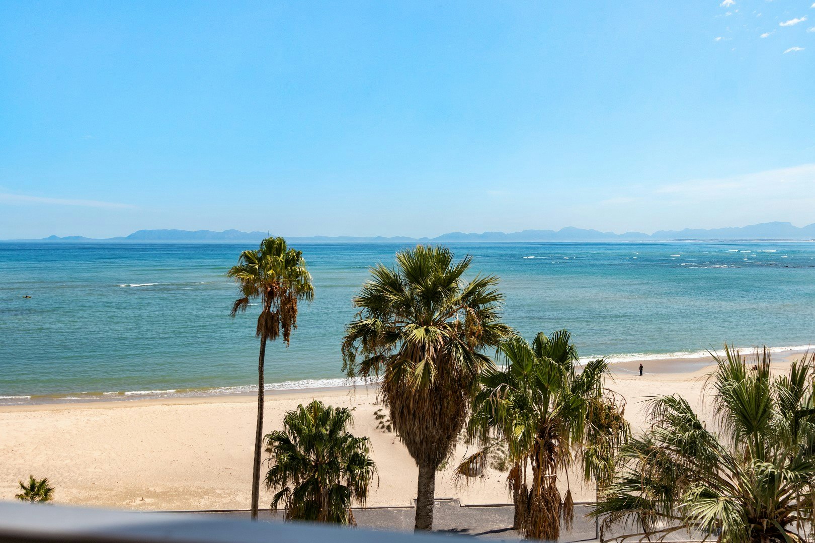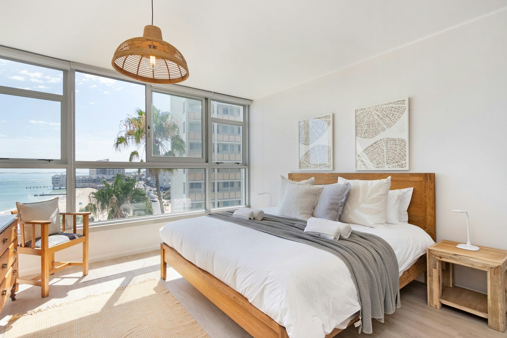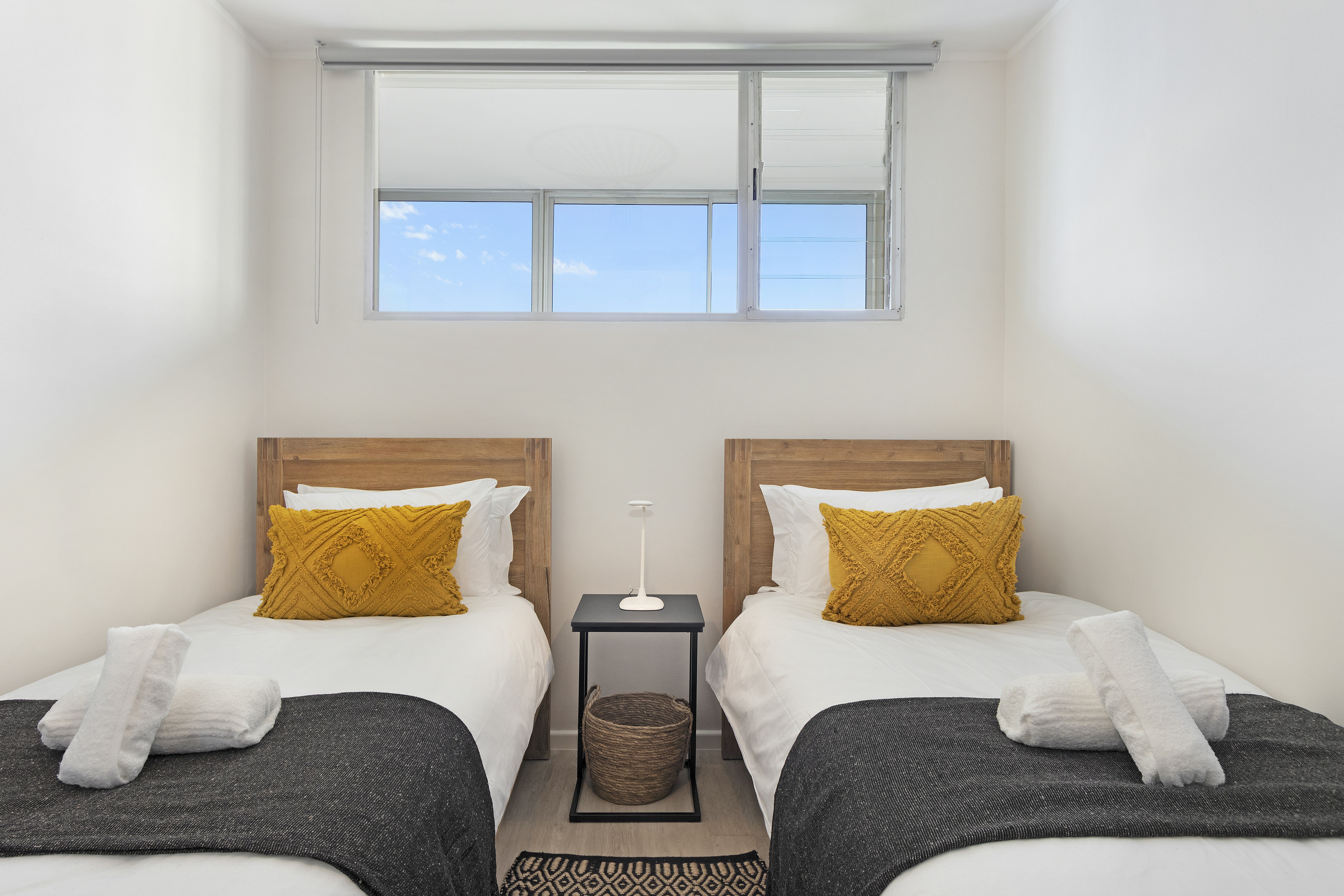 This bright and airy apartment can accommodate 4 guests at a time and comprises 2 bedrooms and a bathroom. The main bedroom has lovely ocean views and is furnished with a king-size bed, while the second bedroom contains 2 single beds. A shower, washbasin and toilet are available in the bathroom. Crisp white linen and bath towels are provided; however, guests are required to bring their own beach towels.
