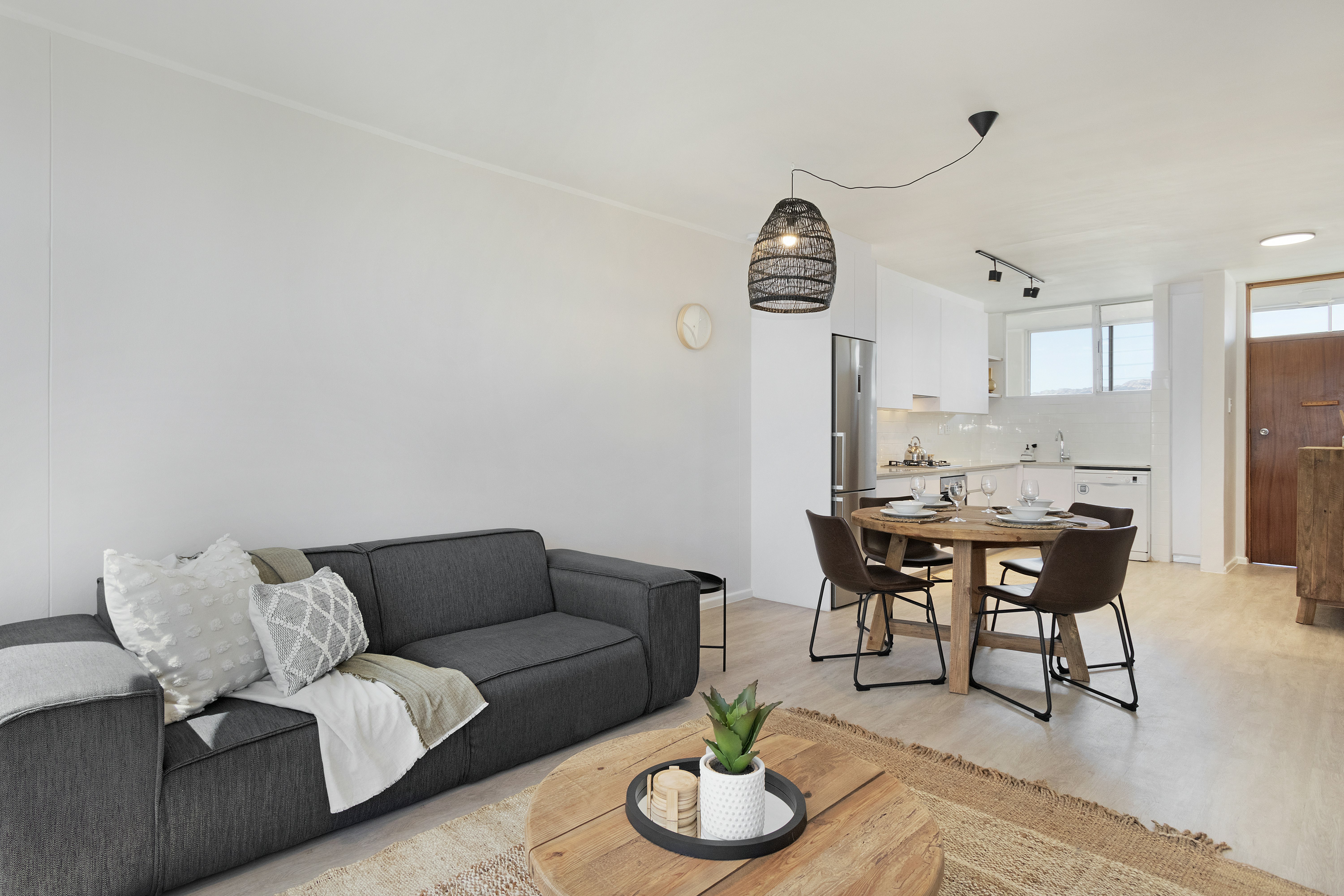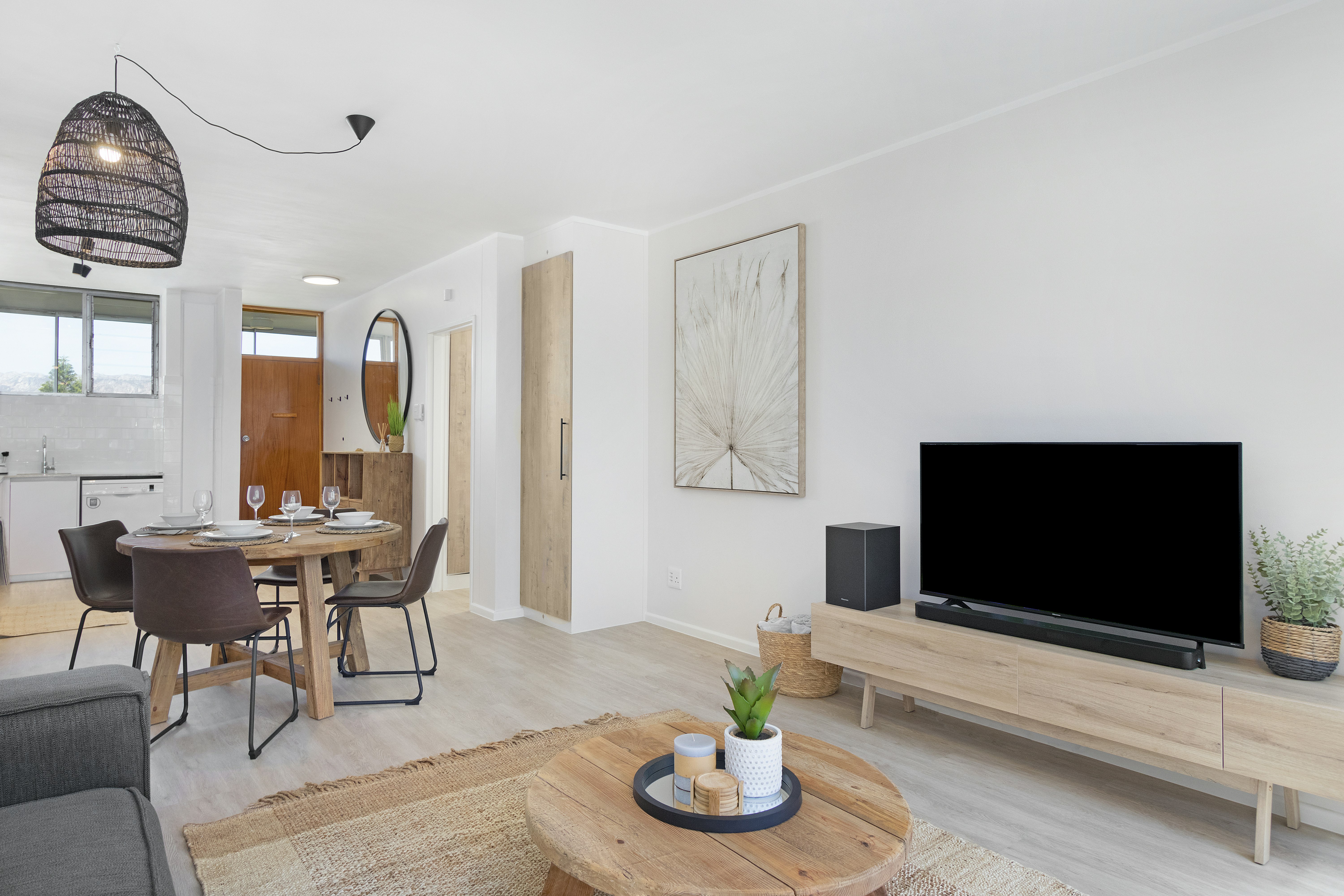 The open-plan living area features a stylish kitchen fully equipped with a gas stove, electric oven, microwave, fridge-freezer, cutlery and crockery as well as a dishwasher. Leading from the kitchen is a 4-seater dining table where guests can enjoy their meals together. The lounge has comfy seating and a TV. Complimentary Wi-Fi is available. This lounge has large windows that guests can open up and let the ocean air in.