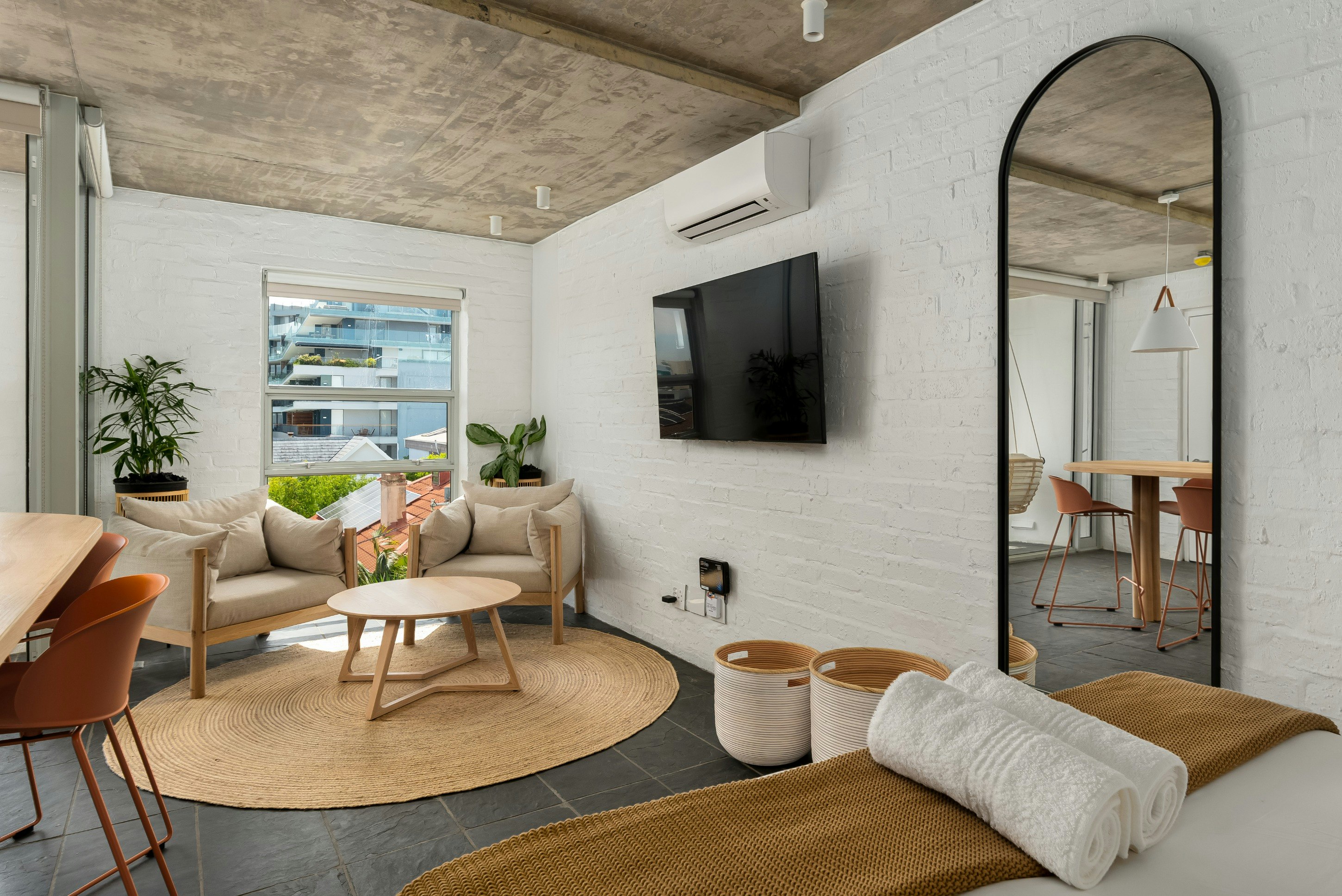 Through the sliding doors, guests can enjoy a morning coffee on the balcony. For those wanting to explore the area, the apartment is within walking distance of restaurants, cafés, shops and the beach.