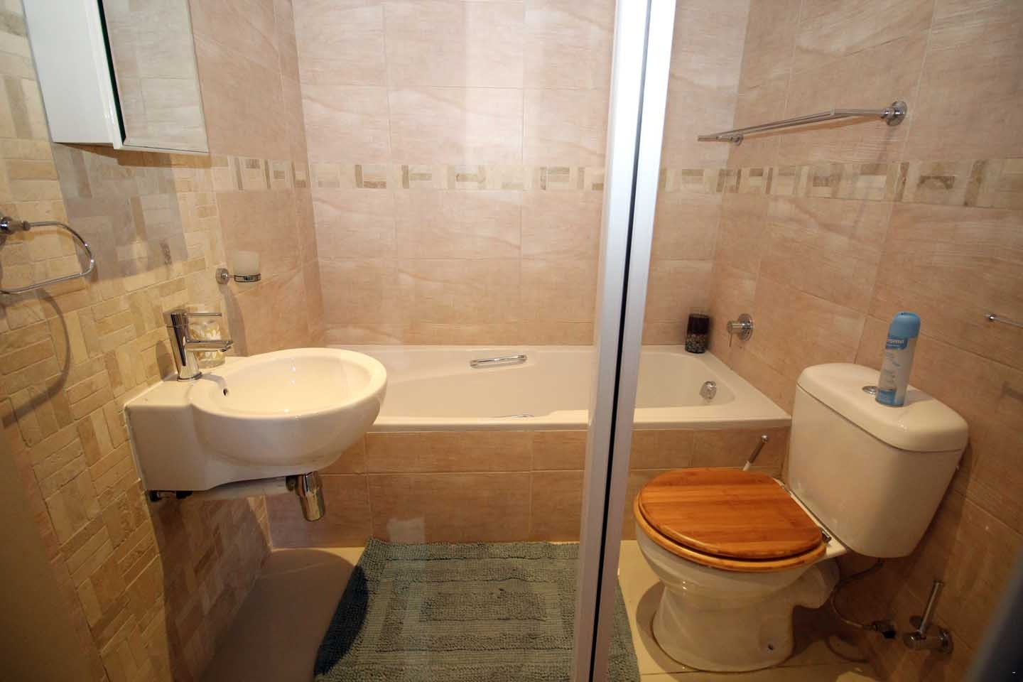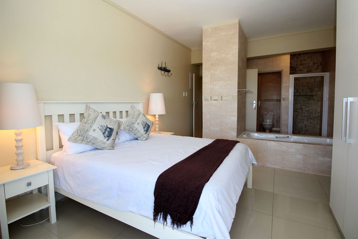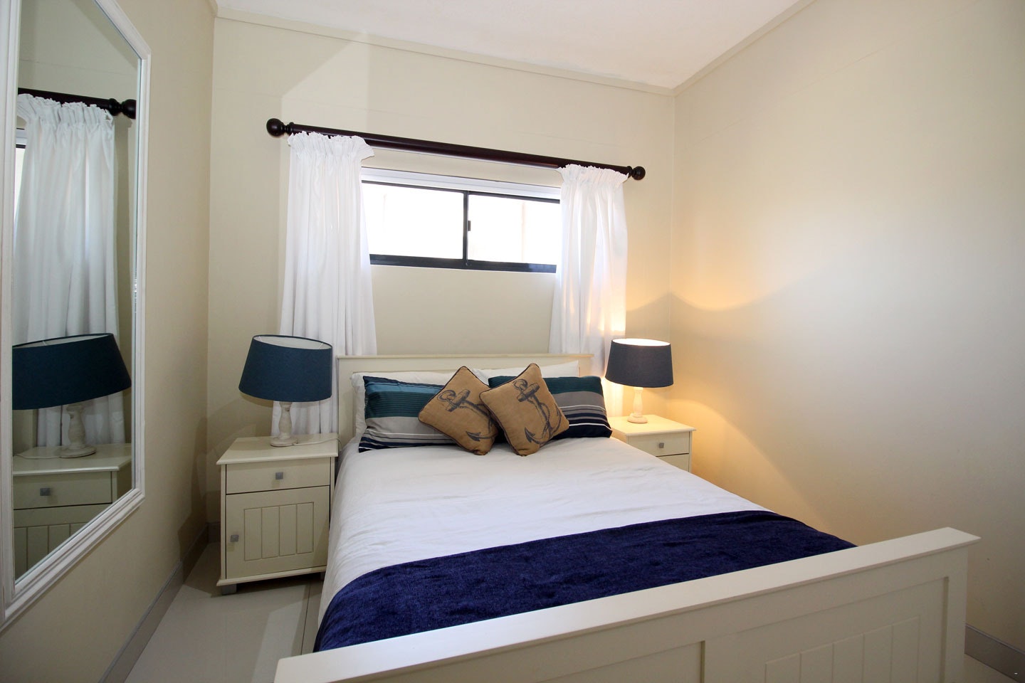 This 3-bedroom, 2-bathroom self-catering apartment accommodates up to 6 guests. The main bedroom has a double bed and an open-plan en-suite bathroom with a bath and shower, separated by a portable divider for privacy. The second bedroom also has a double bed, while the third bedroom offers 2 single beds. The second bathroom includes both a bath and a shower. Each bedroom has a standing fan to keep guests cool on warm coastal nights.