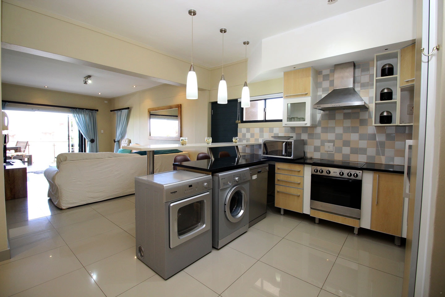 The kitchen is fully equipped for a comfortable stay, and the open-plan lounge and dining area lead to a patio, perfect for relaxing or enjoying a braai. The kitchen is fully equipped for self-catering and contains a stove, oven, fridge-freezer, microwave, cutlery, and crockery. The apartment includes Wi-Fi and a Smart TV with Netflix for entertainment.