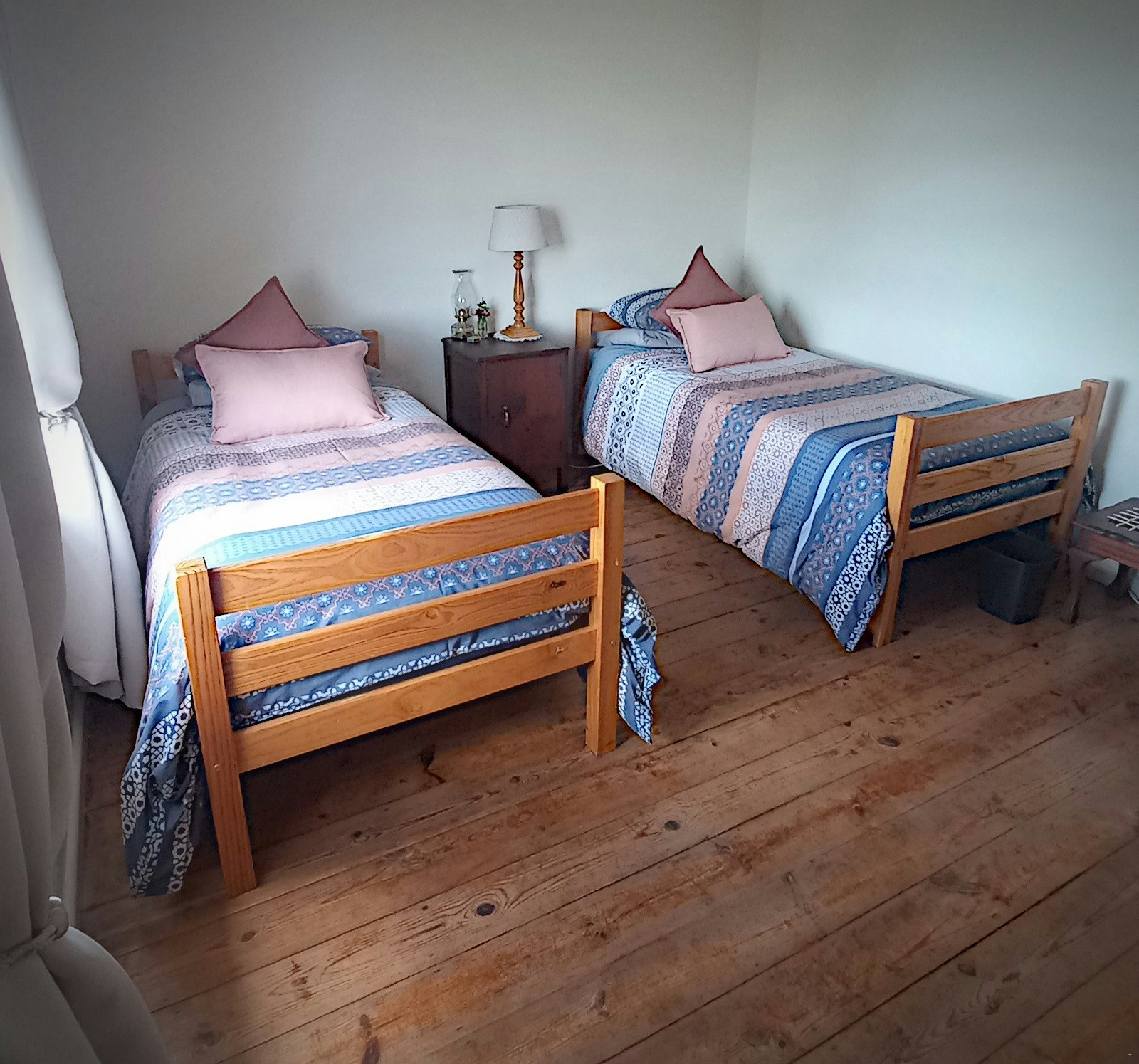 The Farm Cottage has 3 bedrooms. One room has a double bed, and the other two each have two single beds. The rooms share a bathroom with a bath. The kitchen is fully equipped for self-catering, and the lounge features a fireplace. Pets are welcome by prior arrangement.