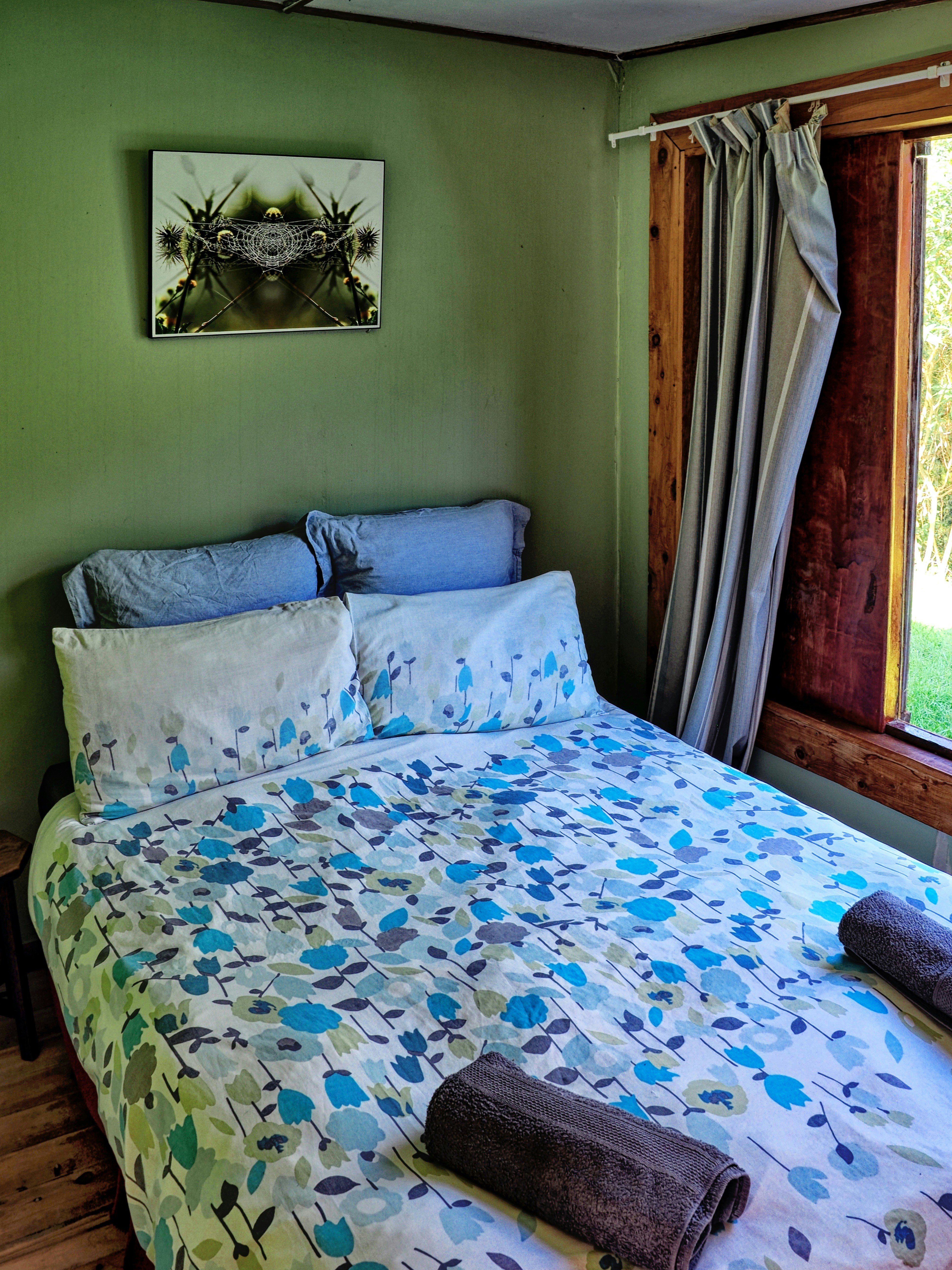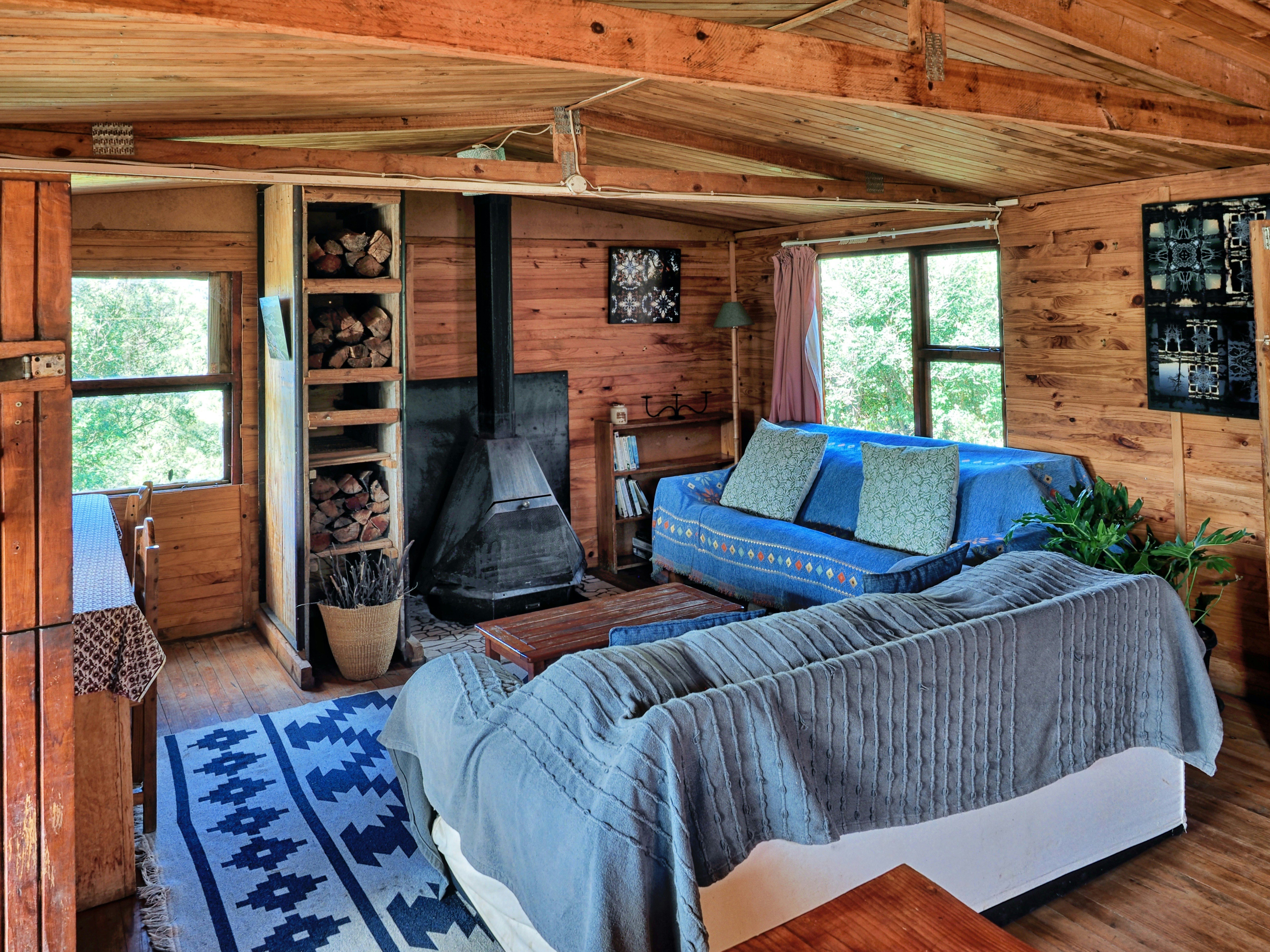 The eco-cabin is a self-catering, 3-bedroom home that is equipped with basic amenities including a fridge, gas oven and stovetop, pots, pans and crockery. On the cooler days, guests can relax on comfortable couches by the fireplace and when the sun is shining enjoy the day bed on the spacious deck where you will experience breathtaking mountain views. There is also a large bonfire pit where guests can braai.