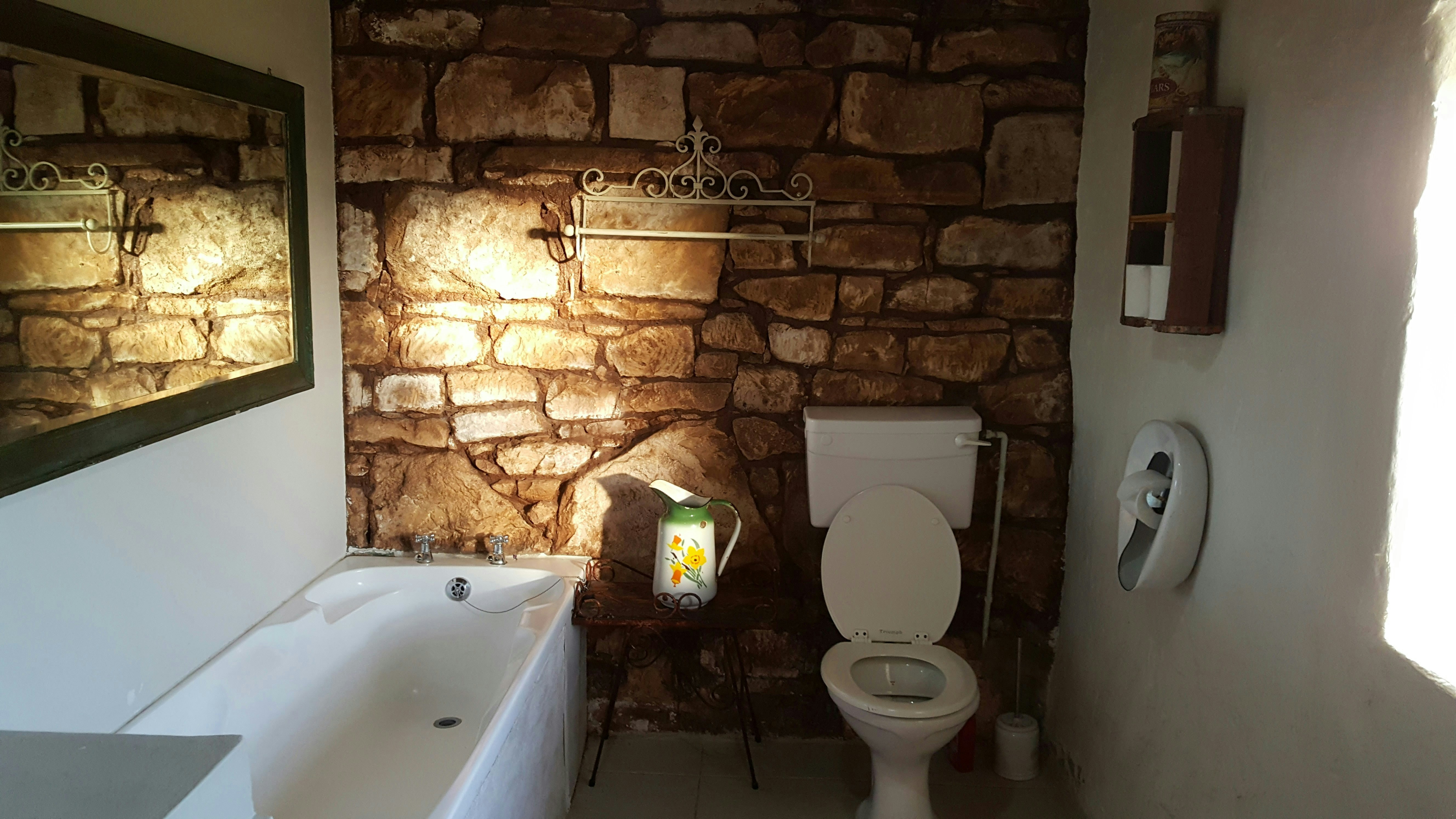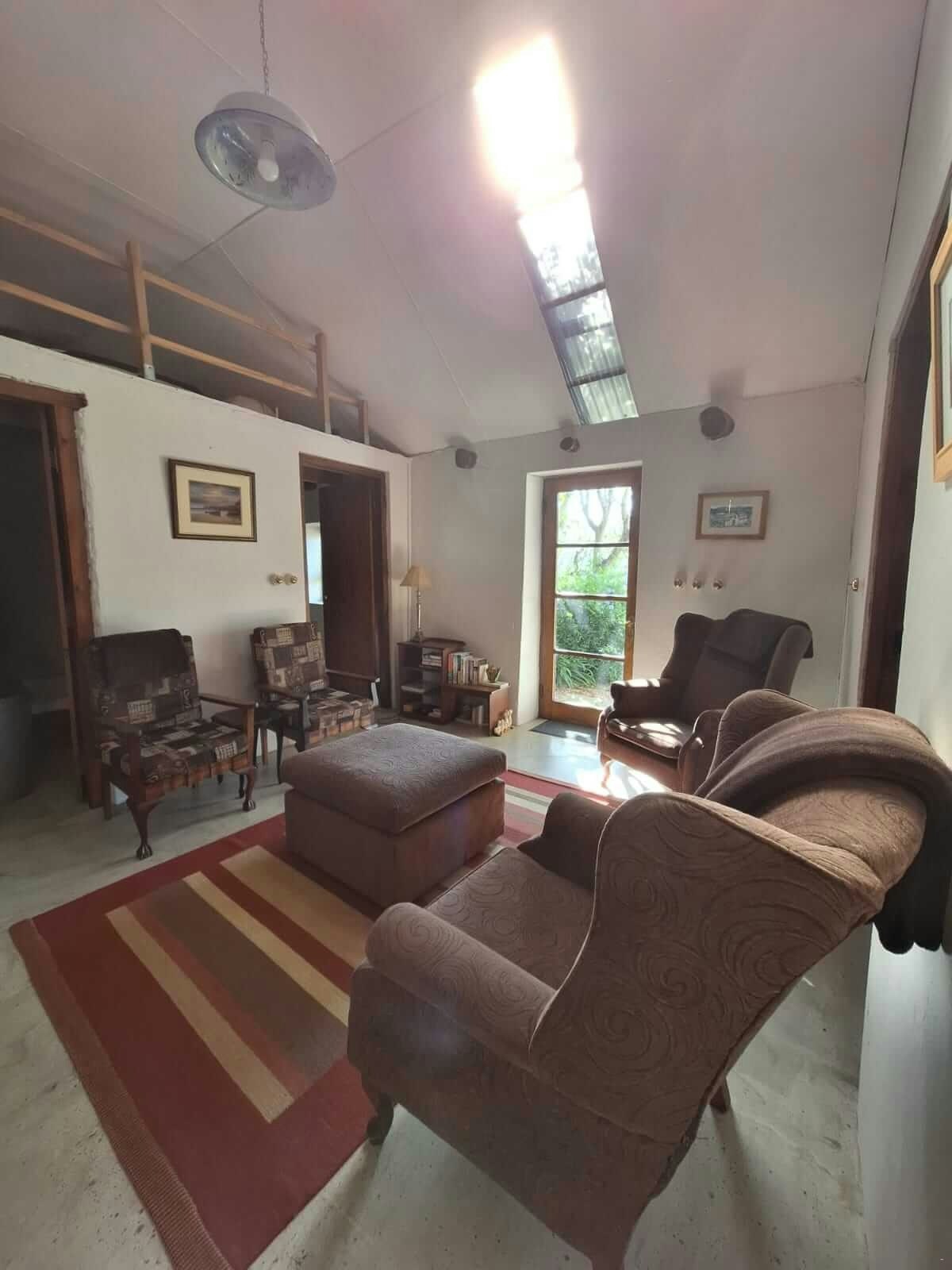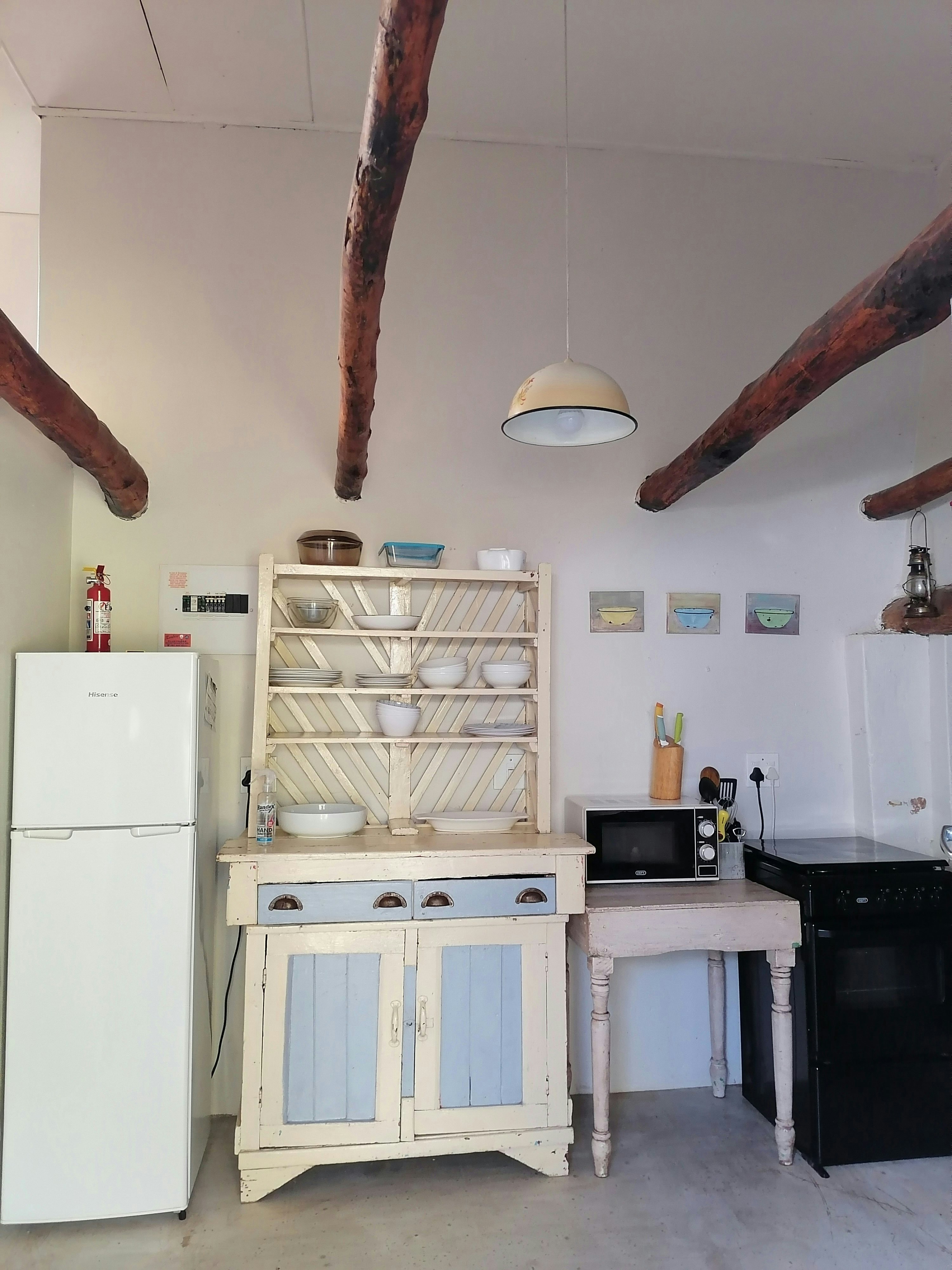 The kitchen is fully equipped for self-catering and includes a stove, oven, fridge, microwave, cutlery, and crockery. The cottage features an indoor fireplace for the winter months. Highlights include a hot outdoor shower under milkwood trees. The spacious verandah is ideal for relaxing and enjoying sundowners and a braai.