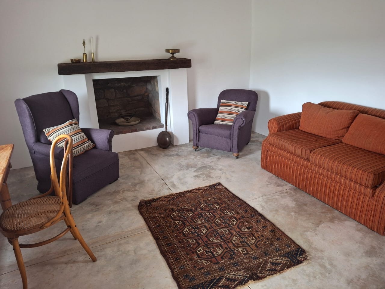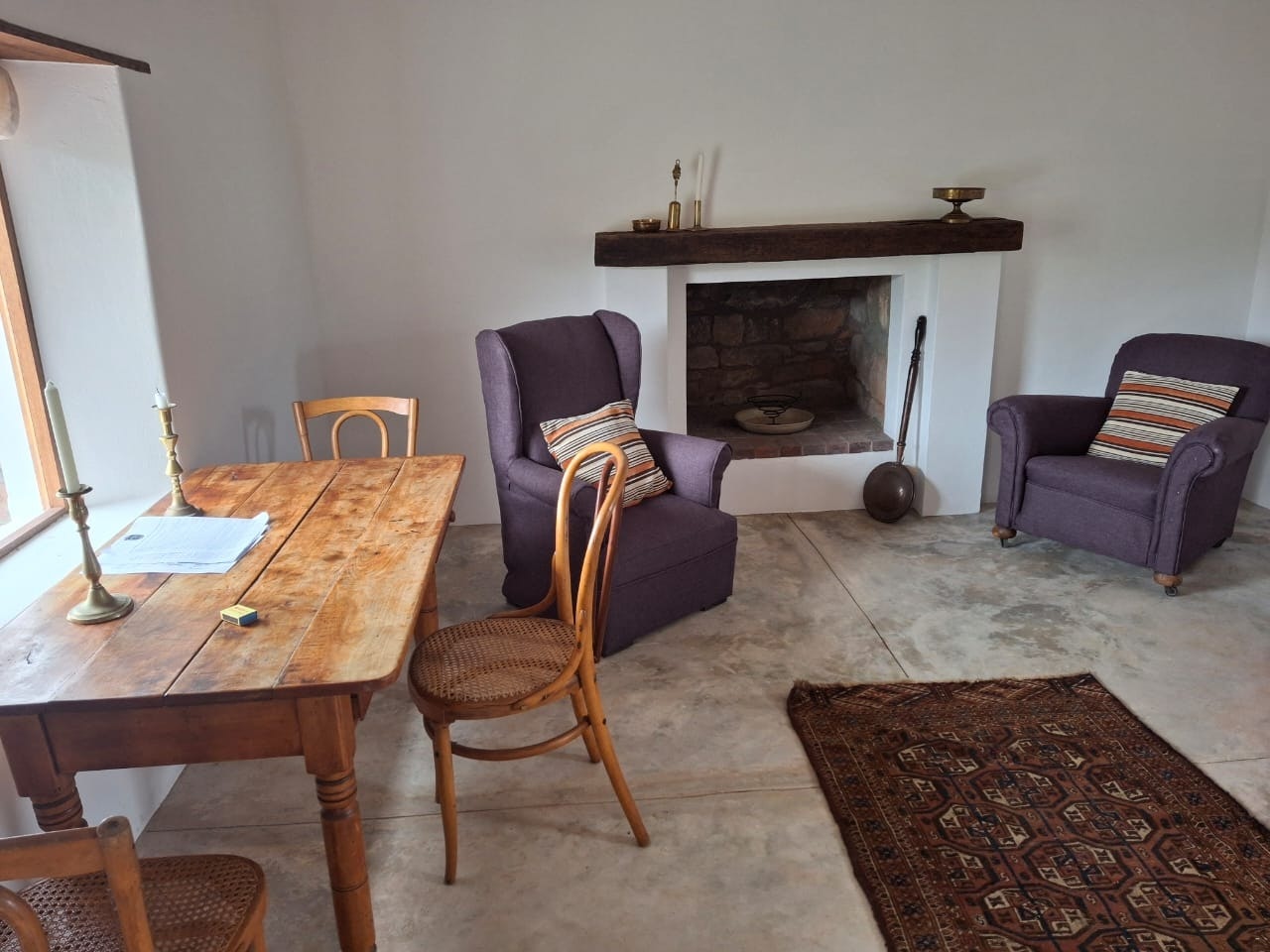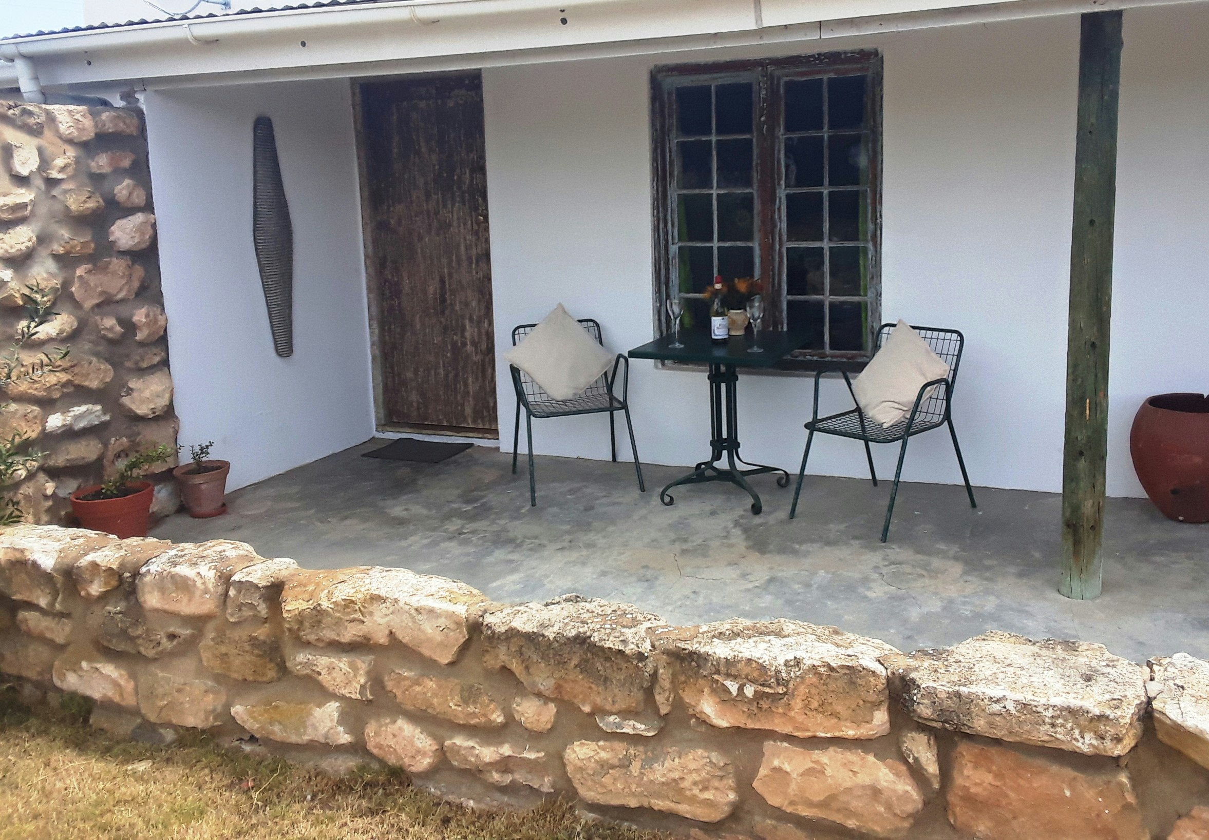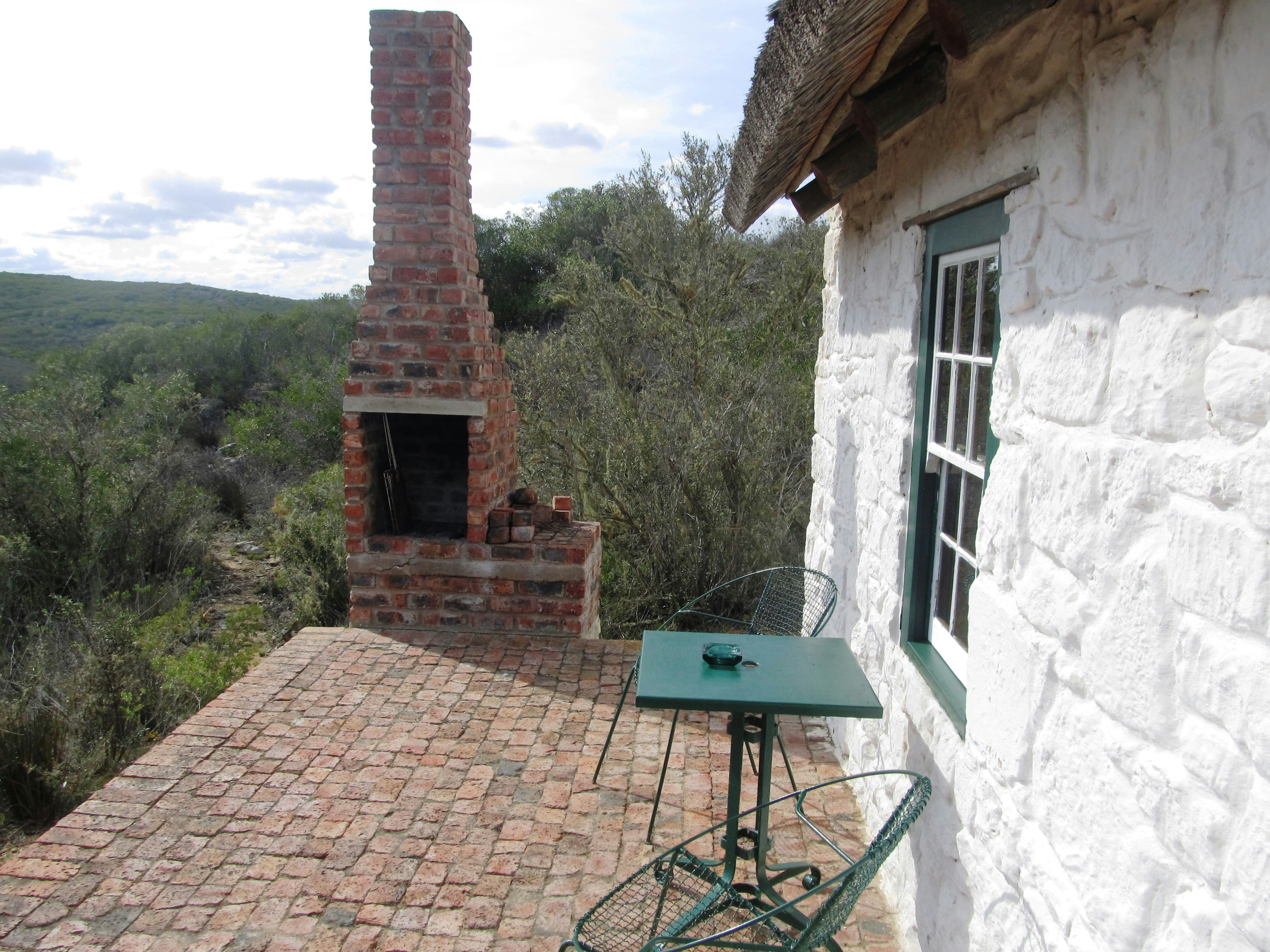 This traditional Cape style cottage has a living area with a kitchen including hob; dining table; comfortable sitting chairs and open fireplace. Electric fridge some distance away. There is no electricity, but gas water heating, and hob, and candles and oil lamps are supplied for lighting. There is a single bed in the living area. There is a double bed and single bed in the bedroom with an en suite bathroom with shower and toilet. The verandah has lovely views and a built in braai. Nature hiking trails are on the reserve.