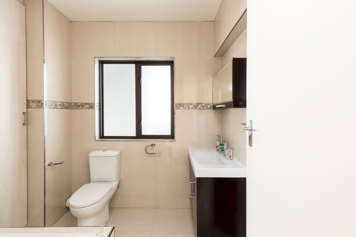 This fourth-floor apartment can accommodate 6 guests and comprises 3 bedrooms, 2 bathrooms, and an open-plan living area. The main bedroom is furnished with a queen-size bed and features an en-suite bathroom fitted with a shower, washbasin, and toilet. The second bedroom is equipped with a queen-size bed, and the third bedroom has 2 single beds; these 2 rooms share the second bathroom, fitted with a shower-over-bath. All bedrooms have views of the Atlantic Ocean.