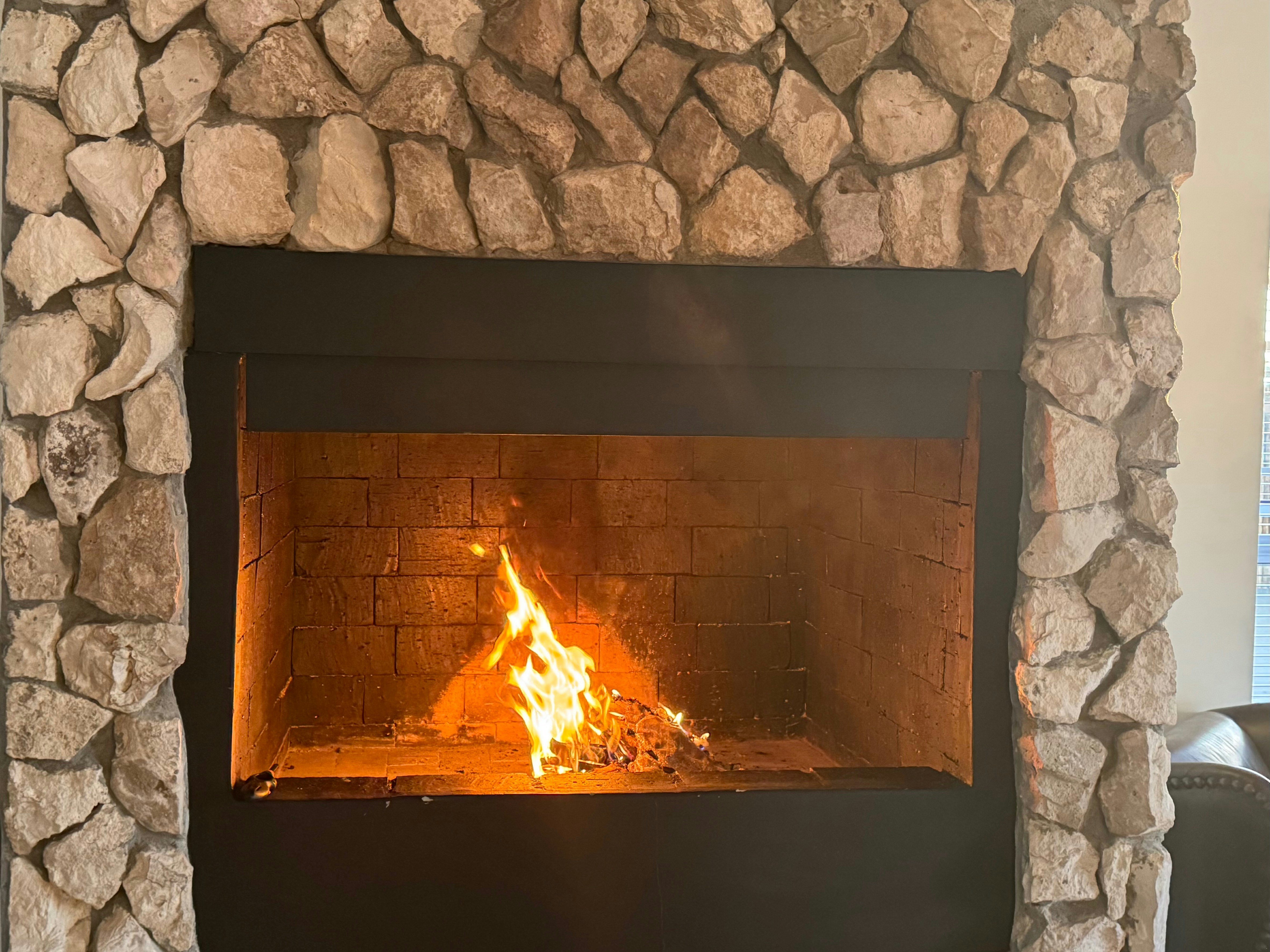 A fully equipped kitchen is provided for self-catering and includes a gas hob, oven, microwave, air fryer, coffee machine, dishwasher, fridge-freezer, and all essential cooking utensils. A tumble dryer is also available. The open-plan living area is furnished with comfortable seating, a smart TV with streaming services, a six-seater dining table, and a built-in fireplace (for heating purposes only). Free high-speed Wi-Fi is provided, and a selection of board games and reading materials is available.