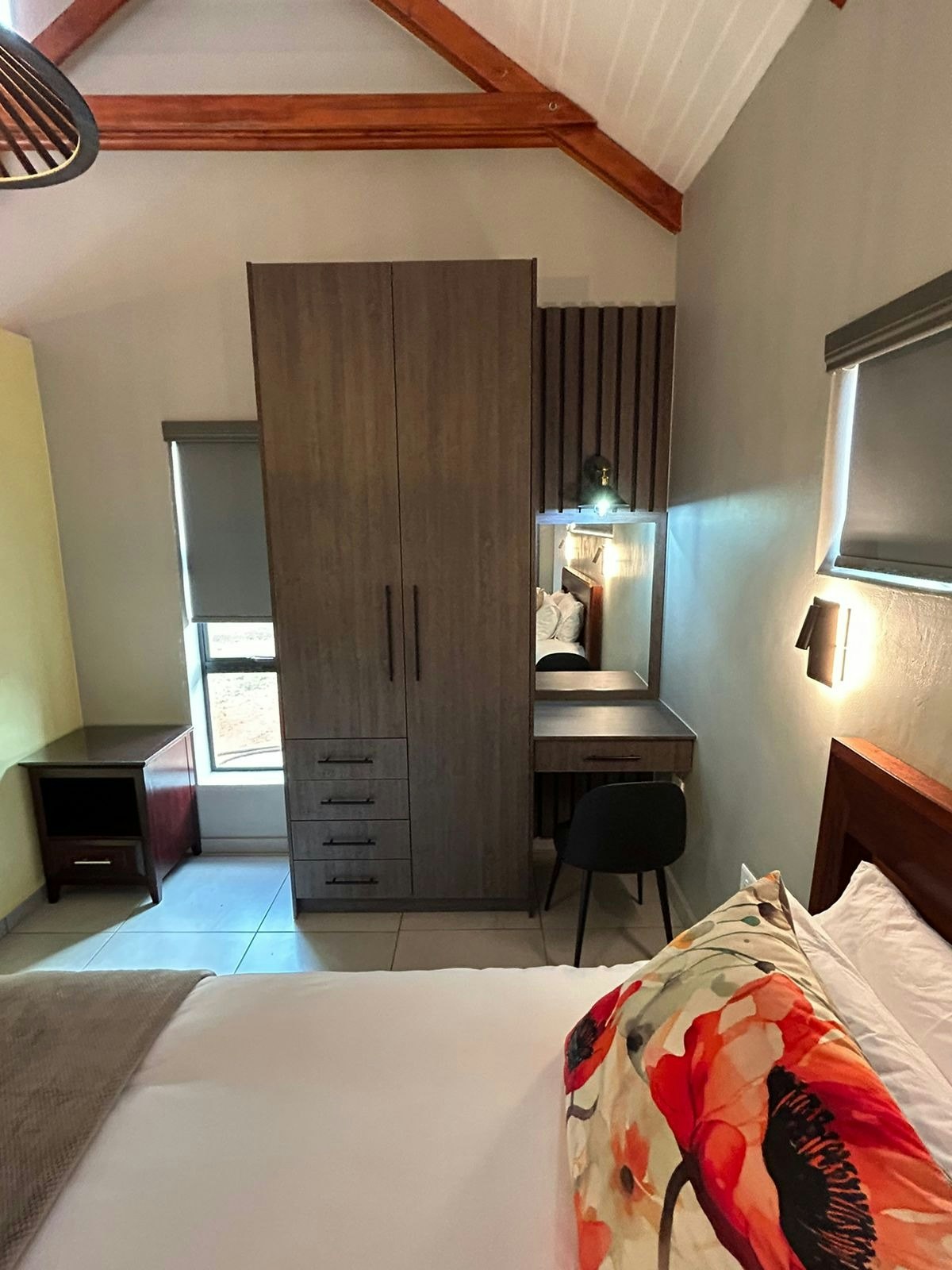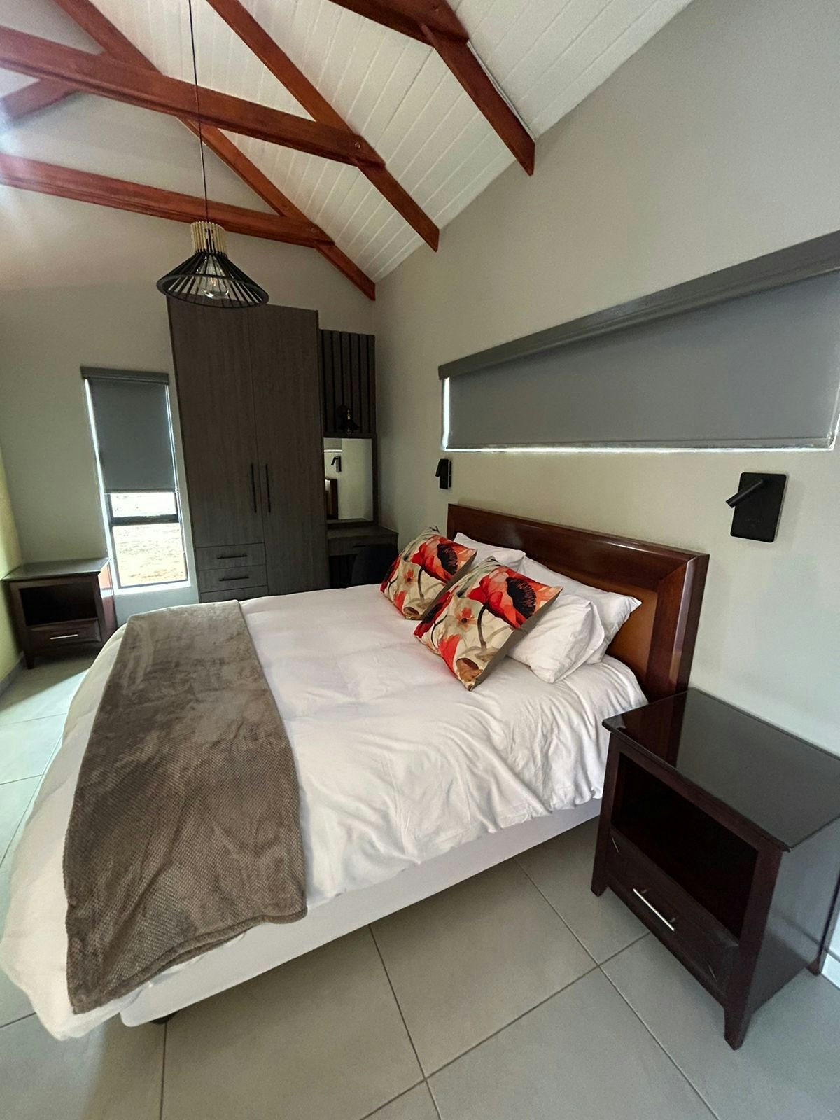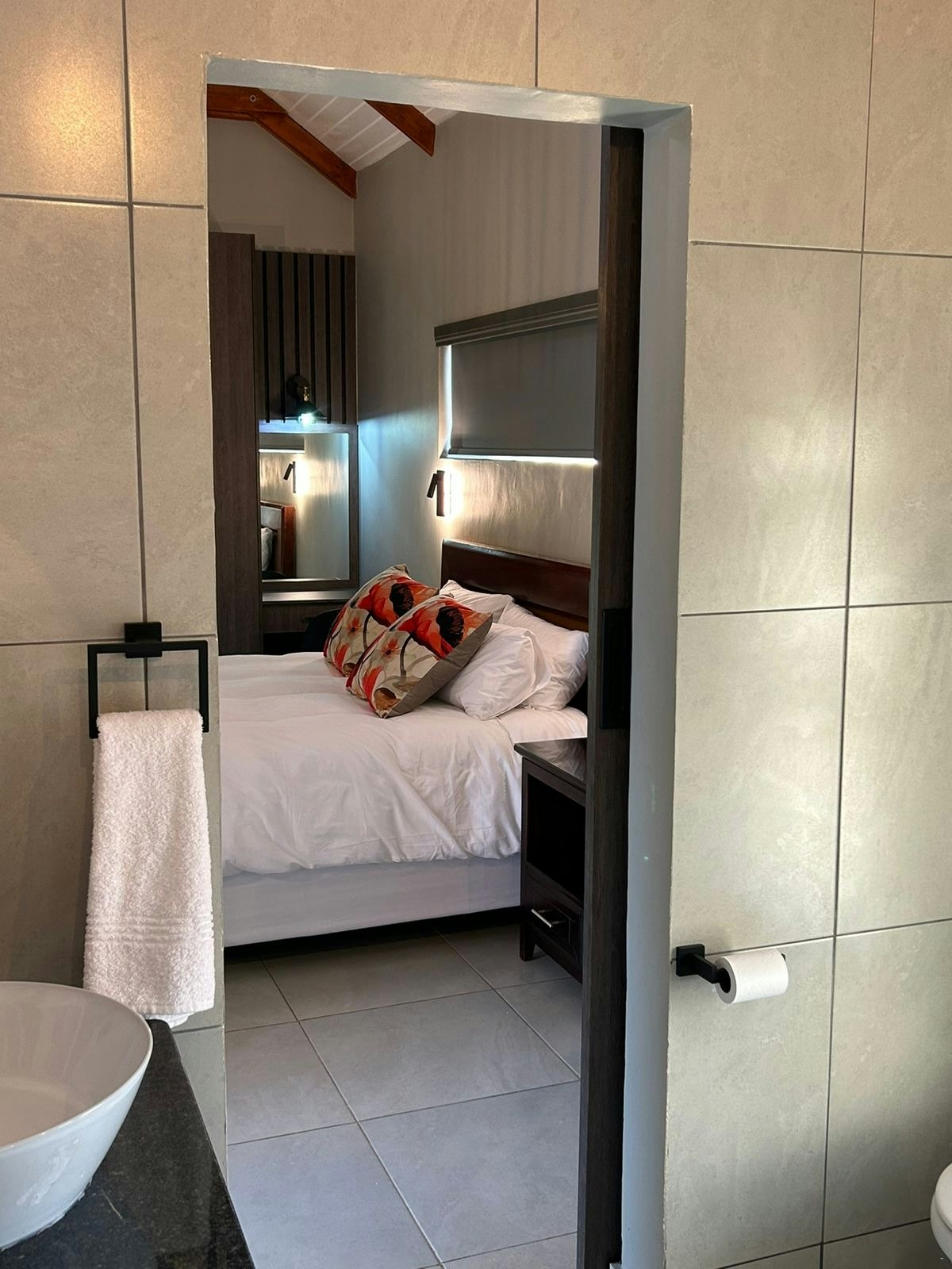 Die ruim slaapkamer is gemeubileer met 'n koningingrootte bed, terwyl die leefarea op versoek met 2 enkelbeddens toegerus kan word om 'n ekstra 2 gaste te akkommodeer. Die badkamer is toegerus met 'n stort, toilet en wasbak.
