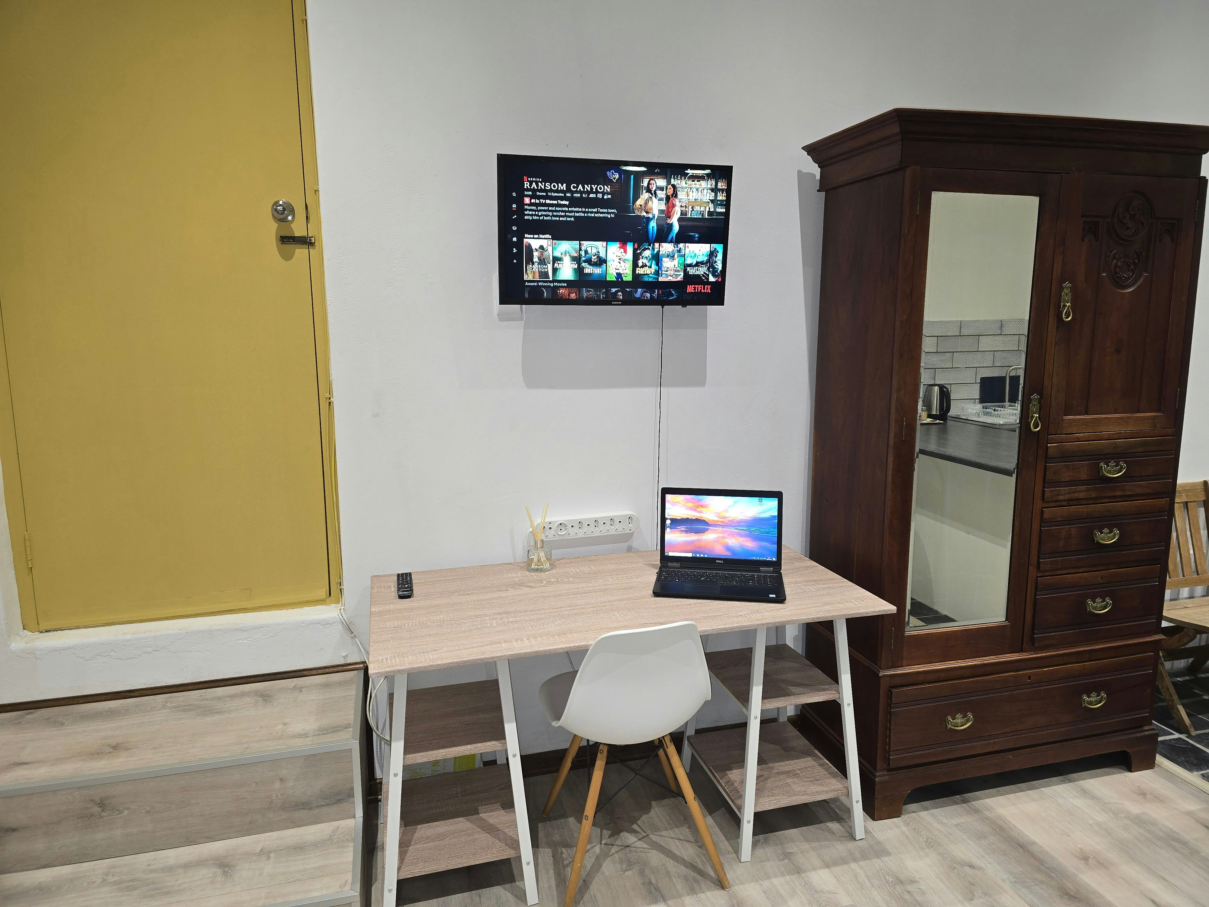 The unit includes a workstation and a smart TV with streaming services and DStv. The kitchenette is equipped with a bar fridge, microwave, toaster, and tea-and-coffee-making facilities.