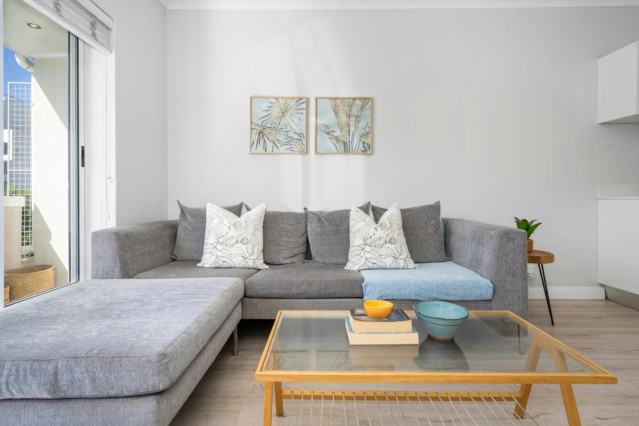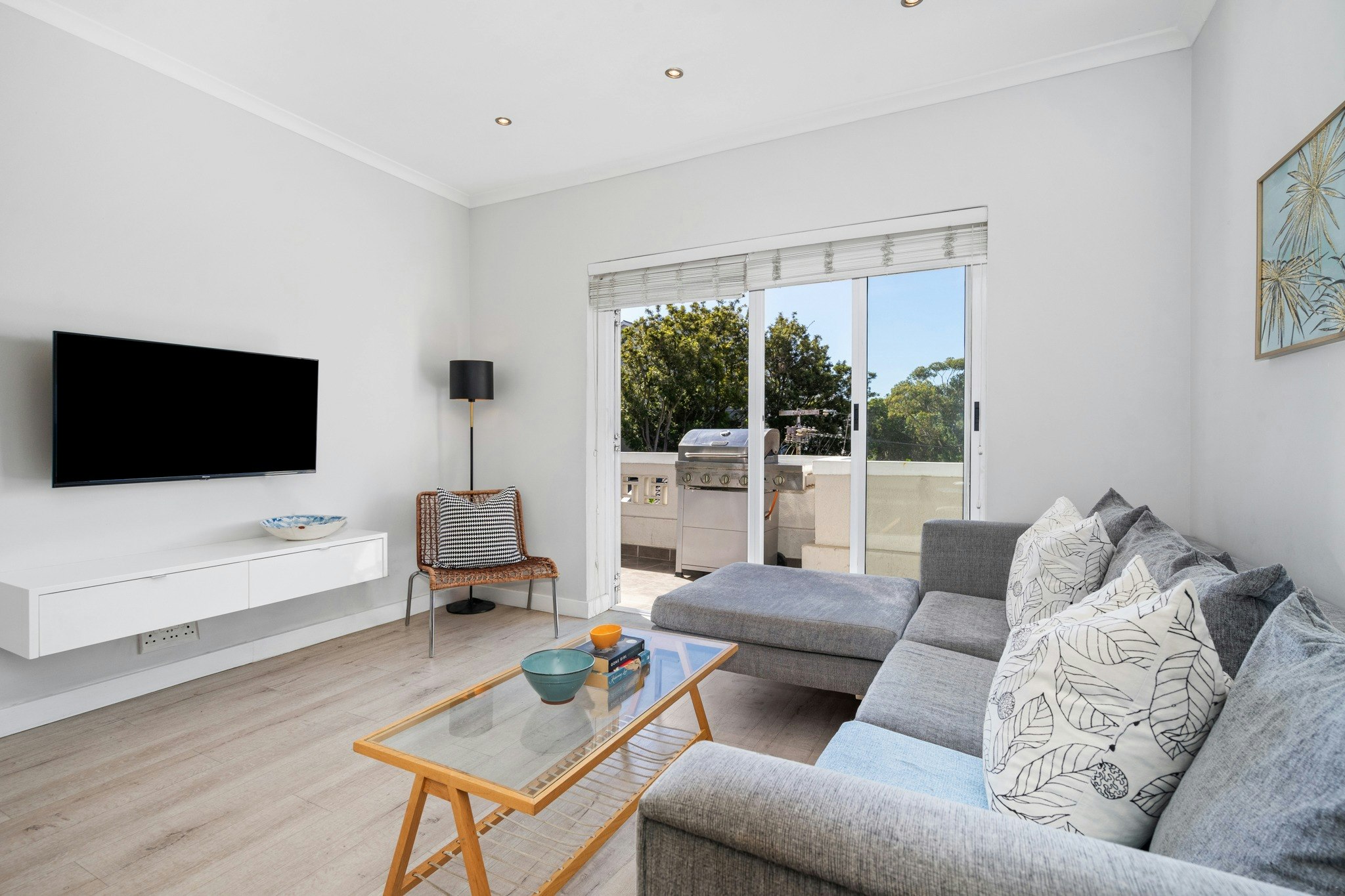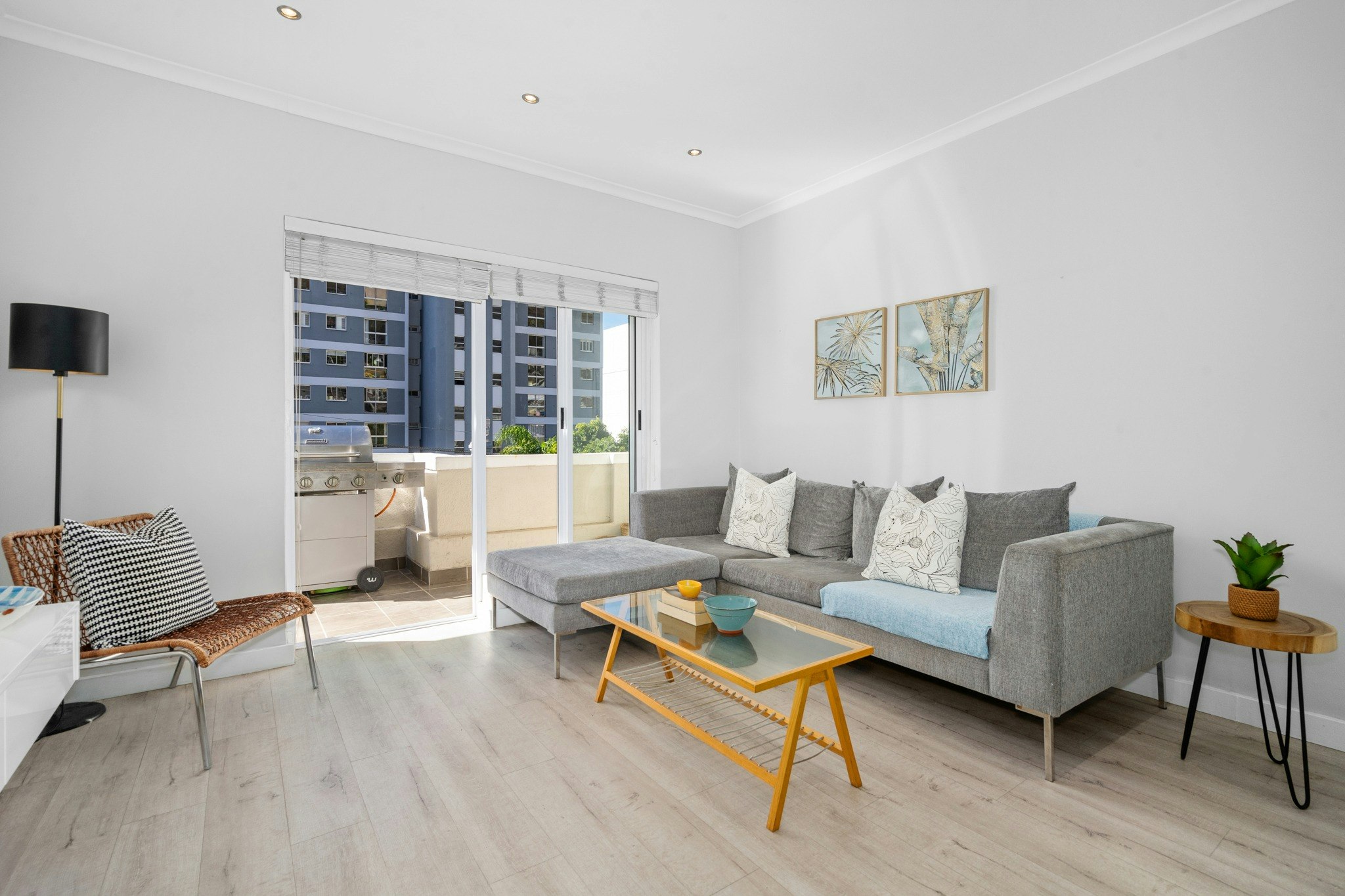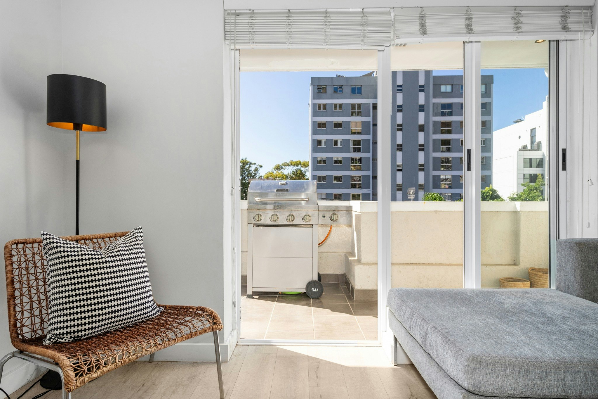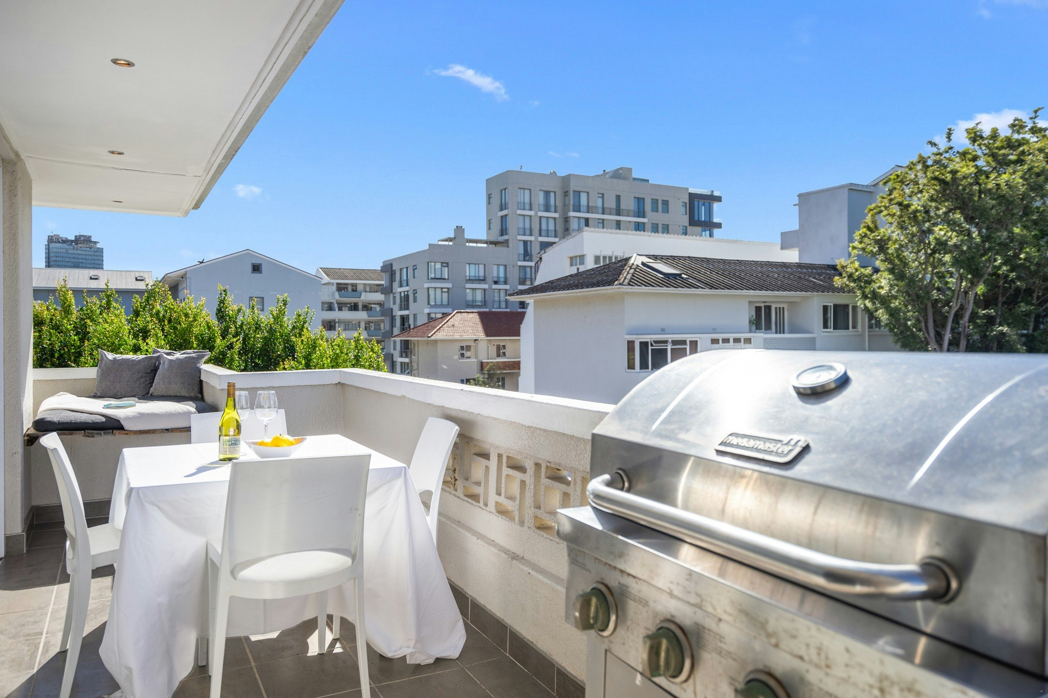 The living area opens onto a balcony with outdoor seating and a gas braai, ideal for morning coffee or evening sunsets. Nearby, guests can enjoy a picnic in Green Point Park, catch sports events or concerts at Cape Town Stadium, visit the historic Green Point Lighthouse, explore the V&A Waterfront, or take a trip up Table Mountain.