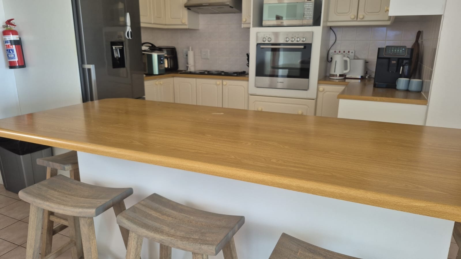 The fully equipped kitchen features a fridge-freezer, oven, stove, microwave, kettle, toaster, tea and coffee facilities, tumble dryer and a washing machine and a dish washer. There is a dining table with seating for 6. The open-plan living area includes a lounge with a couch and a smart TV with Netflix, ShowMax and DStv. Additional amenities include Wi-Fi.