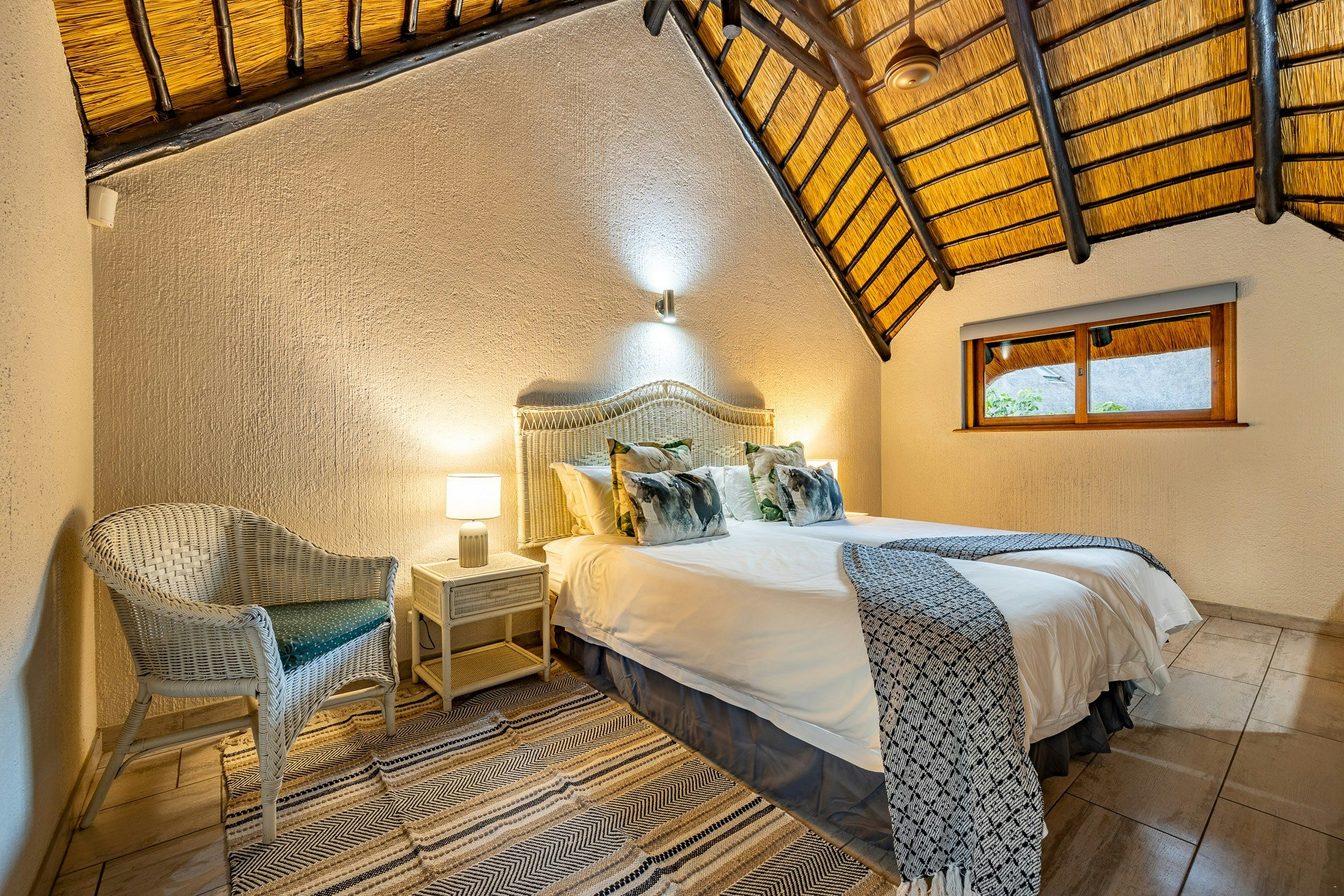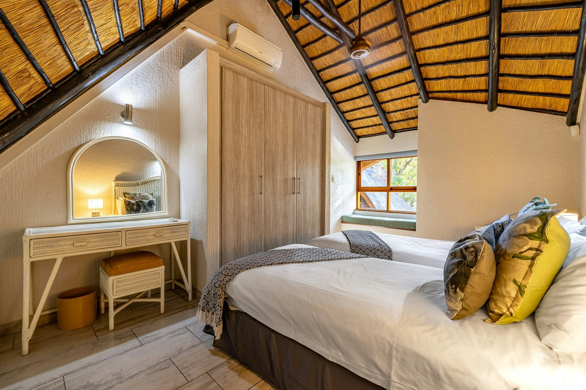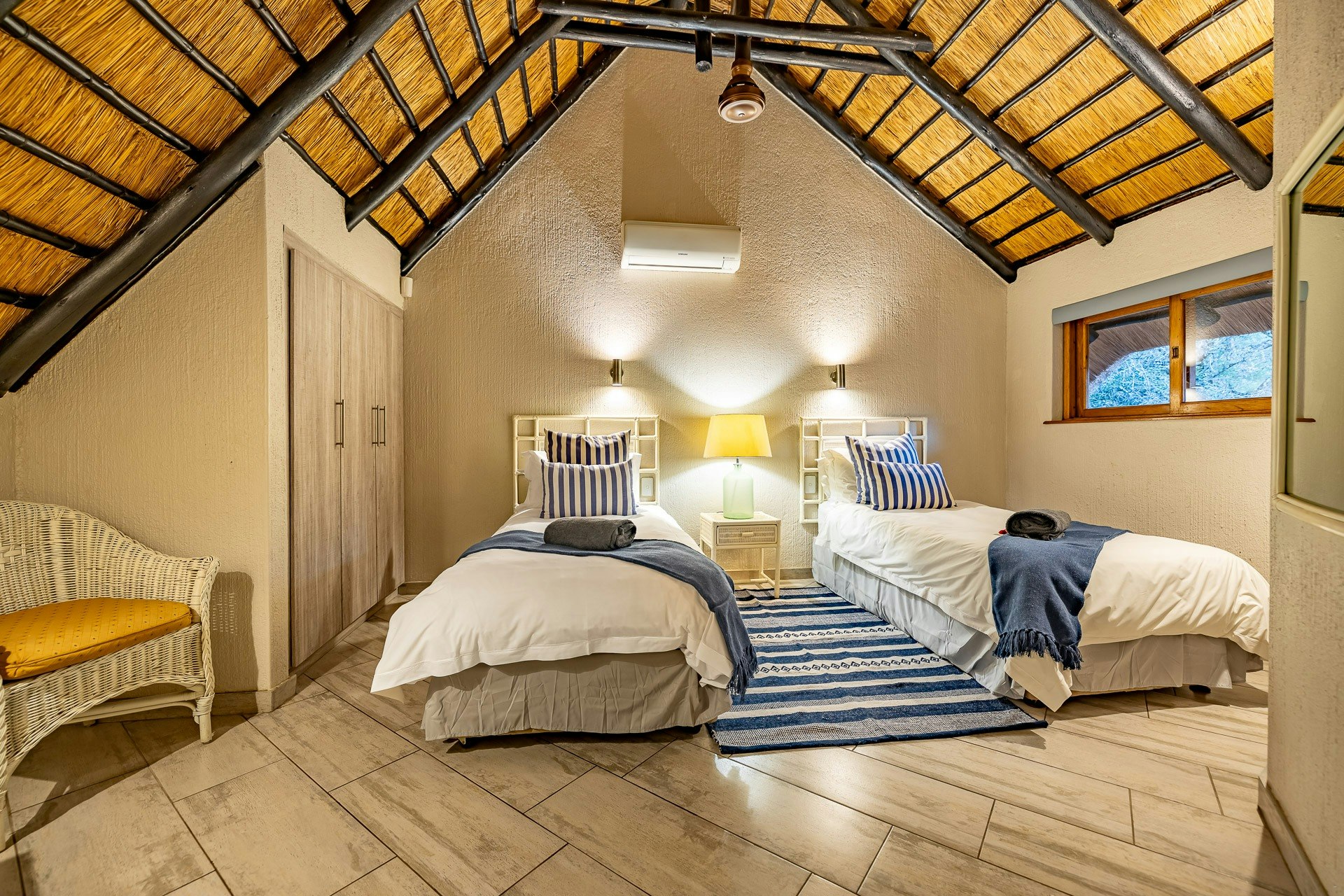 This double-storey lodge comprises 3 air-conditioned bedrooms, 2 bathrooms, and an open-plan living area. All the bedrooms are located upstairs; the main bedroom is furnished with a king-size bed and features an en-suite bathroom fitted with a toilet, basin, bath, and shower. The second and third bedrooms each have twin beds that can be converted into a king-size bed and share the second bathroom with a toilet, basin, bath, and shower.