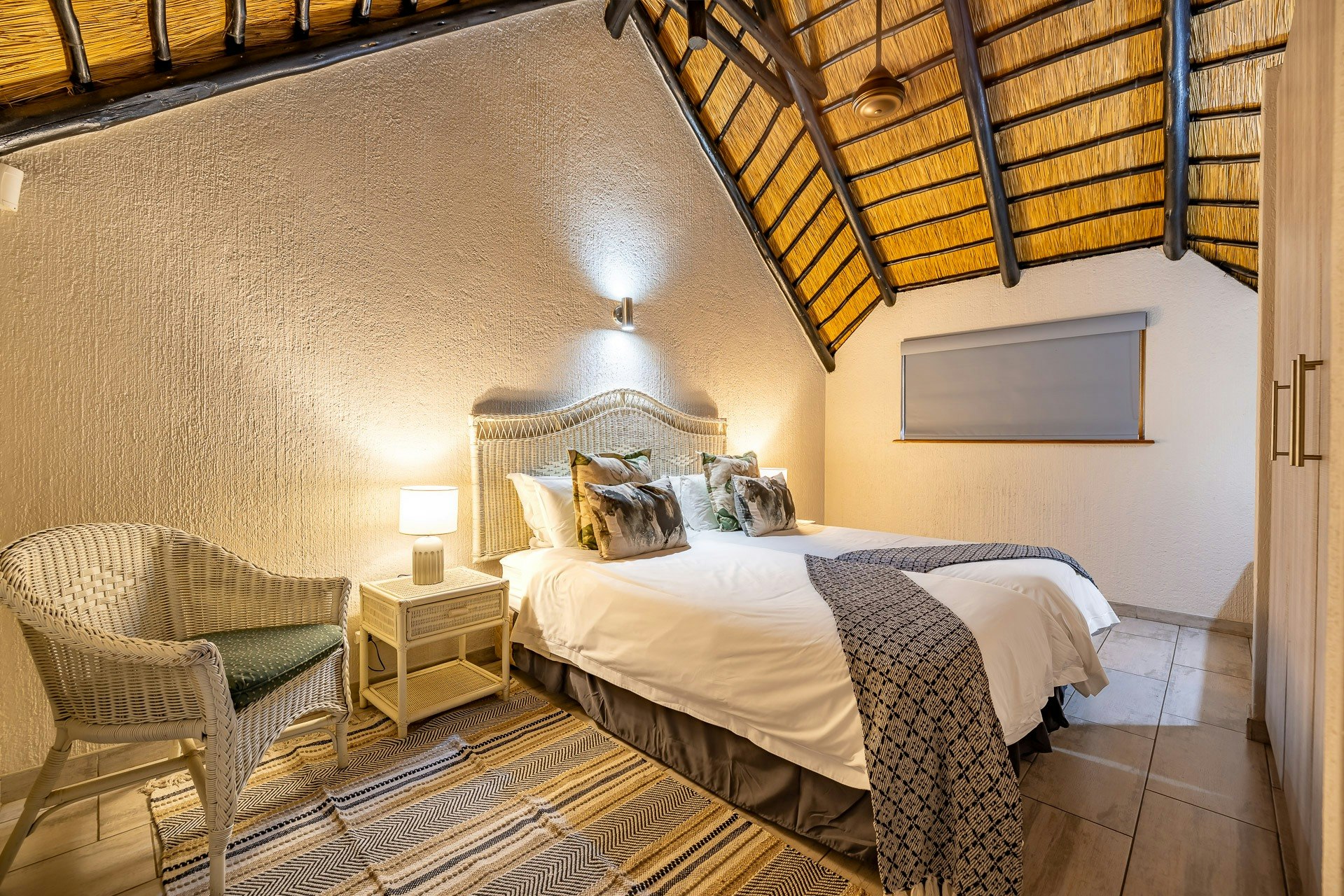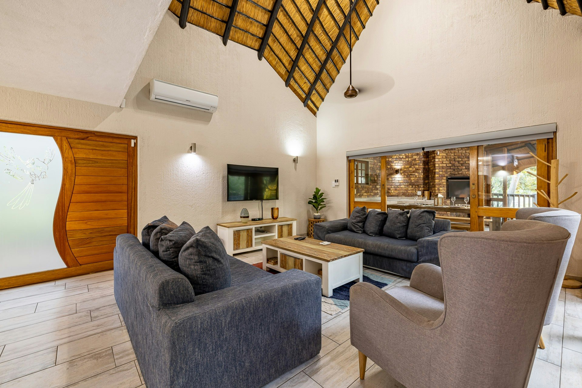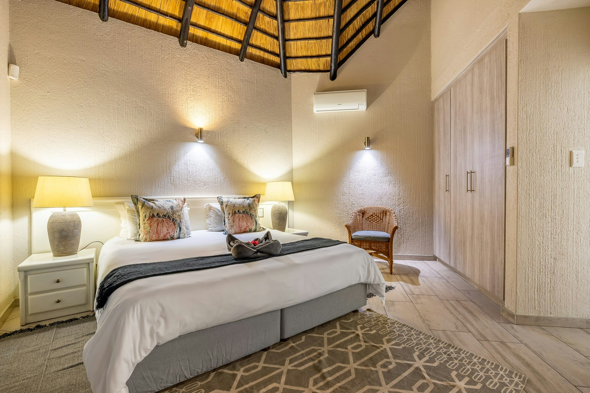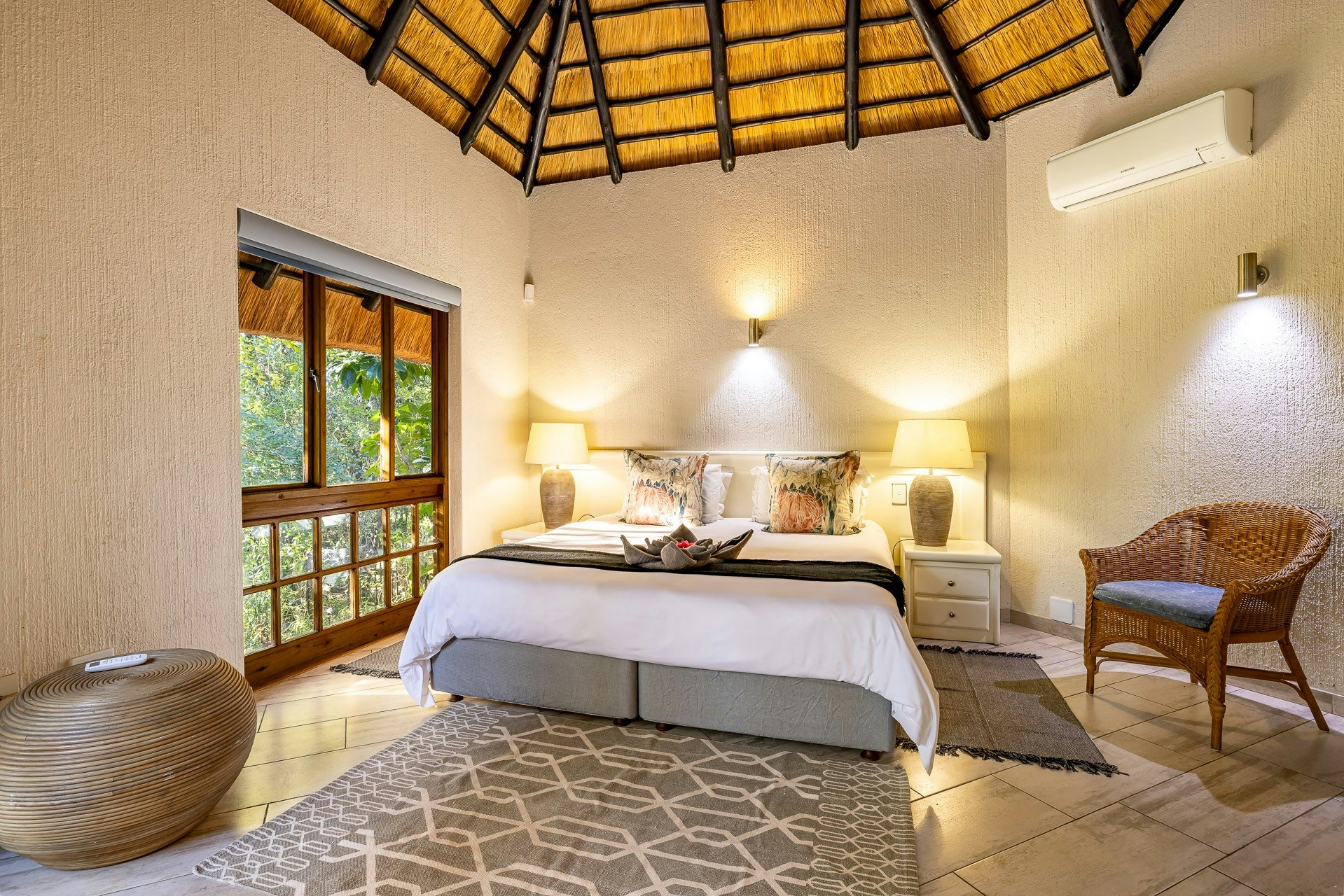 This double-storey lodge comprises 3 air-conditioned bedrooms, 2 bathrooms, and an open-plan living area. All the bedrooms are located upstairs; the main bedroom is furnished with a king-size bed and features an en-suite bathroom fitted with a toilet, basin, bath, and shower. The second and third bedrooms each have twin beds that can be converted into a king-size bed and share the second bathroom with a toilet, basin, bath, and shower.
