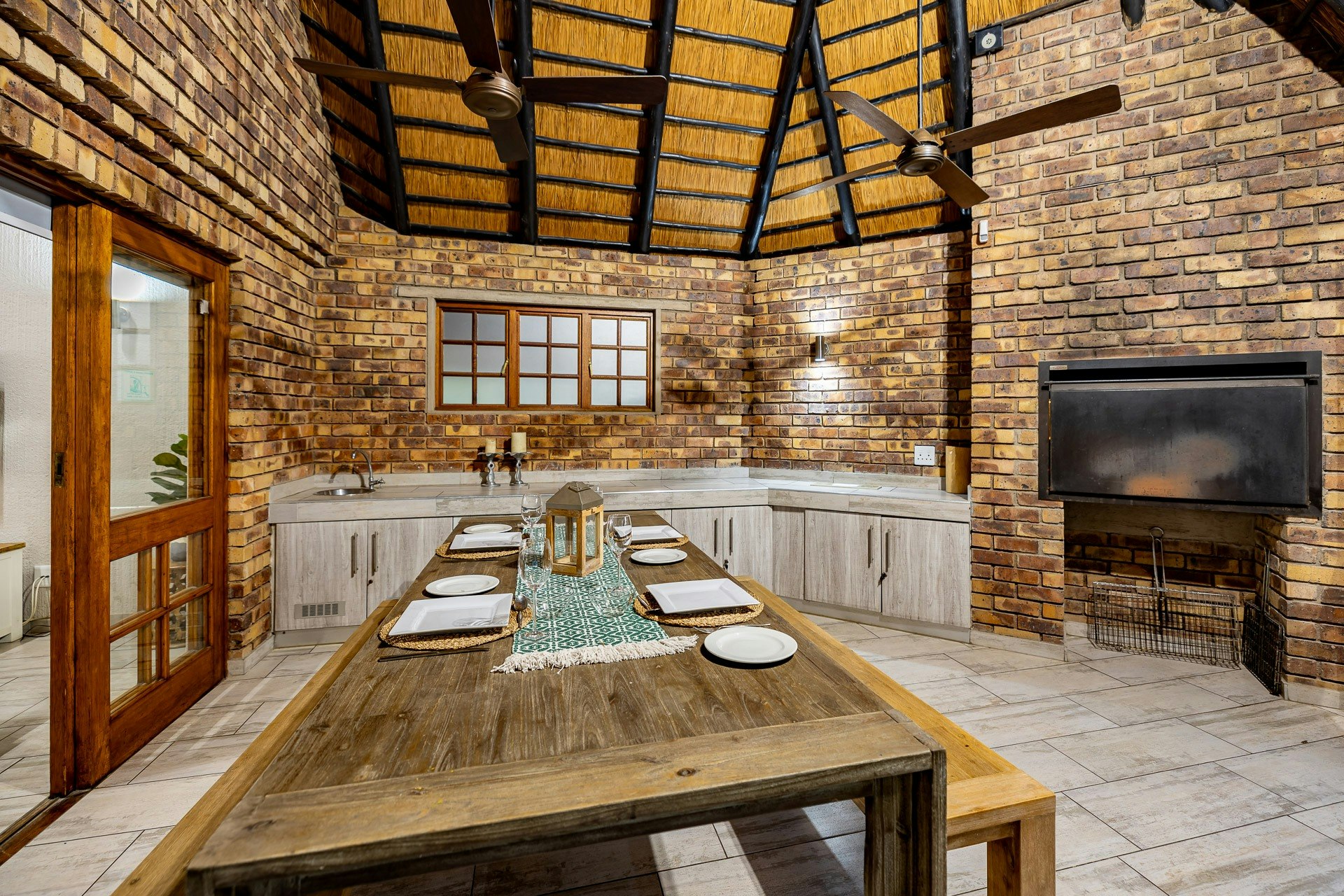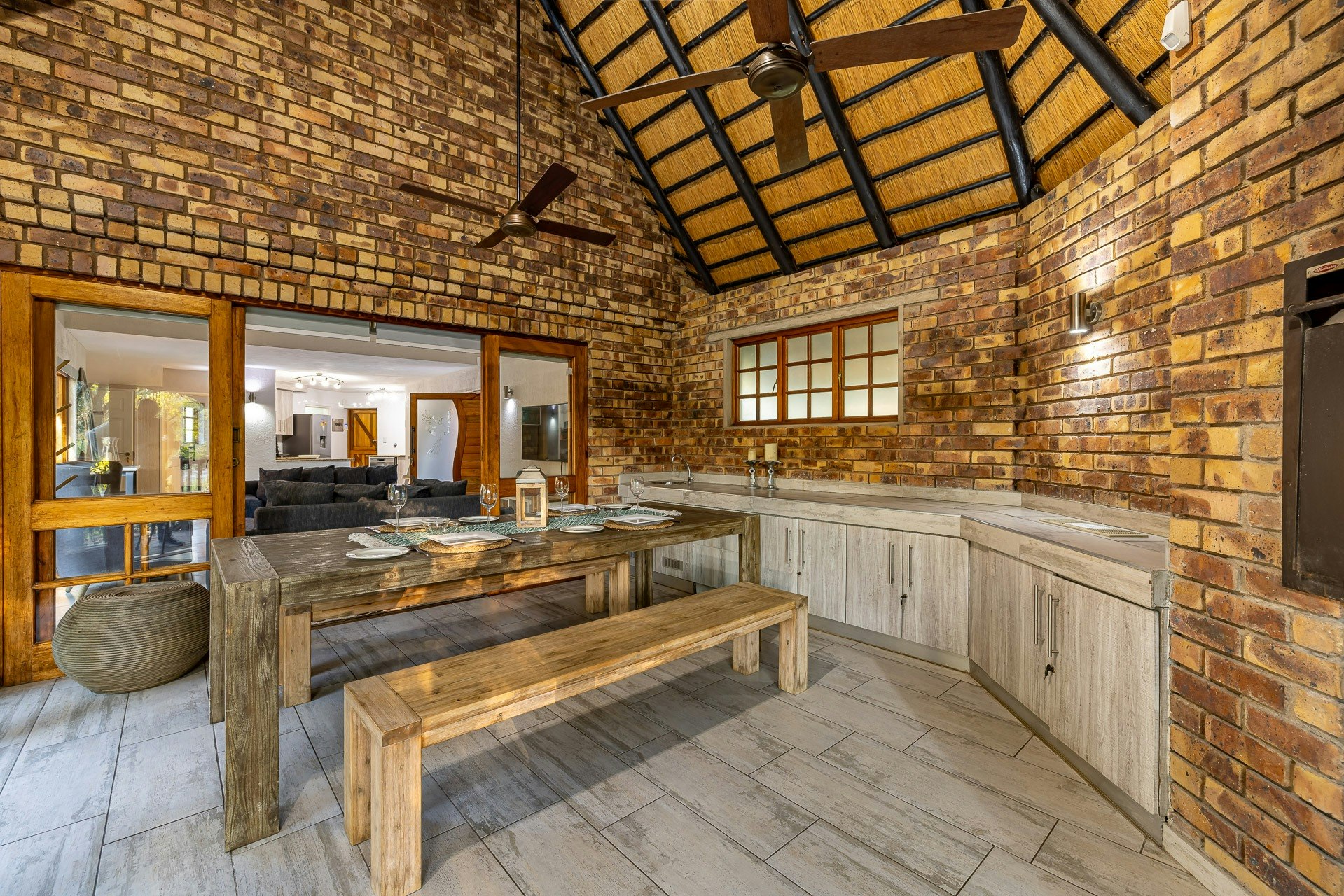 The well-equipped kitchen contains a fridge, a microwave, an oven with a stove, a dishwasher, and other appliances. The adjacent open-plan lounge features an HD TV and leads out to the covered patio, which boasts a built-in braai area and an outdoor dining table with seating.