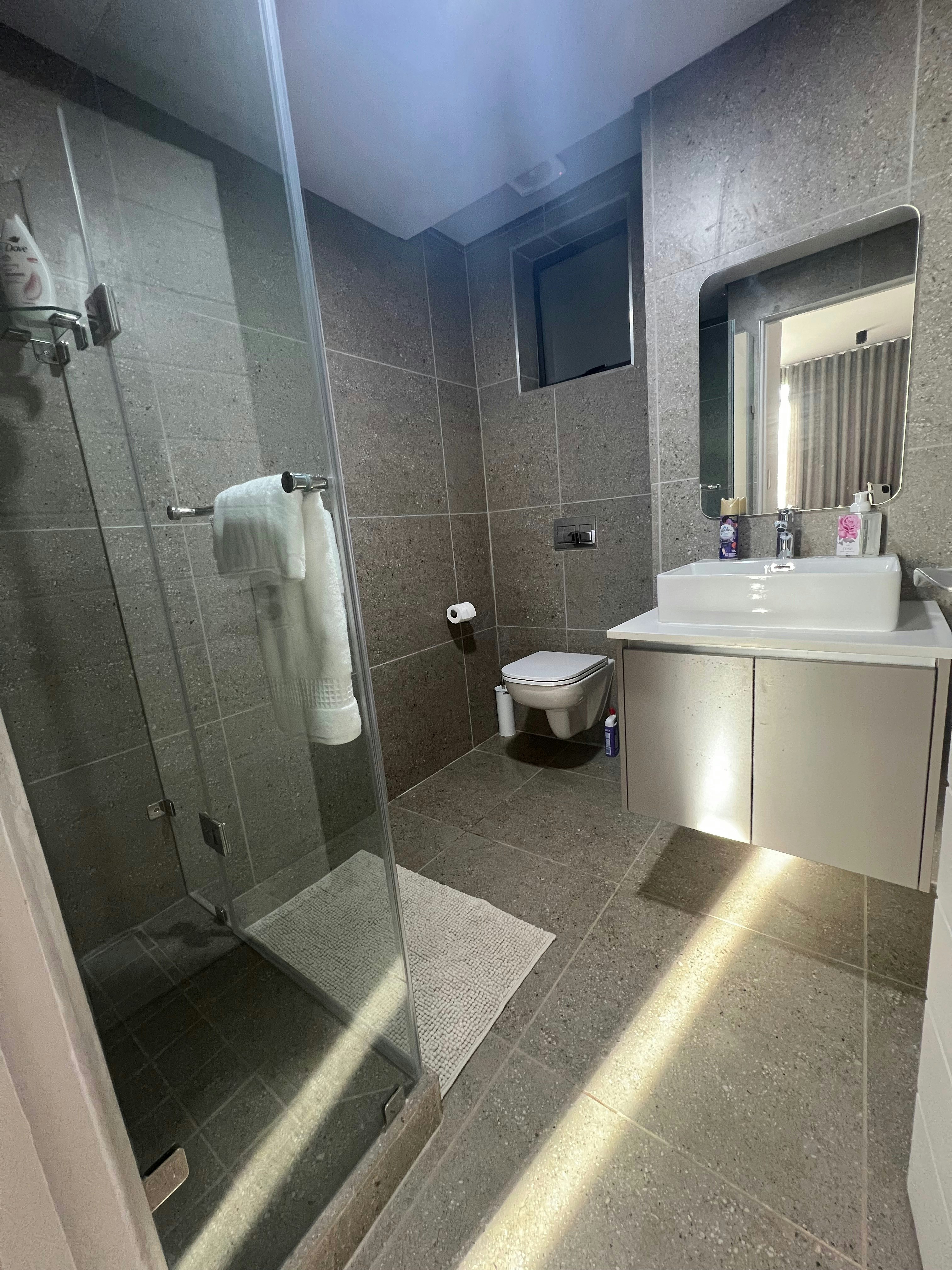 The unit can accommodate up to 4 guests at a time and comprises 2 bedrooms and 1 bathroom. Both bedrooms are furnished with queen-size beds and share a bathroom fitted with a shower, washbasin, and toilet. Crisp white linen and towels are provided.