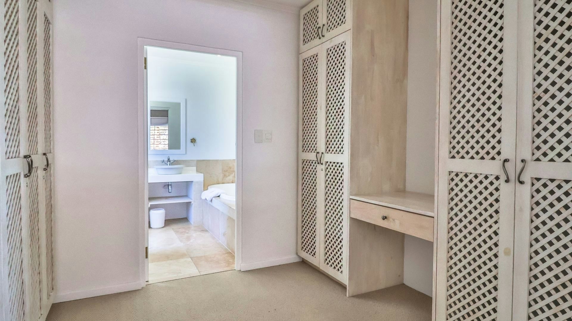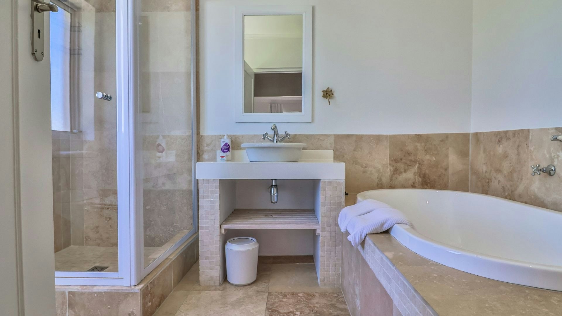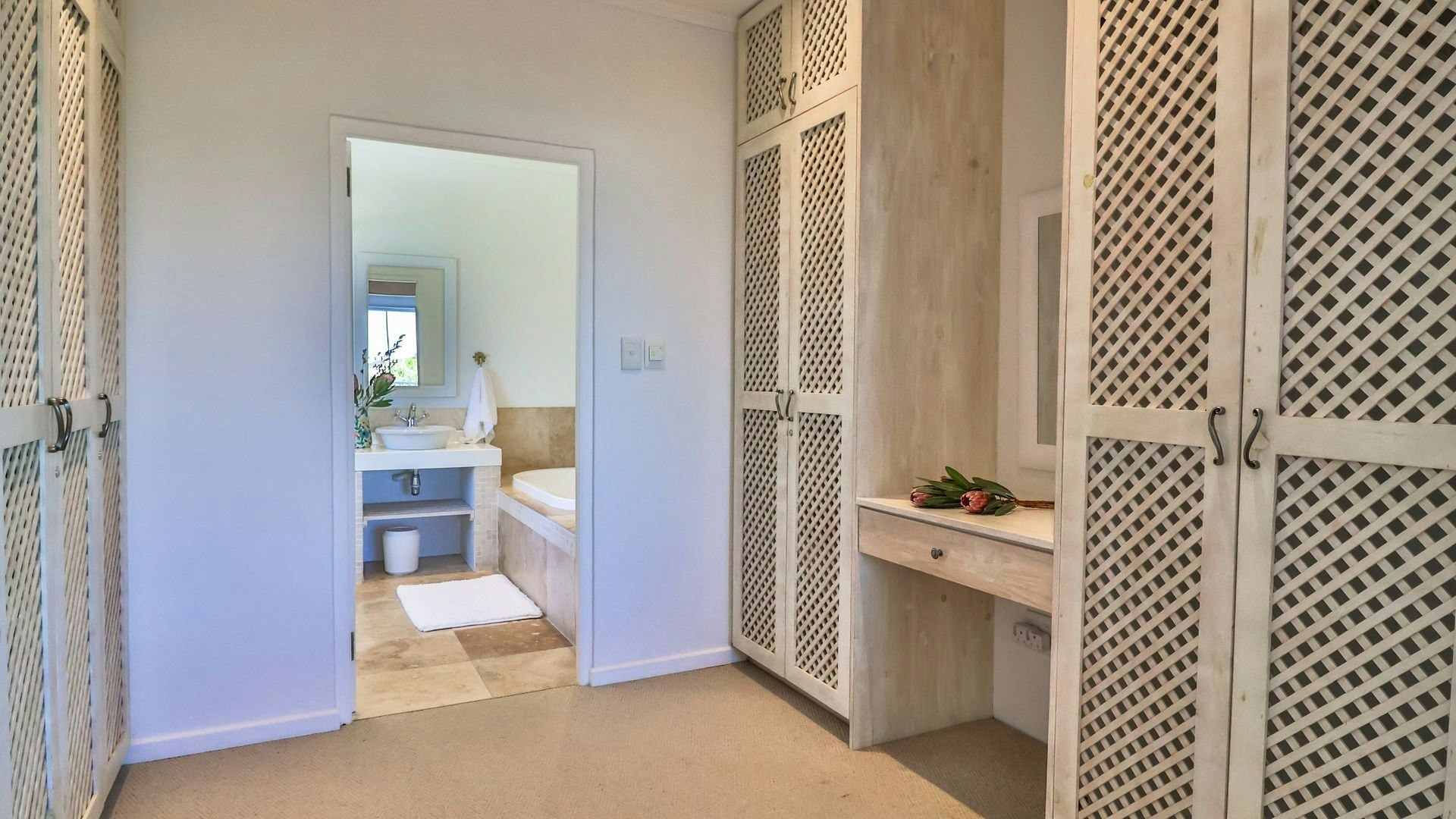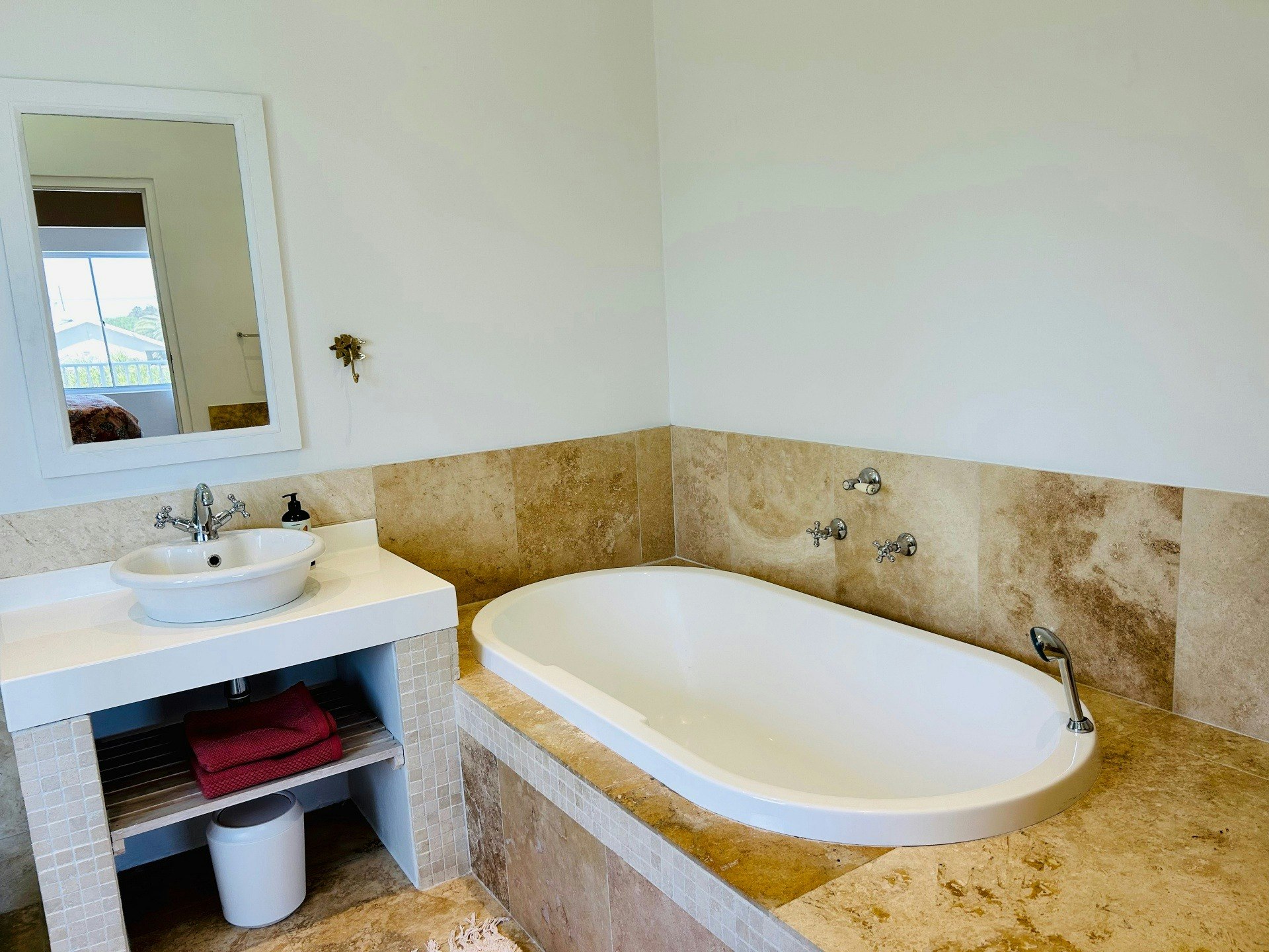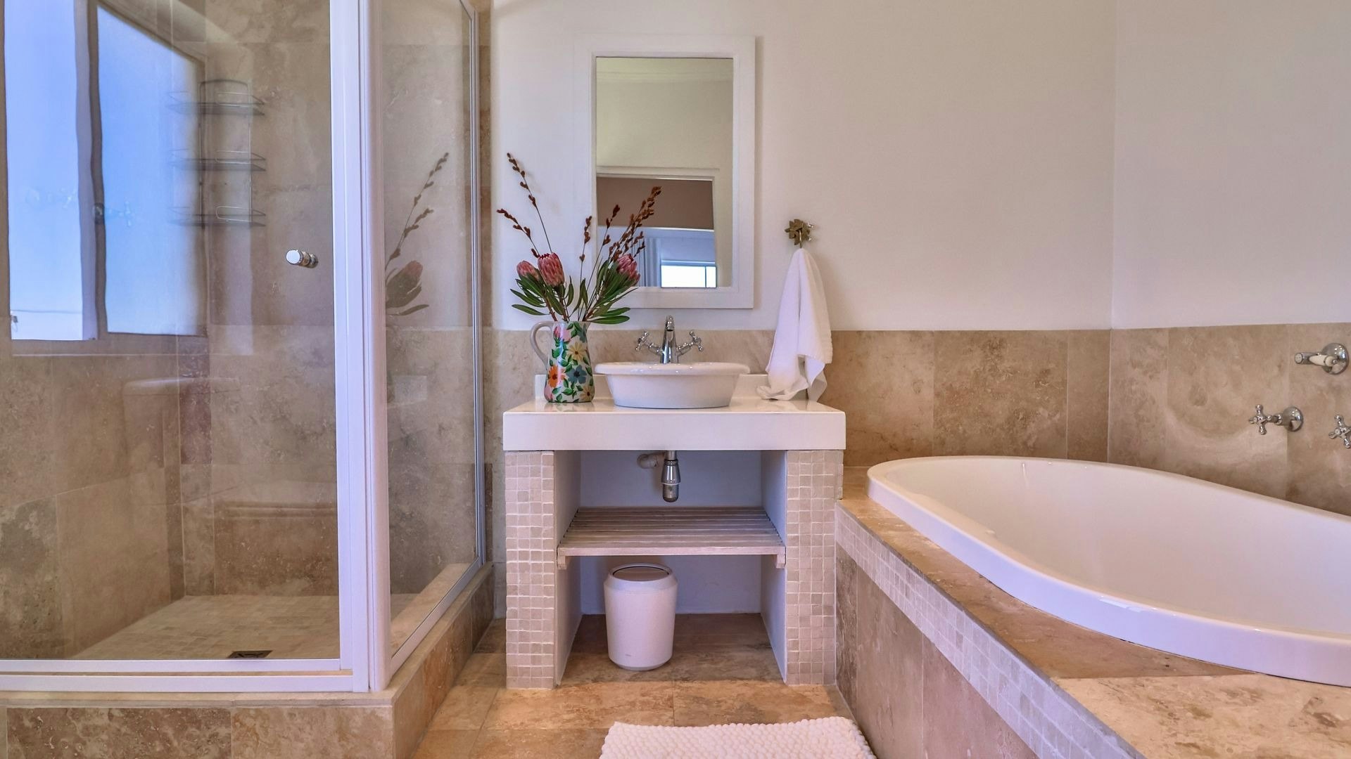 This home has a sleeping capacity of 8 guests and comprises 4 tastefully furnished bedrooms. The main bedroom on the ground floor is furnished with a king-size bed, ample cupboard space, and a sizeable bathroom fitted with a bath, shower, basin, and toilet. It opens up to an outdoor entertainment area. Upstairs, the second en-suite bedroom has a king-size bed and also features a spacious bathroom with a bath and shower. The third and fourth bedrooms are located opposite the TV room, both furnished with twin beds and have an adjoining bathroom fitted with a bath, shower, basin, and toilet. A guest bathroom is located downstairs fitted with a shower, basin, and toilet. Linen and towels are provided.