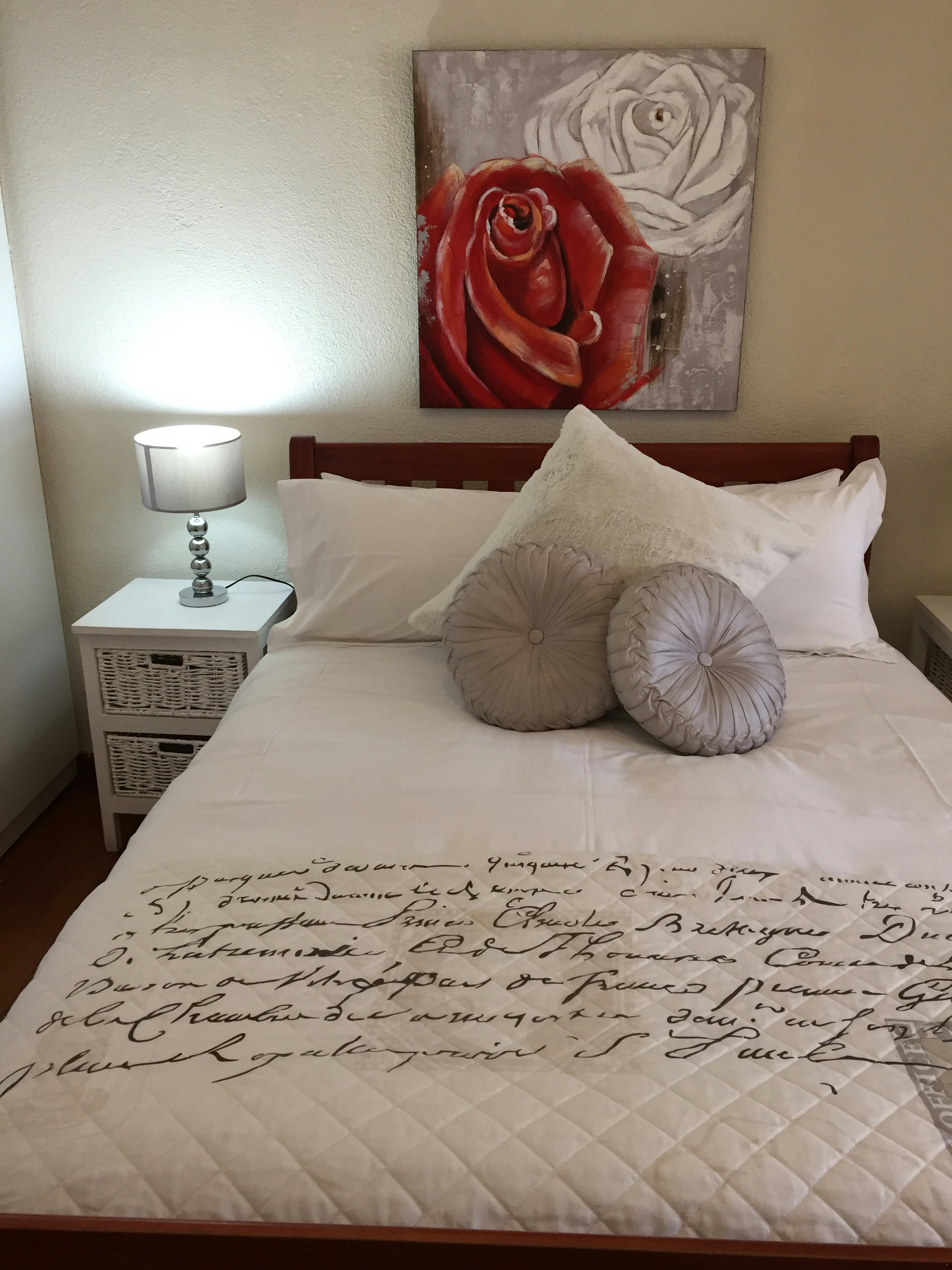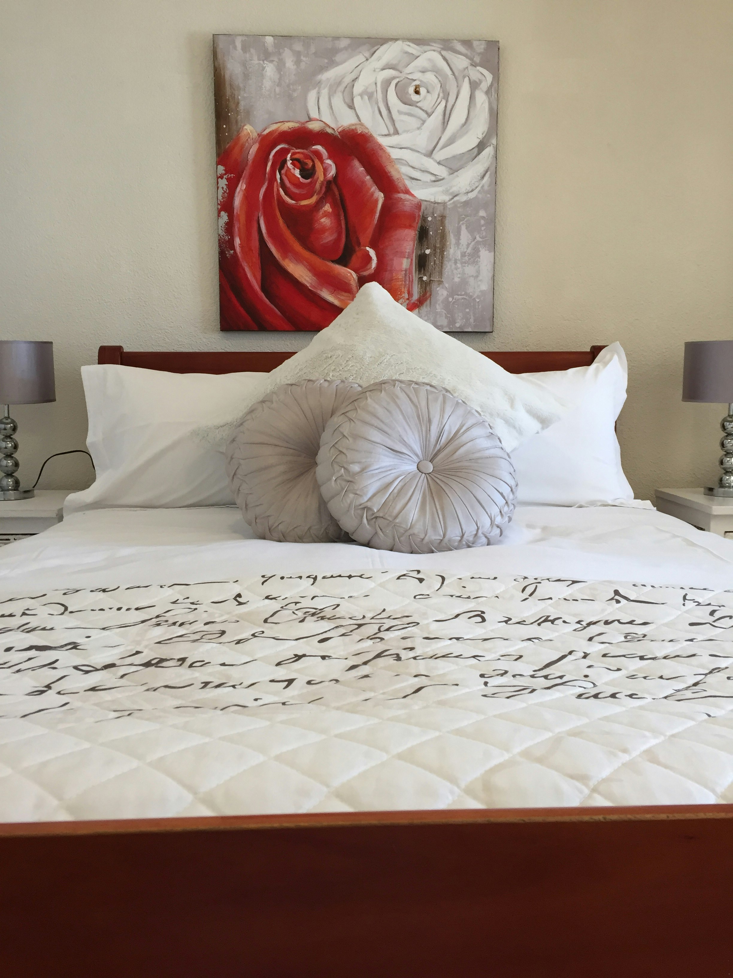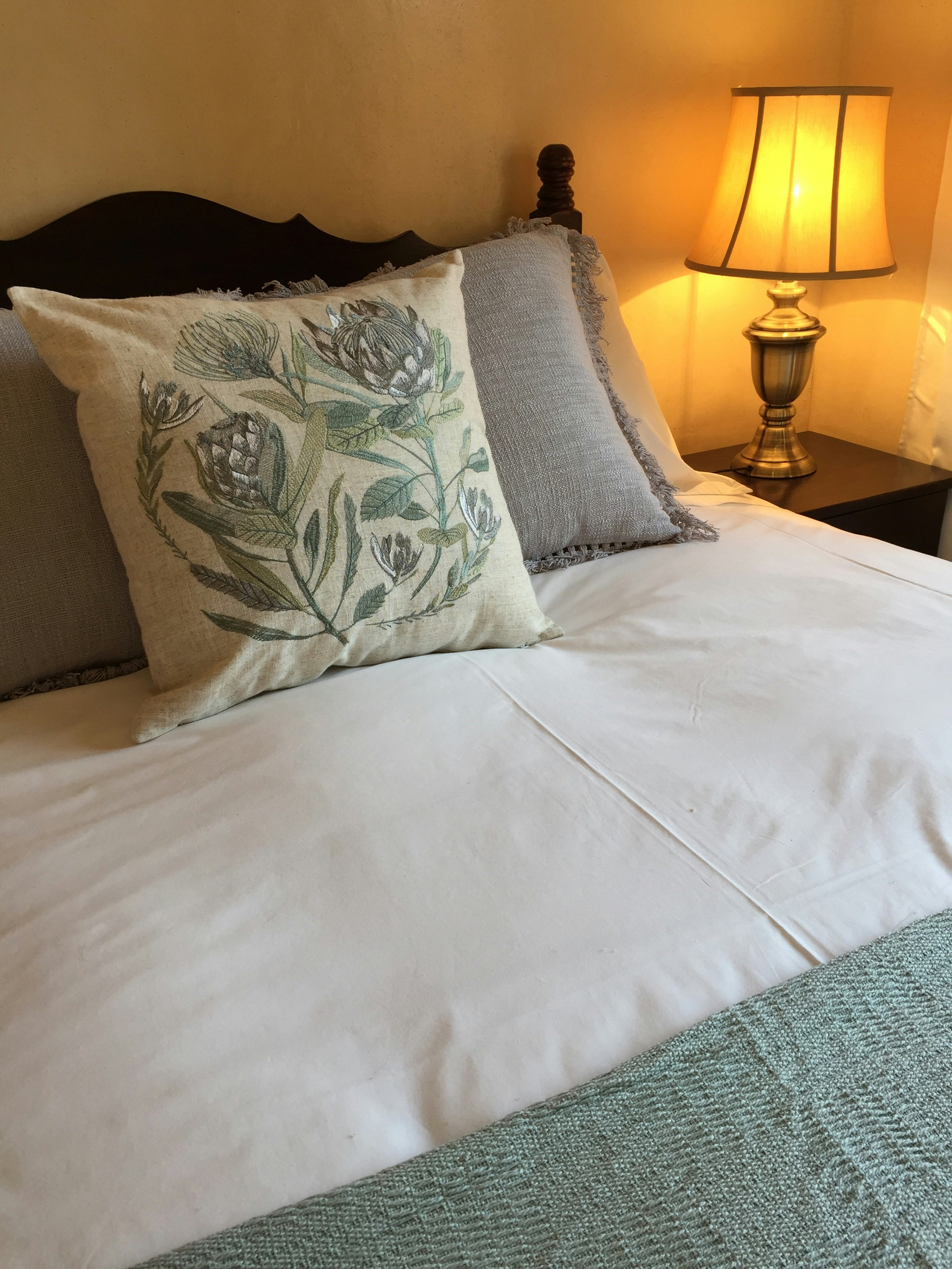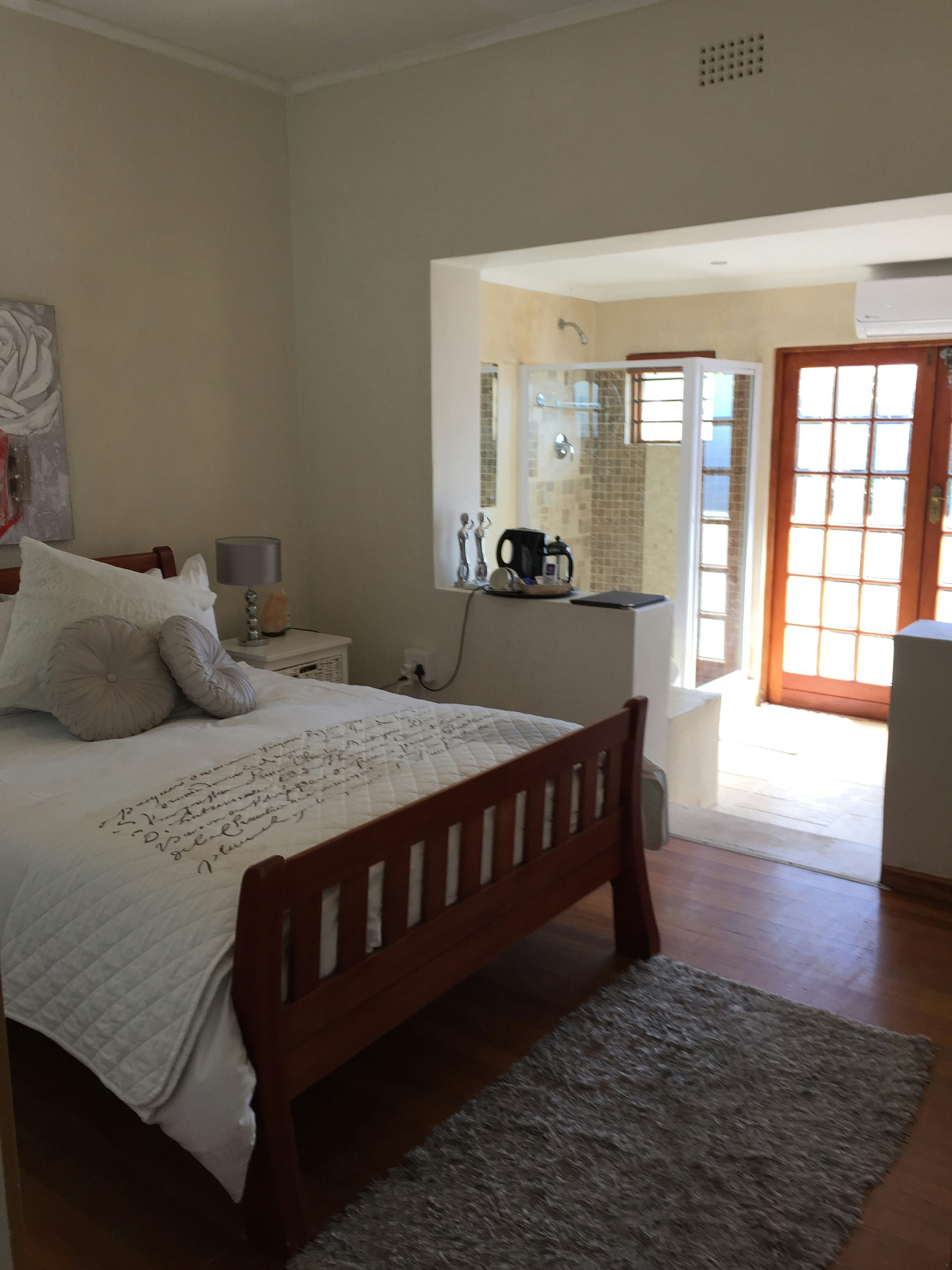This beautiful self-catering home is fitted with an inverter system and has 4 en-suite bedrooms that are furnished with queen beds as well as a separate bachelor unit that can accommodate up to 10 guests. The bathrooms are fitted with either a bath and a shower, or both. The home has a beautiful and fully equipped kitchen with a gas-hob island, stove, and bar. Each room has a private garden. The kitchen opens up to a big entertainment area with a swimming pool, patio area, braai, and a stone-ground pizza oven. It offers satellite TV and Wi-Fi access. Secure property with electric fencing personal remote access and private parking. The main bedroom's en-suite bathroom opens to the outside through French doors.