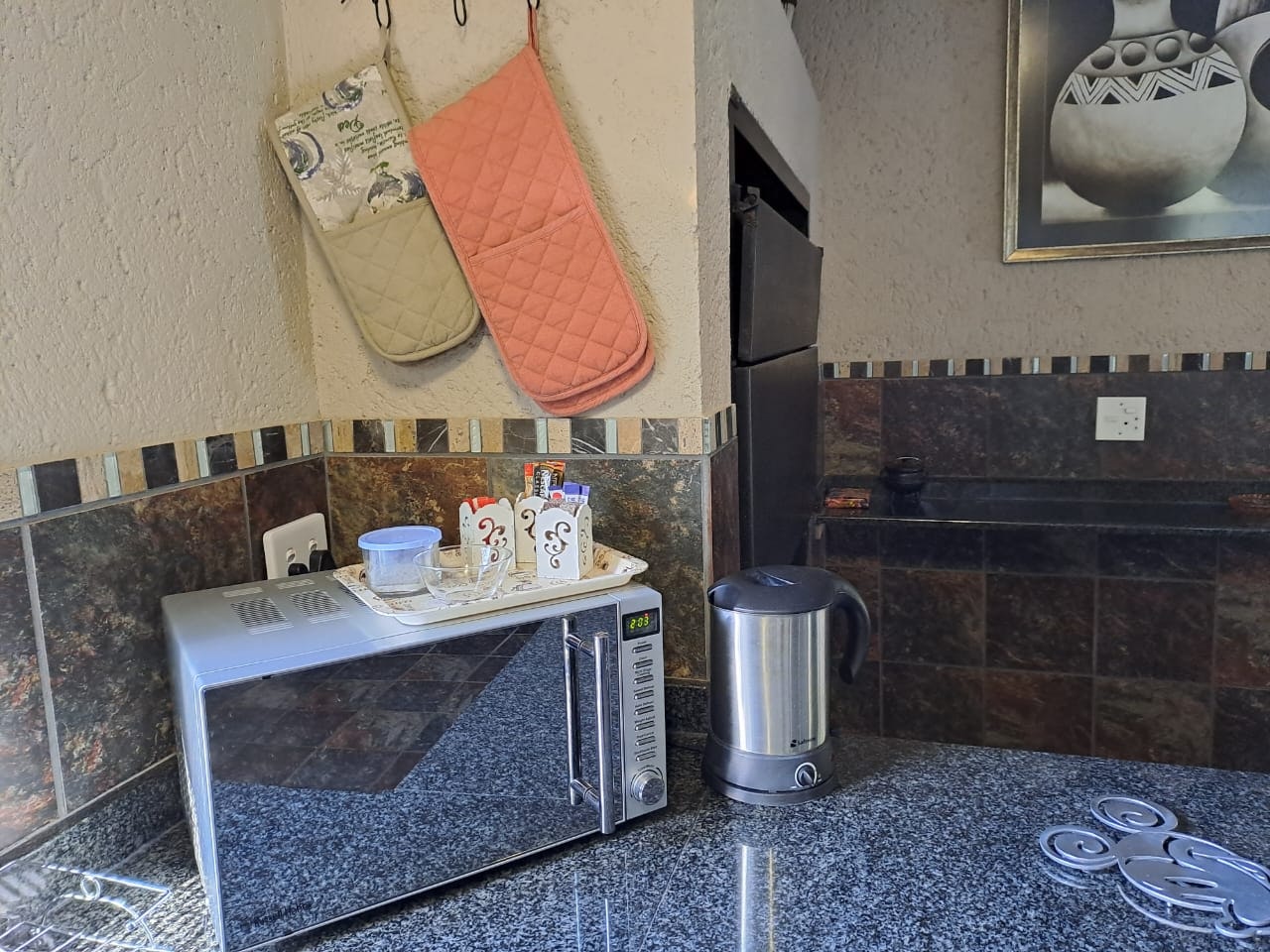 The kitchen is open-plan to the living area and is equipped with a 1-plate induction hob, microwave, fridge-freezer, cutlery, crockery, and tea- and coffee-making facilities. The living area features comfortable couches and a TV with DStv. It also provides direct access to the swimming pool.