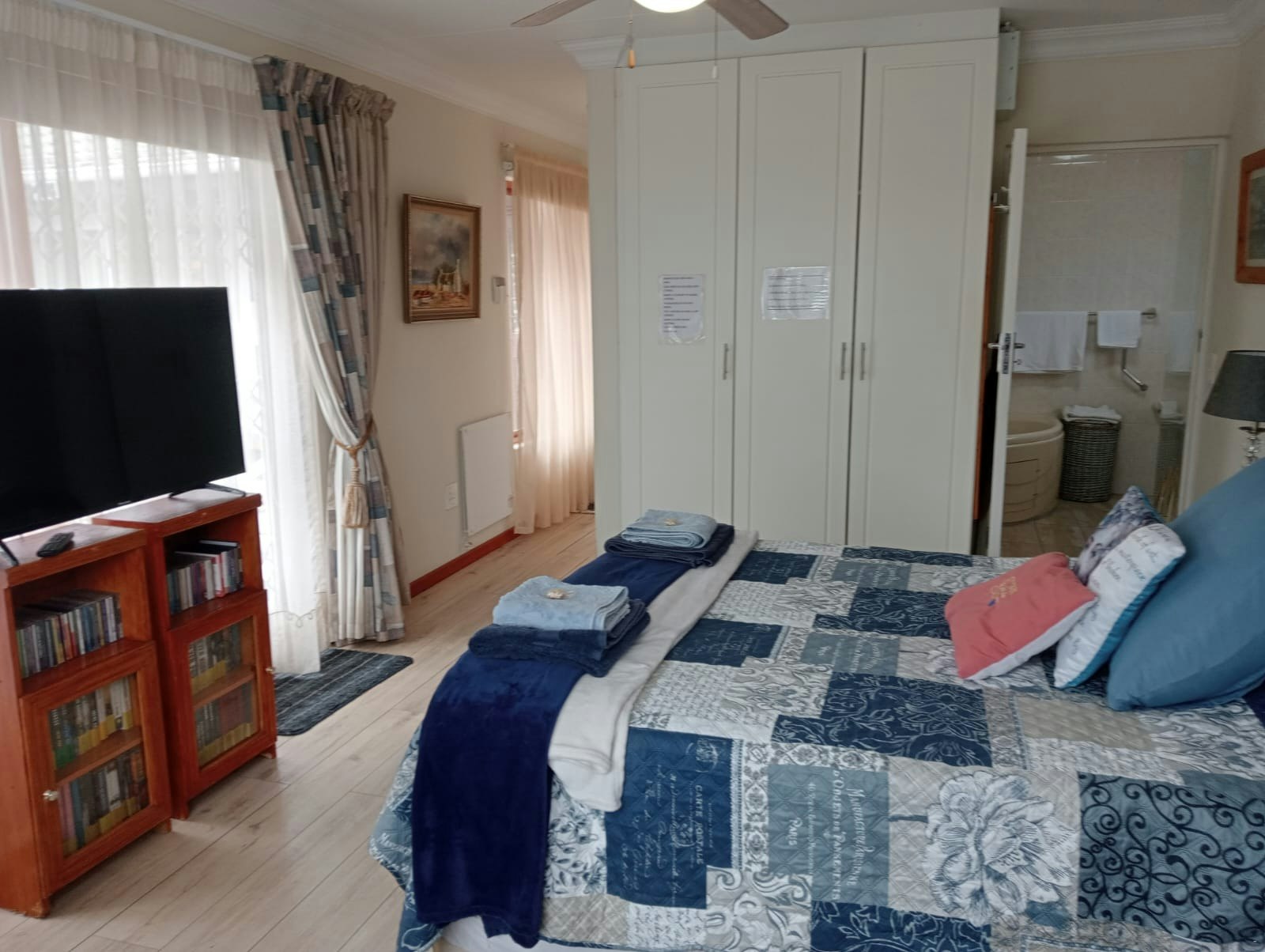 Die kombuis is volledig toegerus vir selfsorg en bevat 'n stoof, oond, yskas-vrieskas, mikrogolfoond, eetgerei en breekware. Die leefarea het 'n eetkamertafel, gemaklike sitplek en 'n TV.