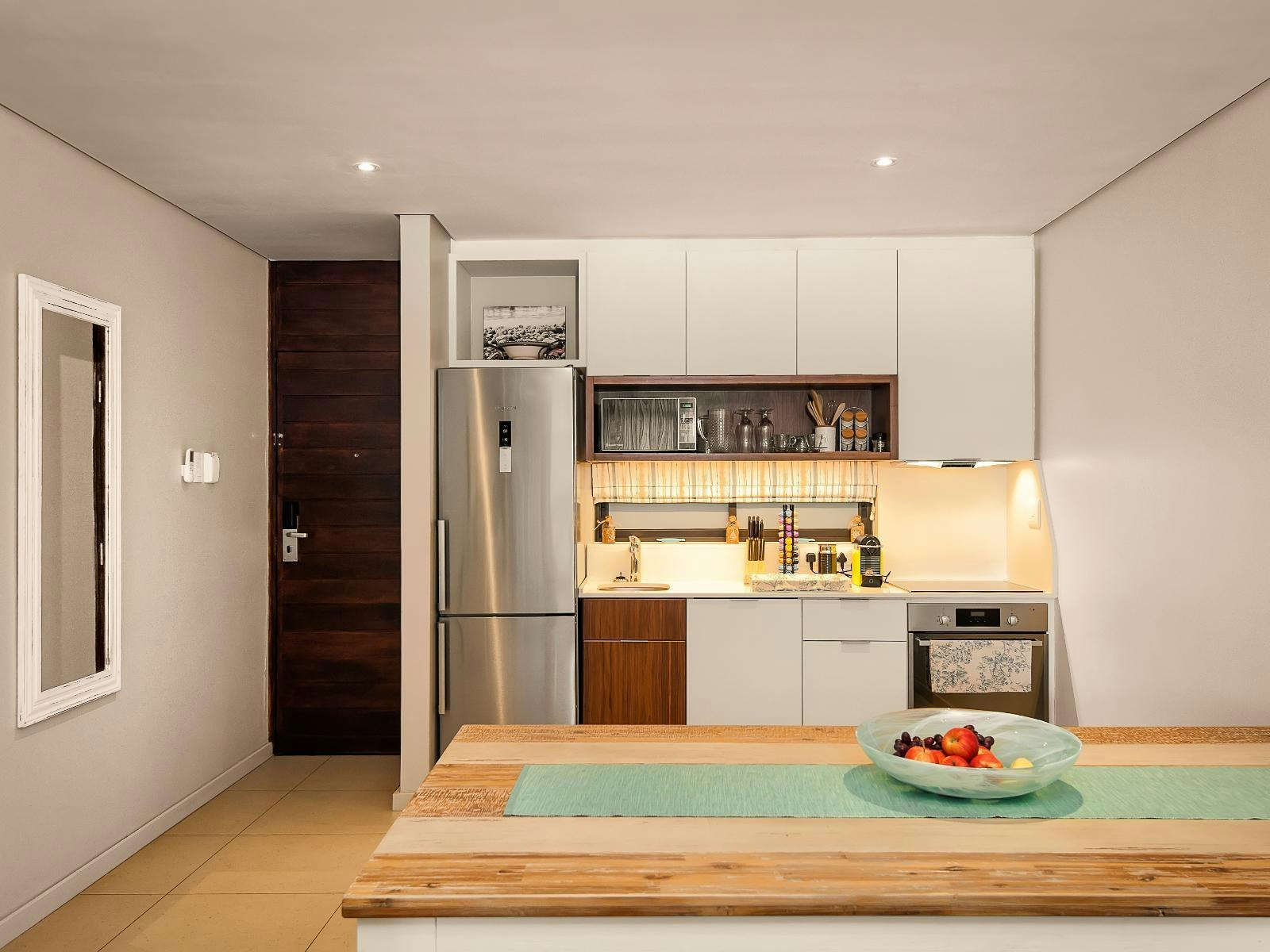 Die oopplan-kombuis is met 'n yskas-vrieskas, oond met 'n kookplaat, mikrogolf, ketel en broodrooster toegerus.