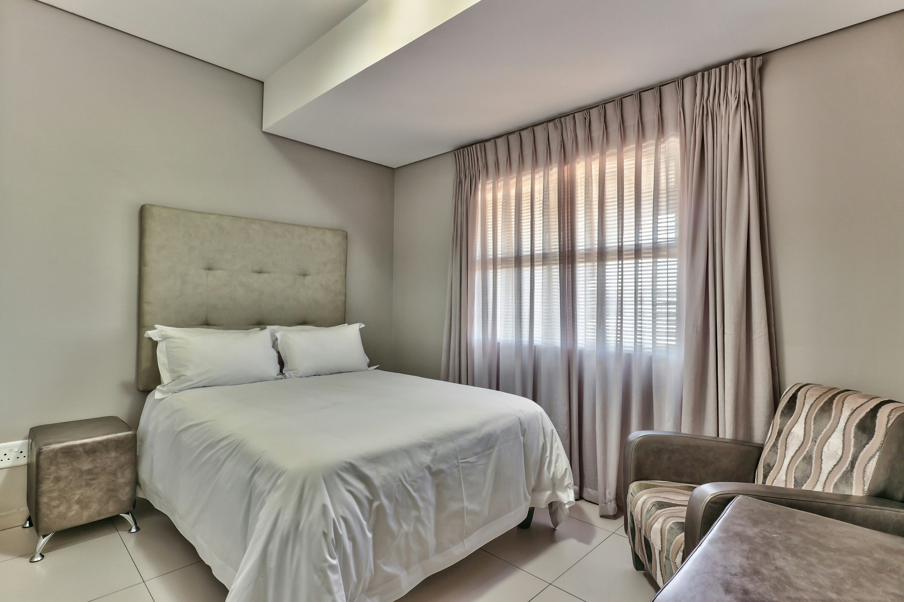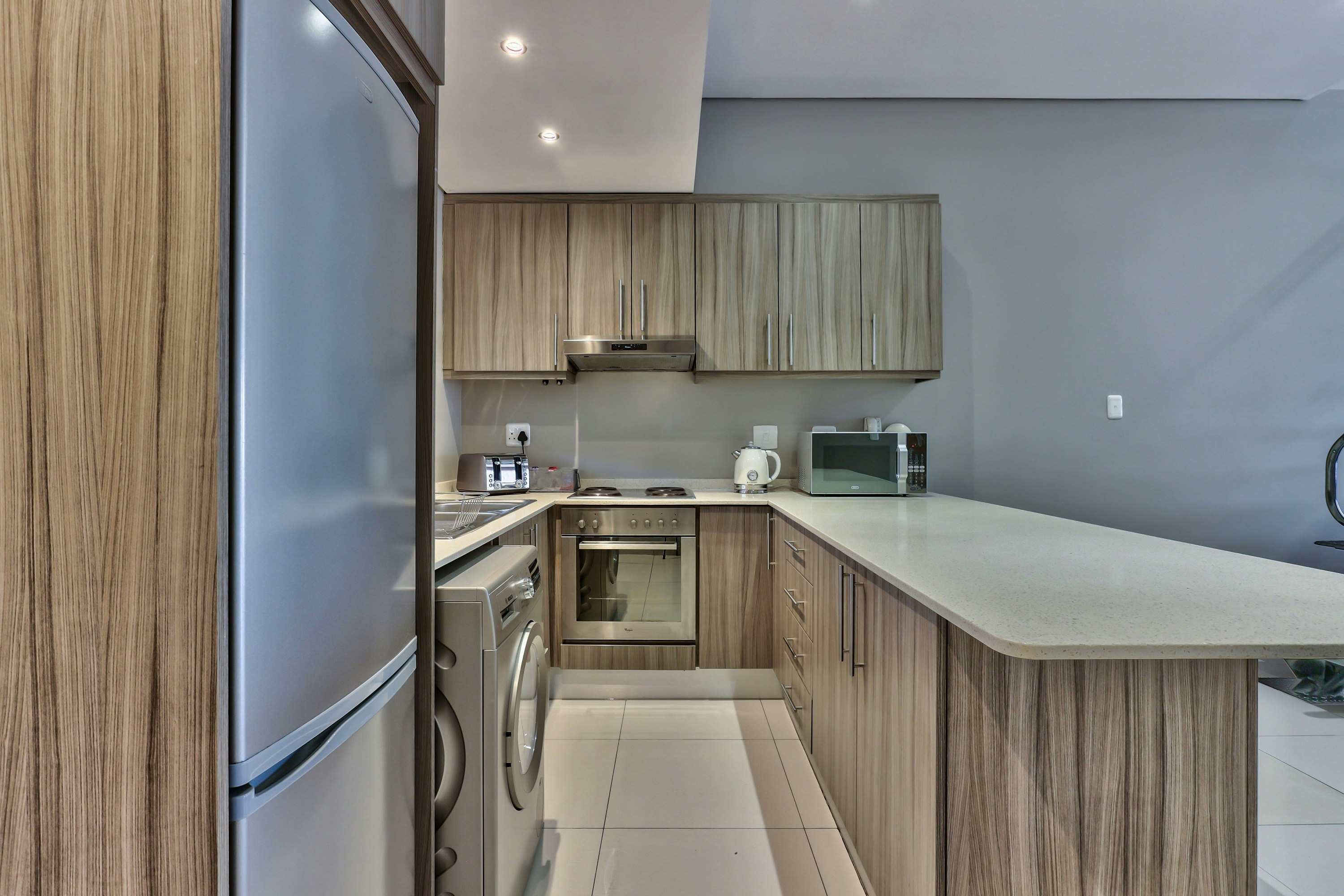 The unit features a well-equipped kitchen that includes a stove, oven, microwave, toaster, kettle, fridge-freezer, and a breakfast bar with stools. The lounge and dining area has comfortable seating for guests to dine and relax. For guests' entertainment, a flat-screen TV with selected DStv channels and access to free Wi-Fi are available.