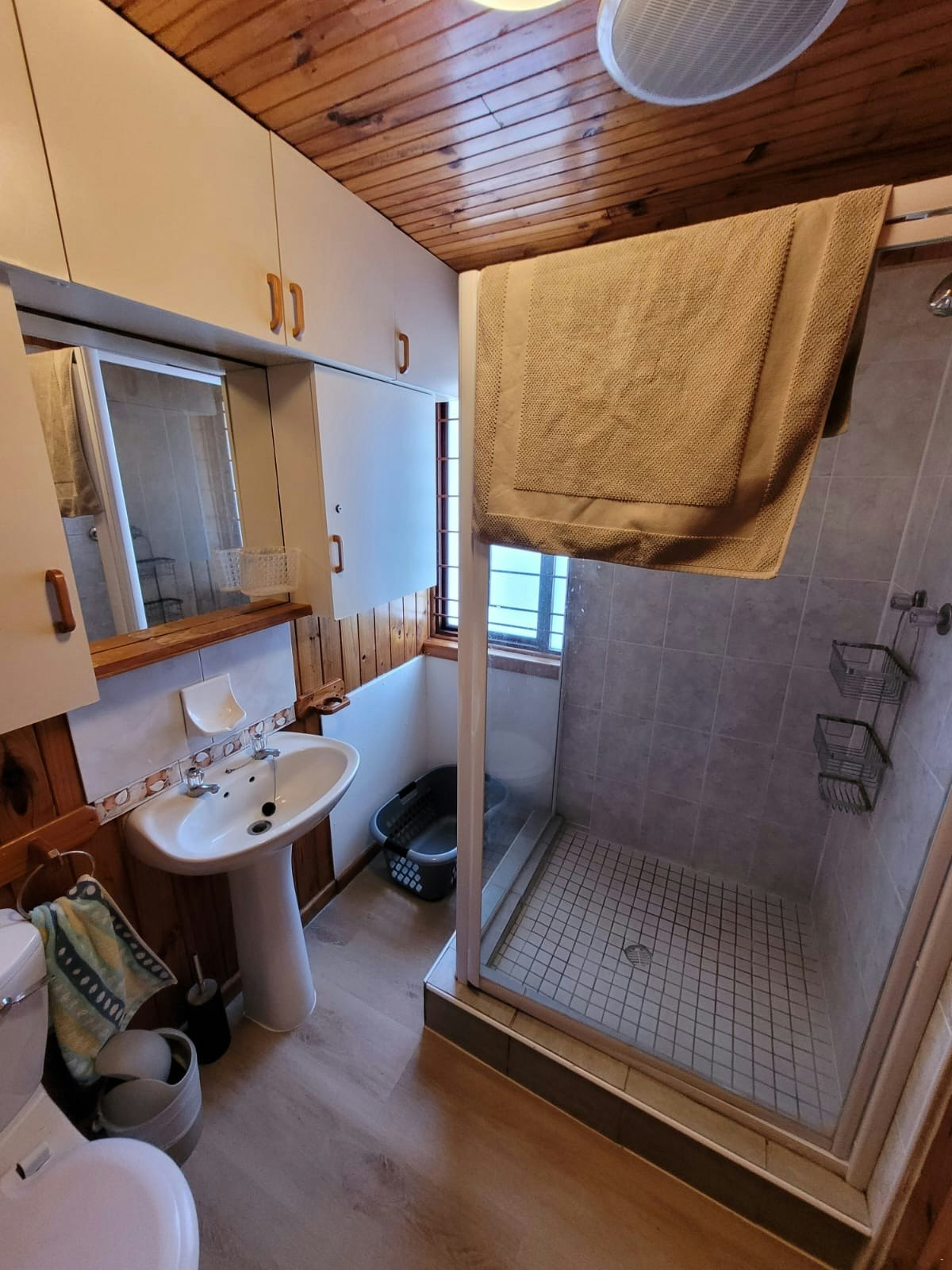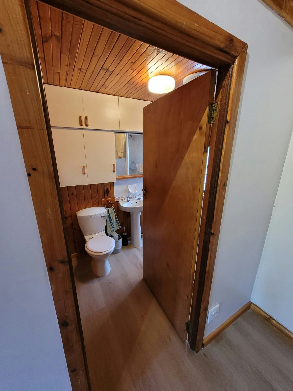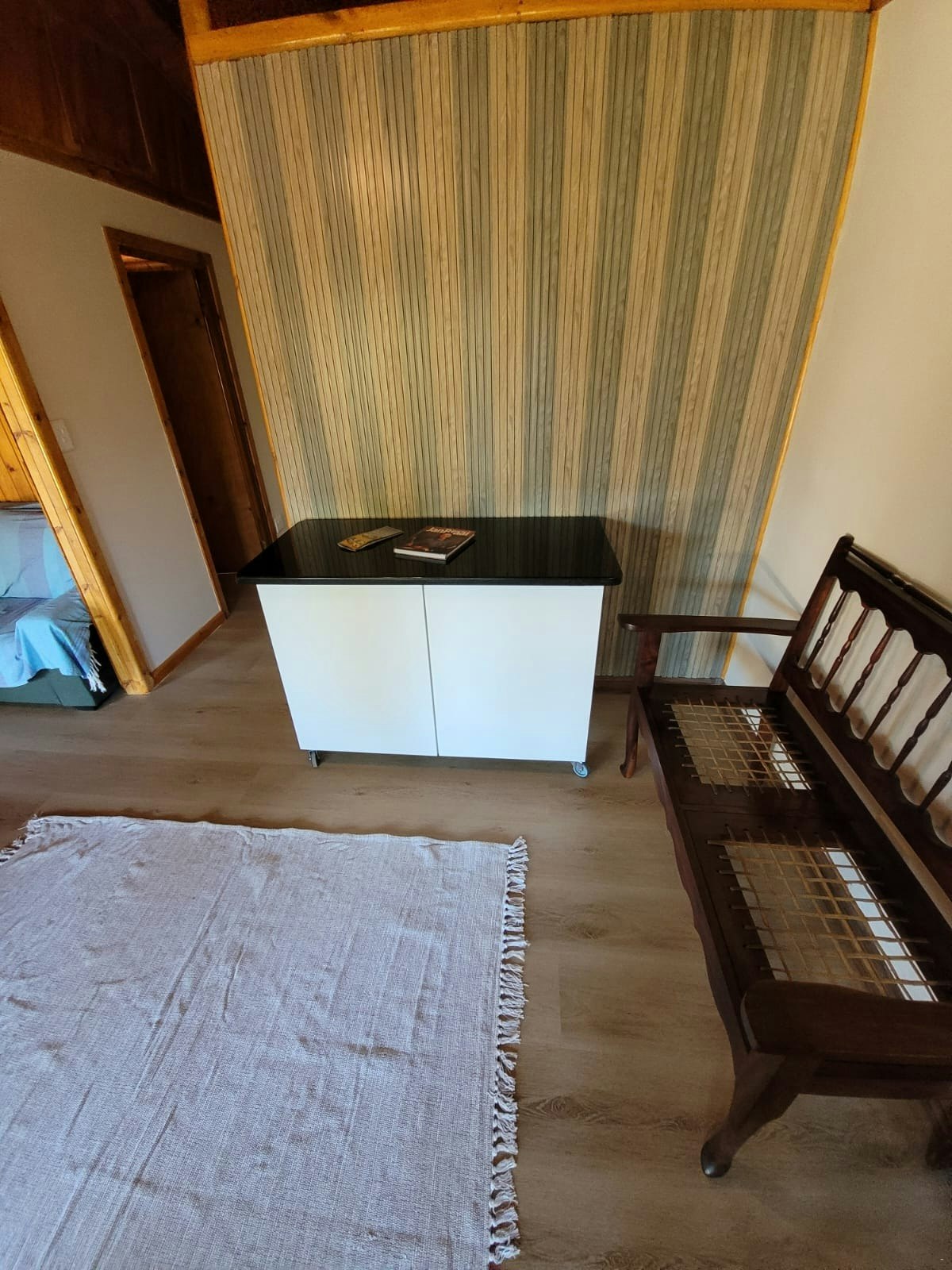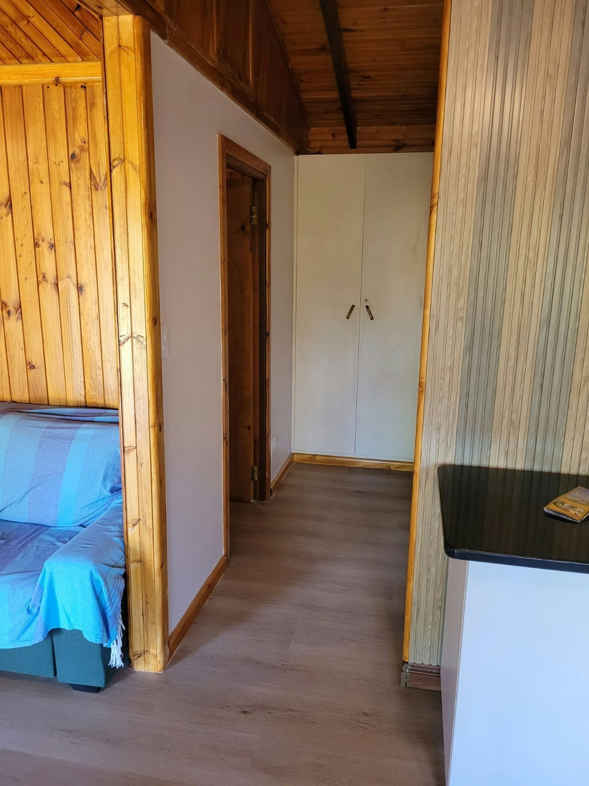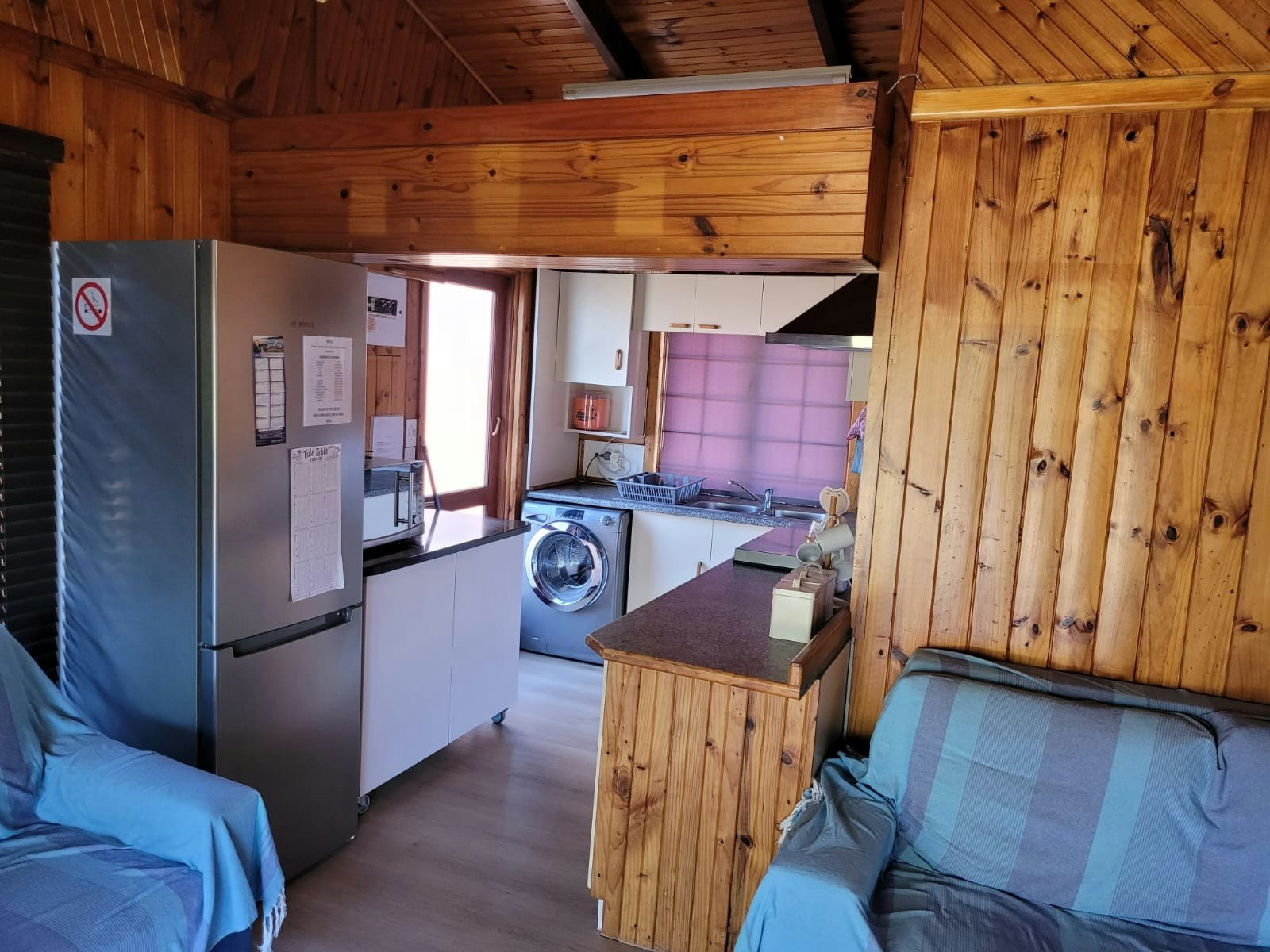 The cabin can accommodate up to 6 guests and comprises 3 bedrooms, 1 bathroom, and an open-plan kitchen and living area. The main bedroom contains a double bed, while the room next to it, the second bedroom, contains 2 single beds, as well as a third bedroom which has a double bed. The bathroom is fitted with a shower, a toilet and a washbasin.