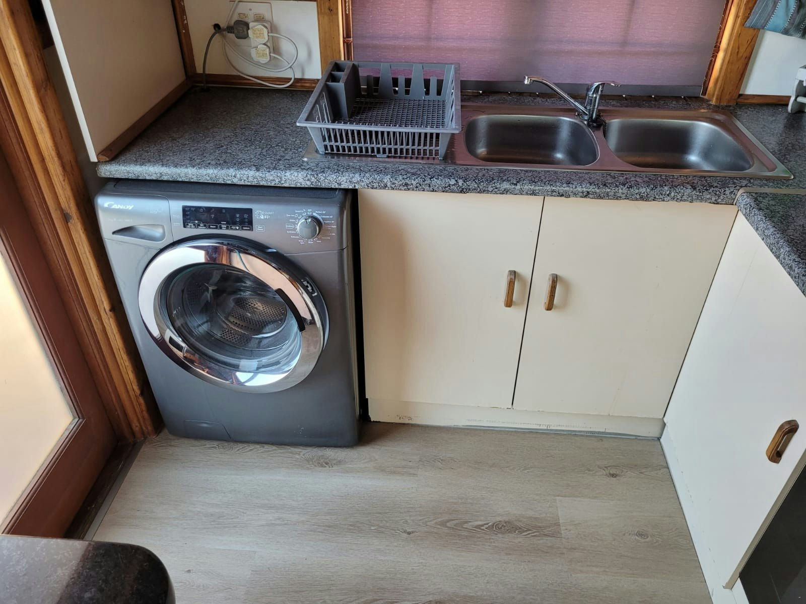 The kitchen is fully equipped for self-catering and contains a stove, oven, fridge-freezer, microwave, washing machine, and cutlery and crockery.