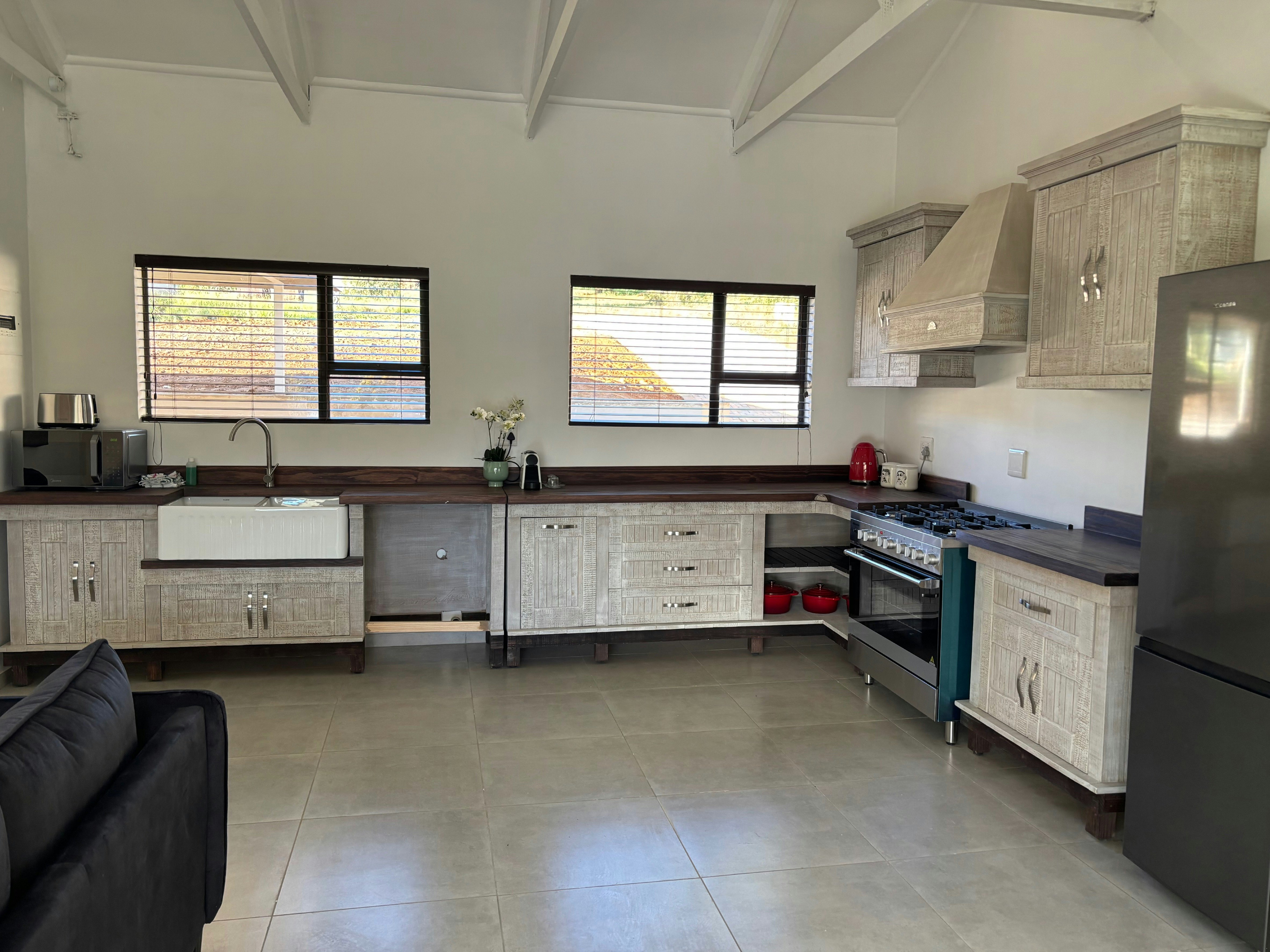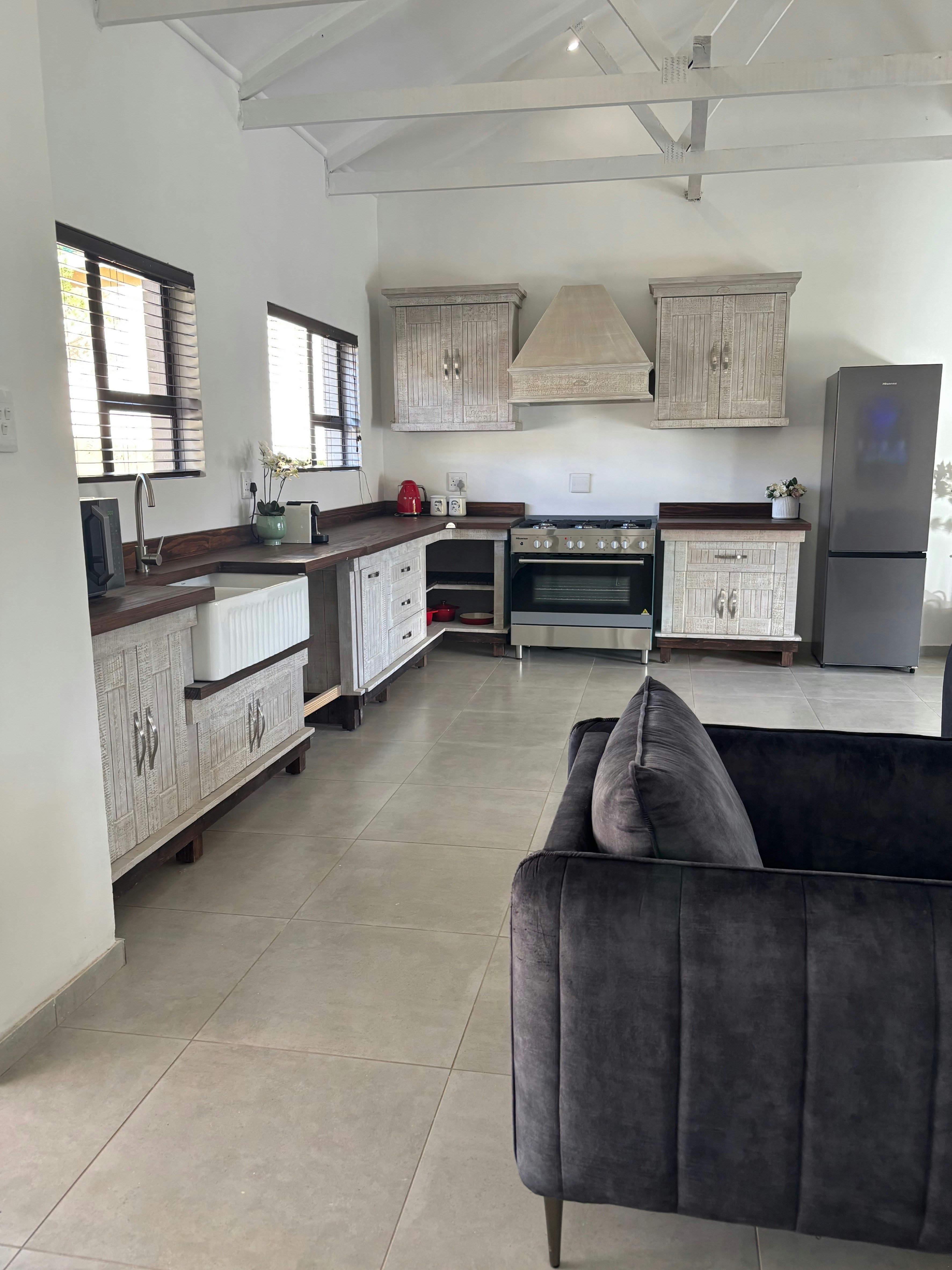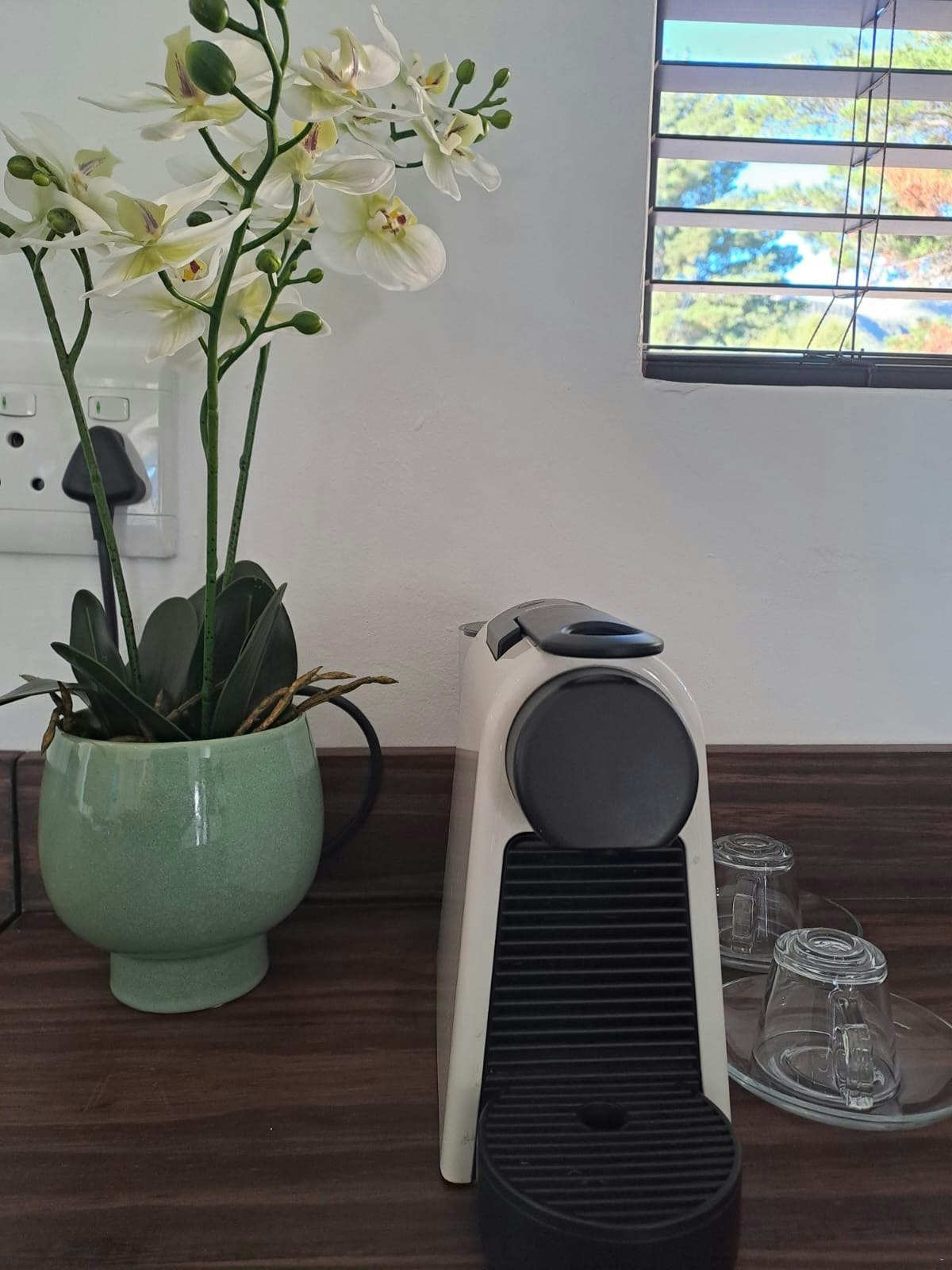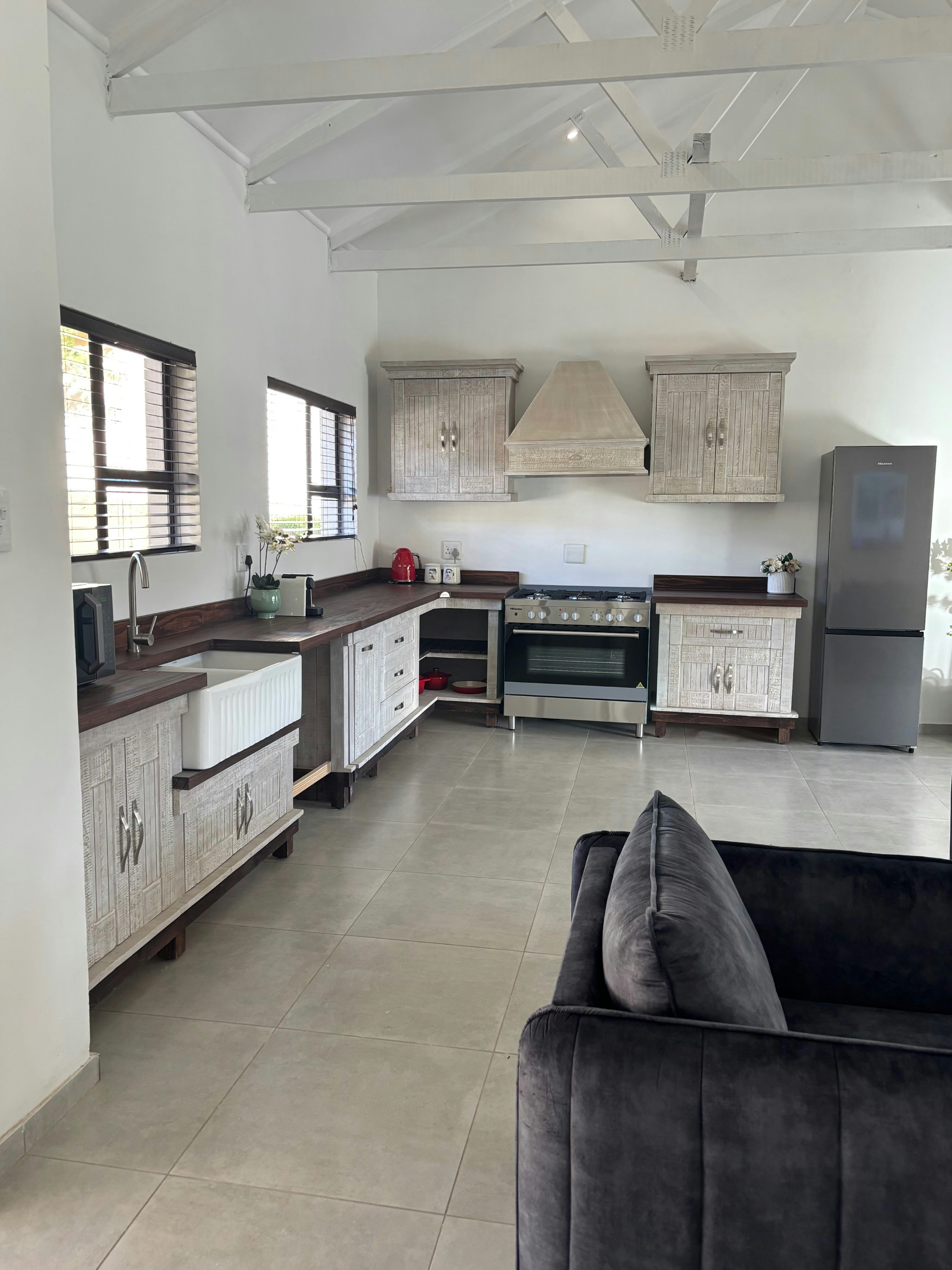 The living area features an open-plan design with a fully equipped kitchen, including a gas stove, oven, microwave, Nespresso machine, fridge-freezer, cutlery, and crockery. The lounge area is furnished with comfortable seating and offers breathtaking views from every angle, as well as a smart TV with Netflix and Showmax, along with free Wi-Fi facilities.