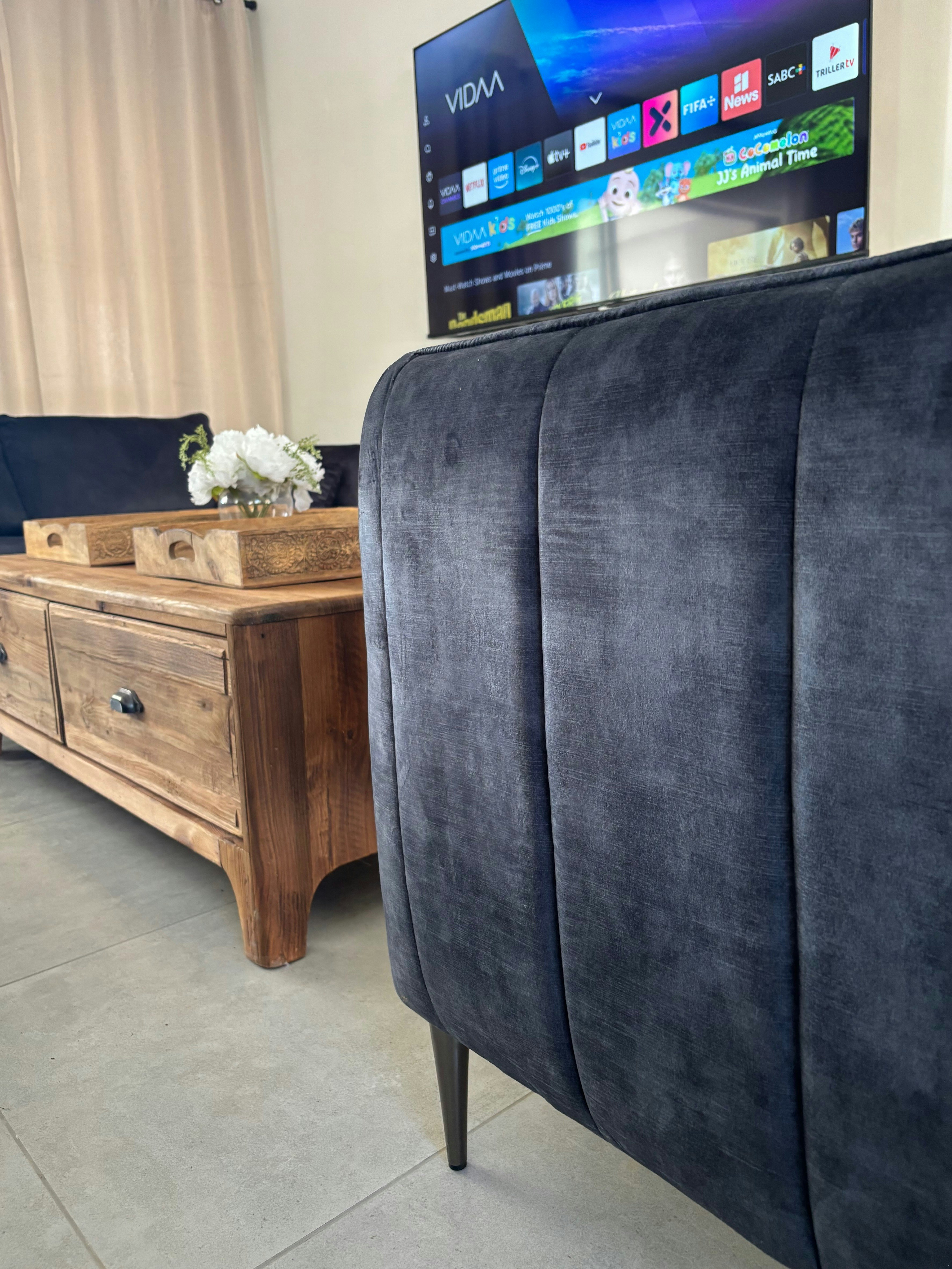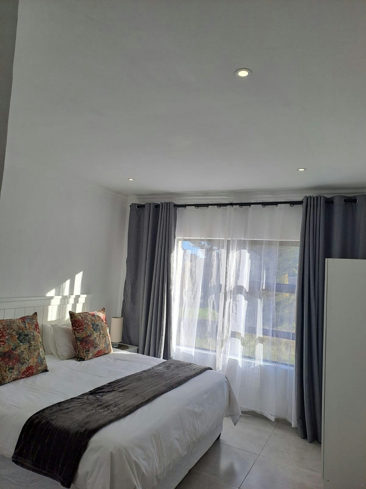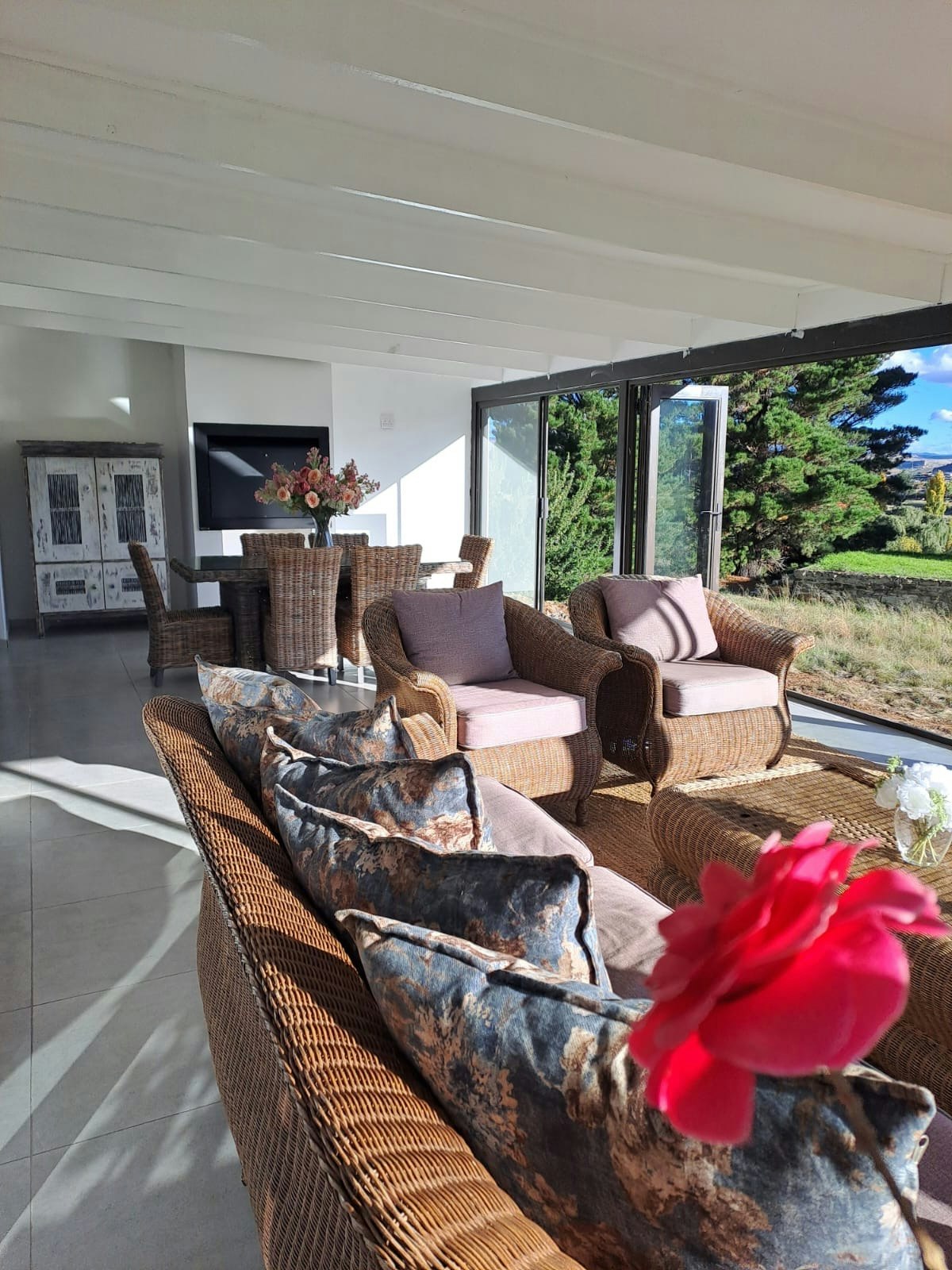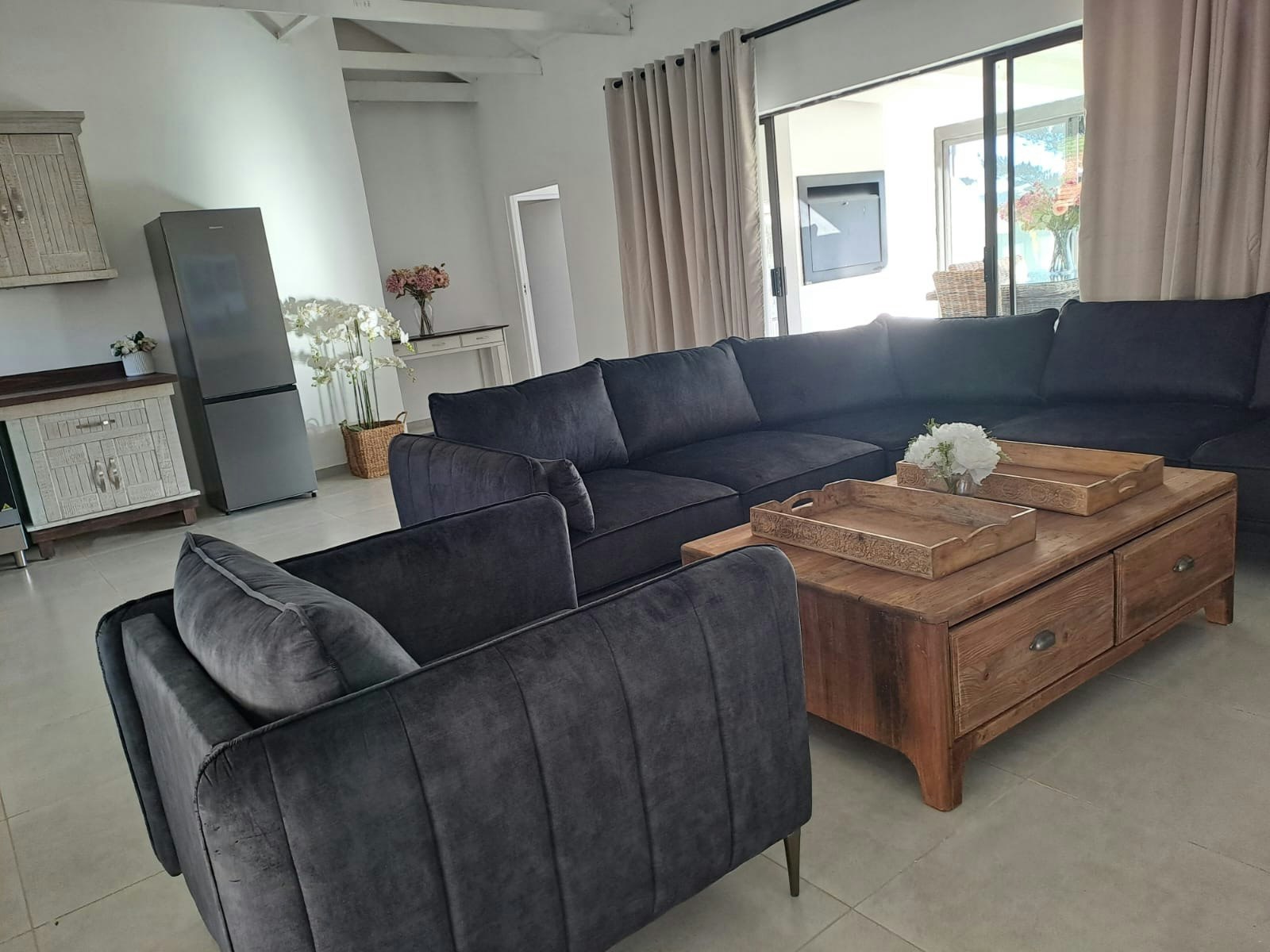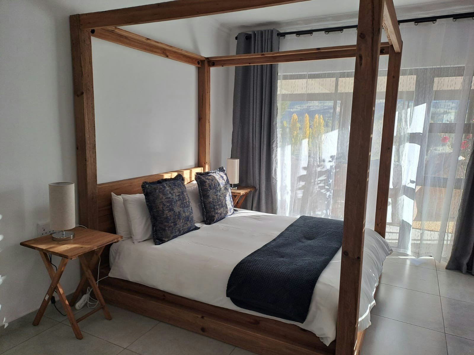The living area features an open-plan design with a fully equipped kitchen, including a gas stove, oven, microwave, Nespresso machine, fridge-freezer, cutlery, and crockery. The lounge area is furnished with comfortable seating and offers breathtaking views from every angle, as well as a smart TV with Netflix and Showmax, along with free Wi-Fi facilities.