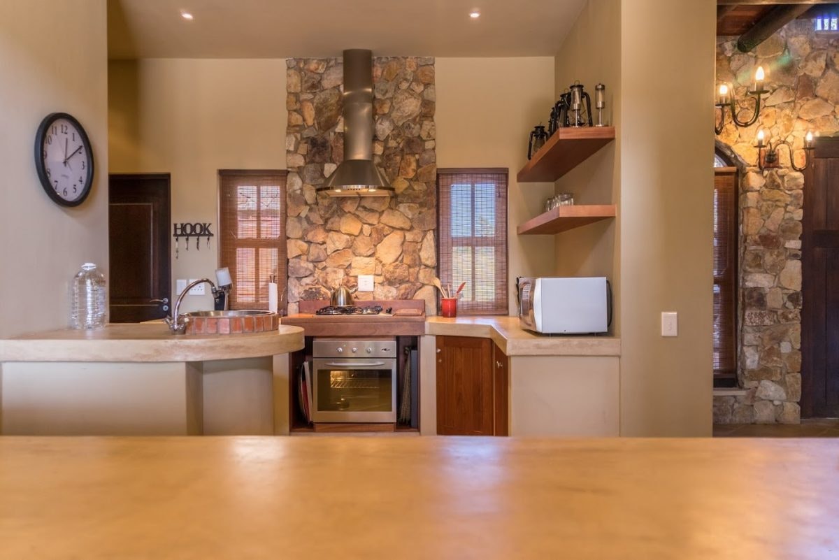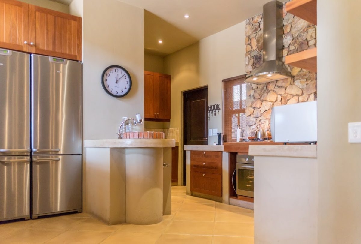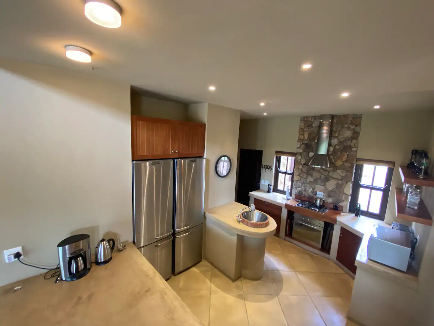 Die kombuis is volledig toegerus vir selfsorg met 'n dubbeldeur-yskas-vrieskas, stoof en oond, mikrogolfoond, ketel, koffiemasjien en 'n aparte opwasarea met 'n skottelgoedwasser, 'n wasmasjien en 'n tuimeldroër. Daar is ook 'n drankiesyskas om jou wyn koud te hou. Daar is 'n TV-sitkamer met sitplek en 'n groot platskerm-TV. Die eetkamer bevat 'n eetkamertafel en stoele vir 8. Stapeldeure maak oop vanaf die eet- en sitkamer na 'n groot oordekte patio-area met sonstoele, buite-eetkamermeubels en ingeboude braaigeriewe. Die patio lei na 'n swembad, wat weer lei na 'n boma-vuurputarea.