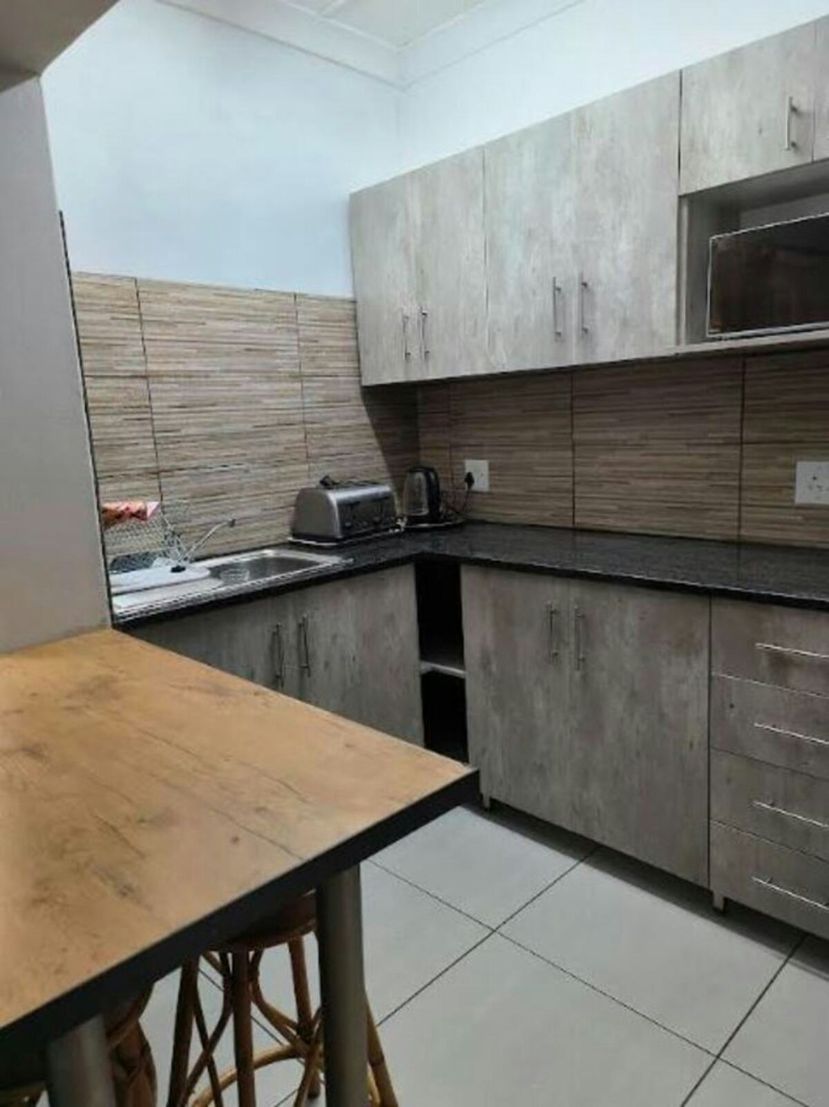 The open-plan living area features a lounge with a comfortable couch and a TV with DStv. The kitchen is equipped with a fridge and microwave, as well as tea- and coffee-making facilities.