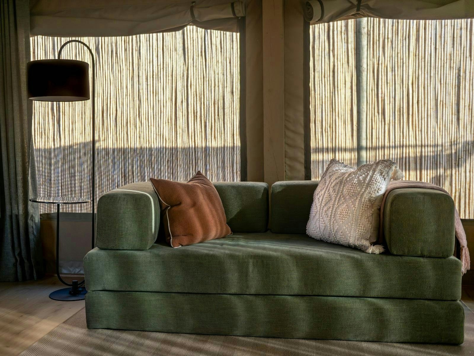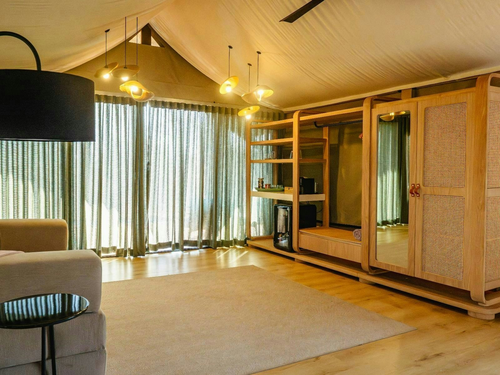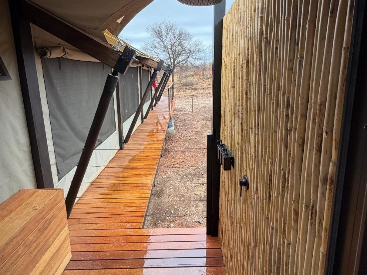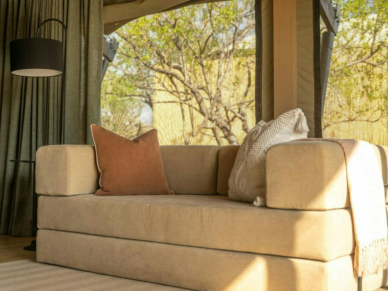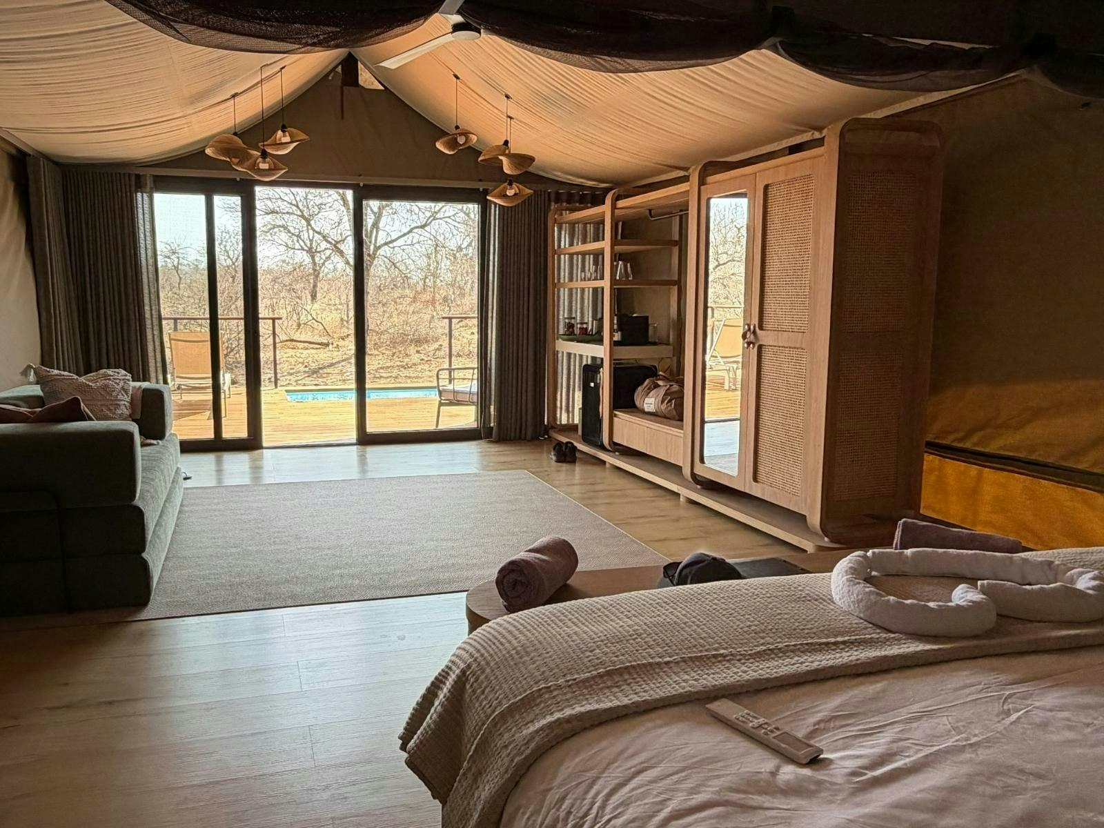 Die akkommodasie bestaan uit 9 luukse tent-suites, elk ontwerp om 2 tot 4 gaste te akkommodeer. Die suites is ruim, 100 m² groot, hoog bo die grond verhef en bied rustige bosuitsigte. Hulle is gemeubileer met super-koninggrootte beddens en beskik oor 'n dubbelslaapbank geskik vir 2 kinders. Elke suite het 'n en suite-badkamer met 'n dubbelwasbak, stort, bad en ingeslote toilet, sowel as 'n buitestort.