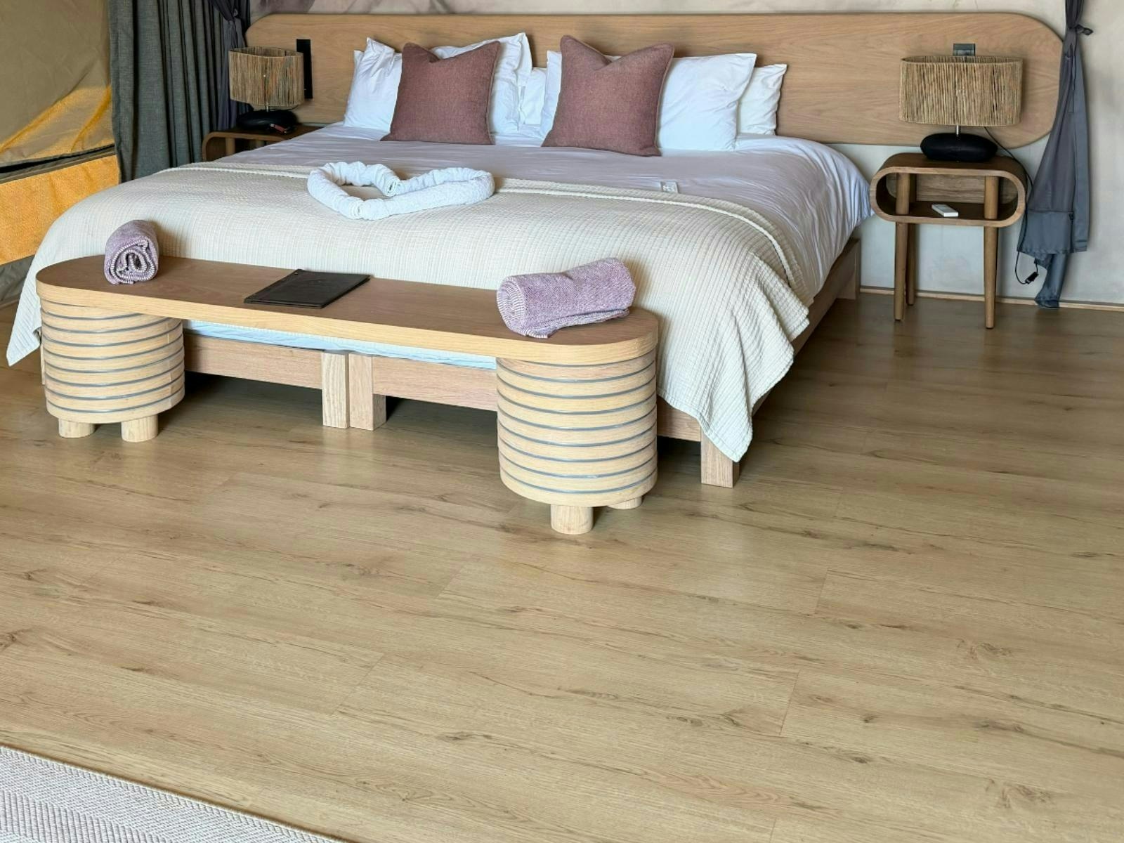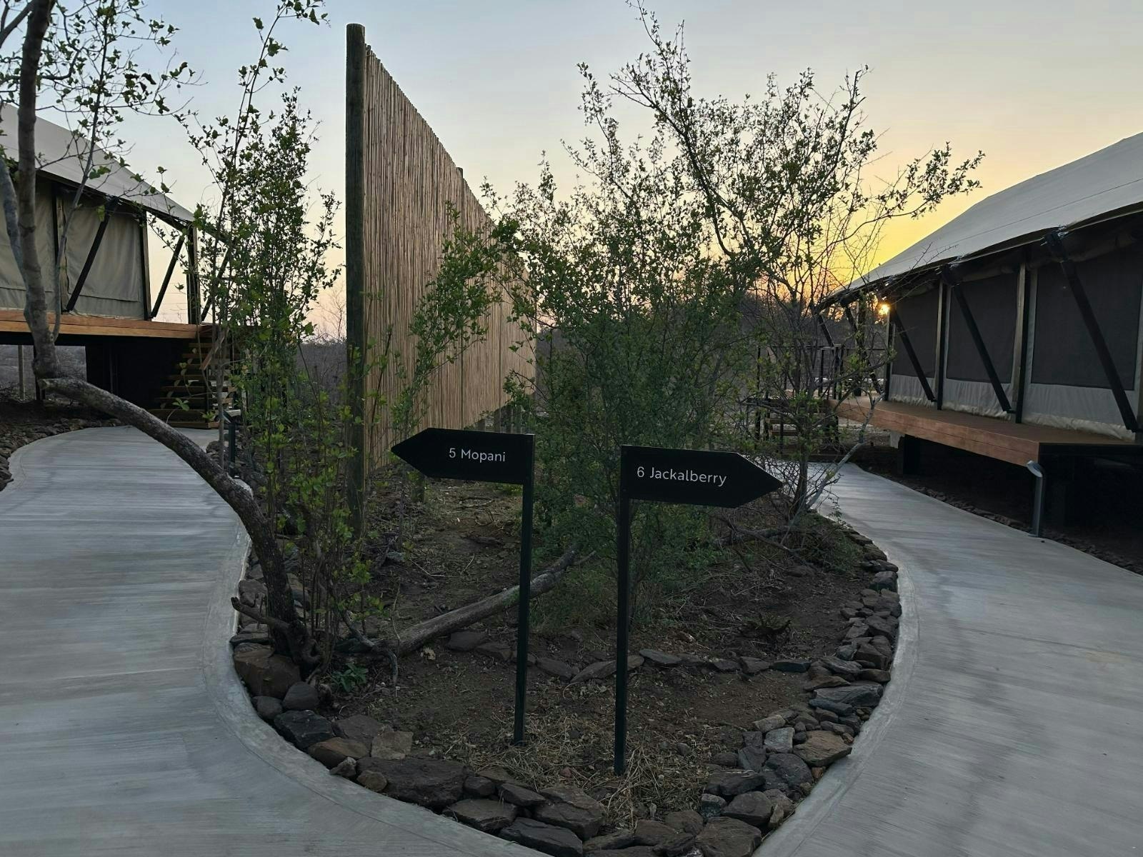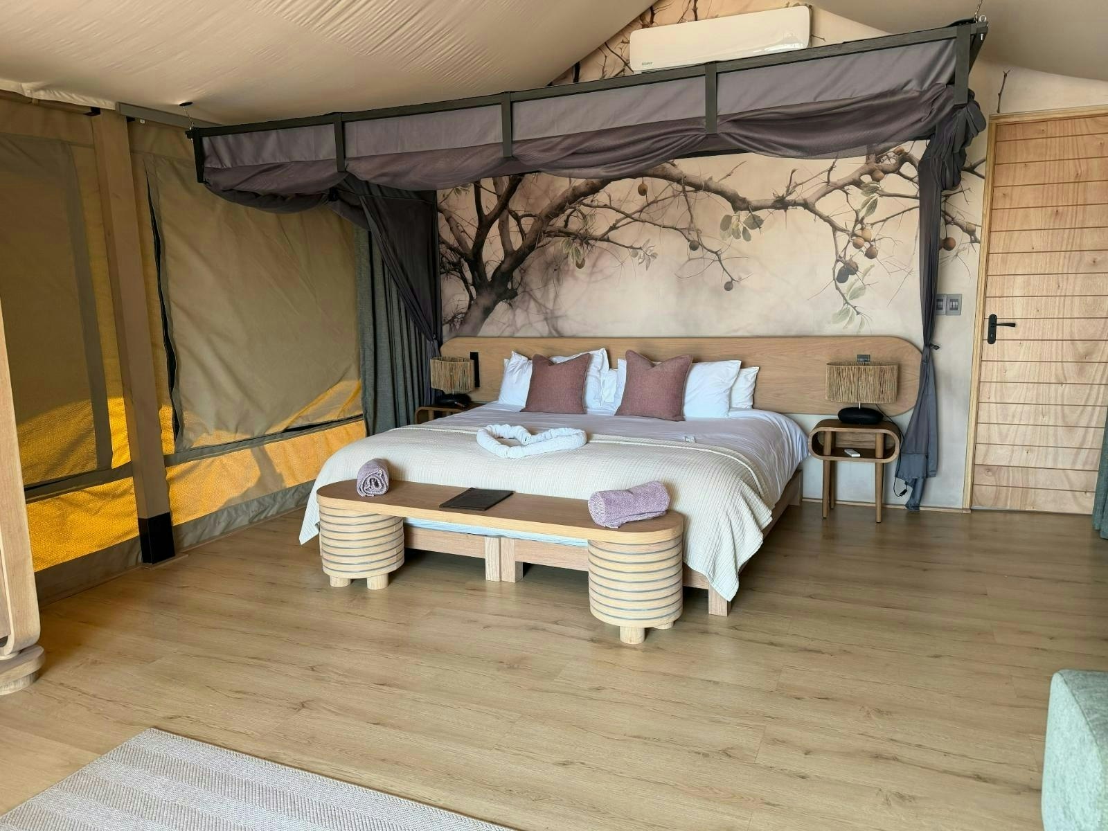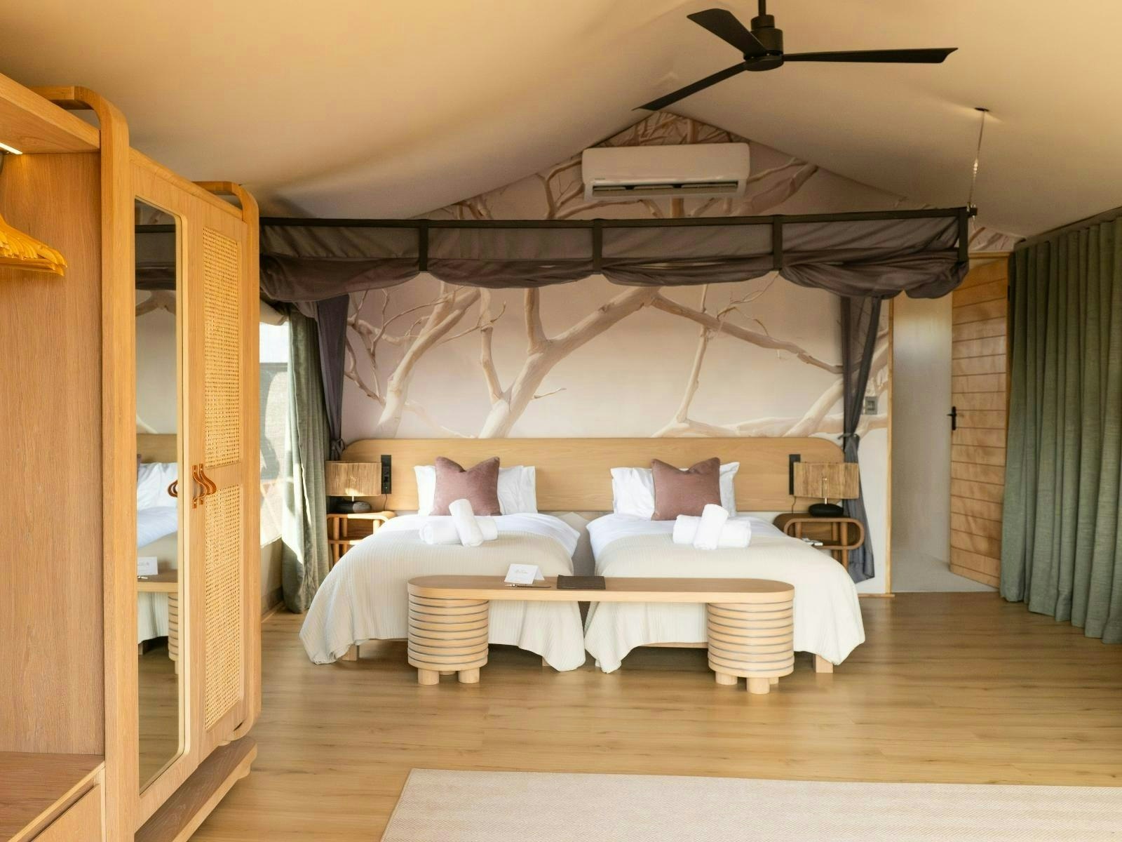 Die akkommodasie bestaan uit 9 luukse tent-suites, elk ontwerp om 2 tot 4 gaste te akkommodeer. Die suites is ruim, 100 m² groot, hoog bo die grond verhef en bied rustige bosuitsigte. Hulle is gemeubileer met super-koninggrootte beddens en beskik oor 'n dubbelslaapbank geskik vir 2 kinders. Elke suite het 'n en suite-badkamer met 'n dubbelwasbak, stort, bad en ingeslote toilet, sowel as 'n buitestort.