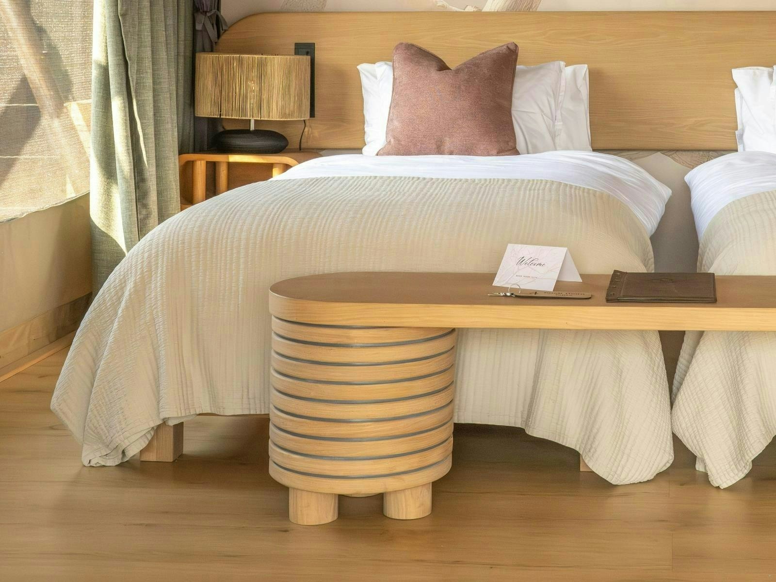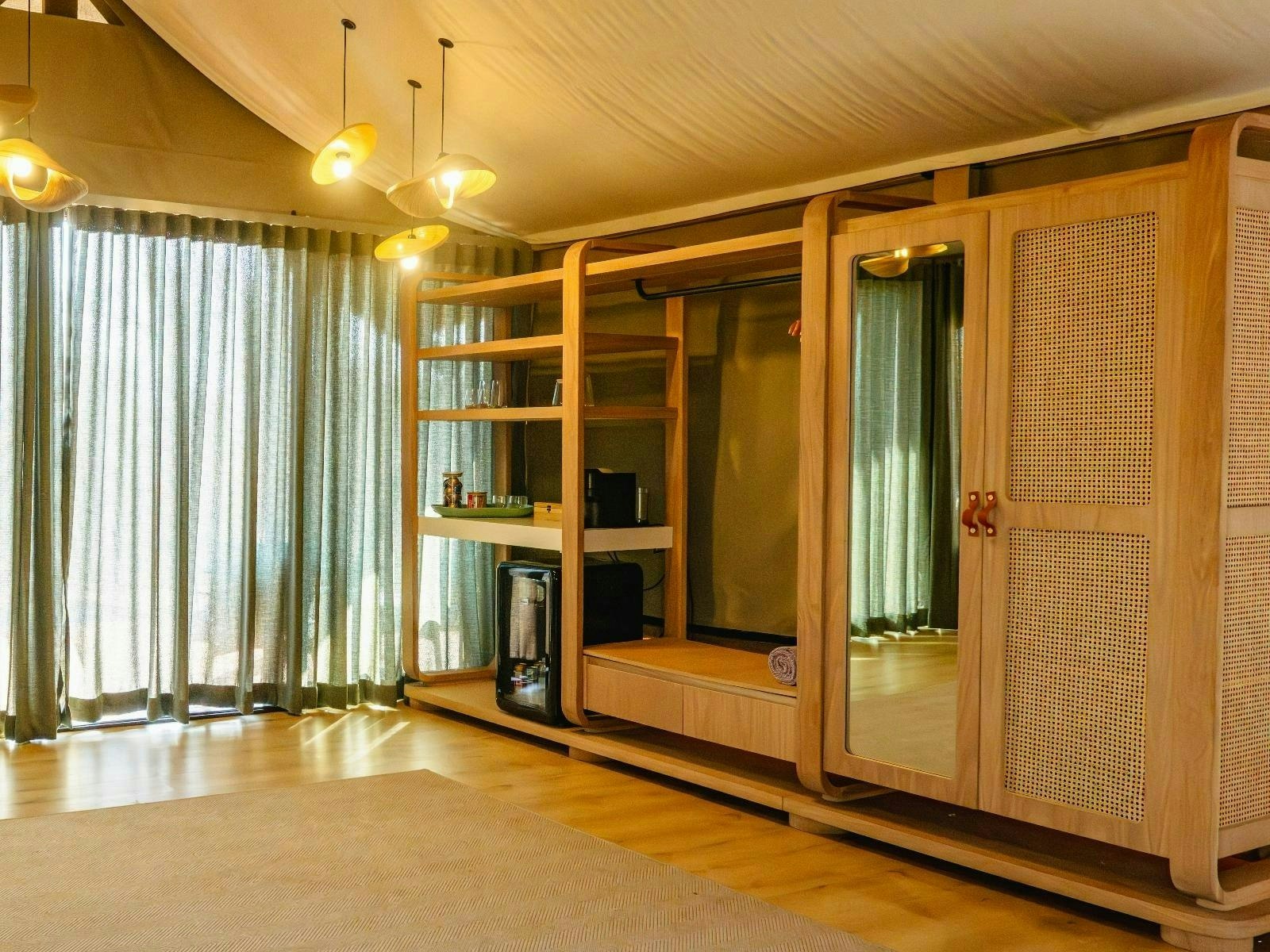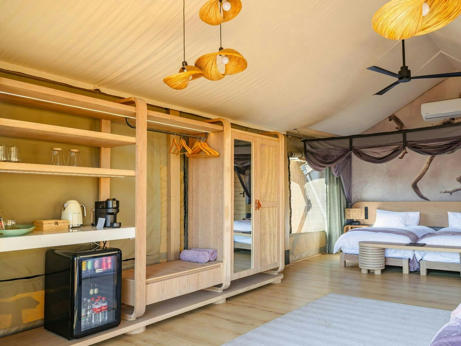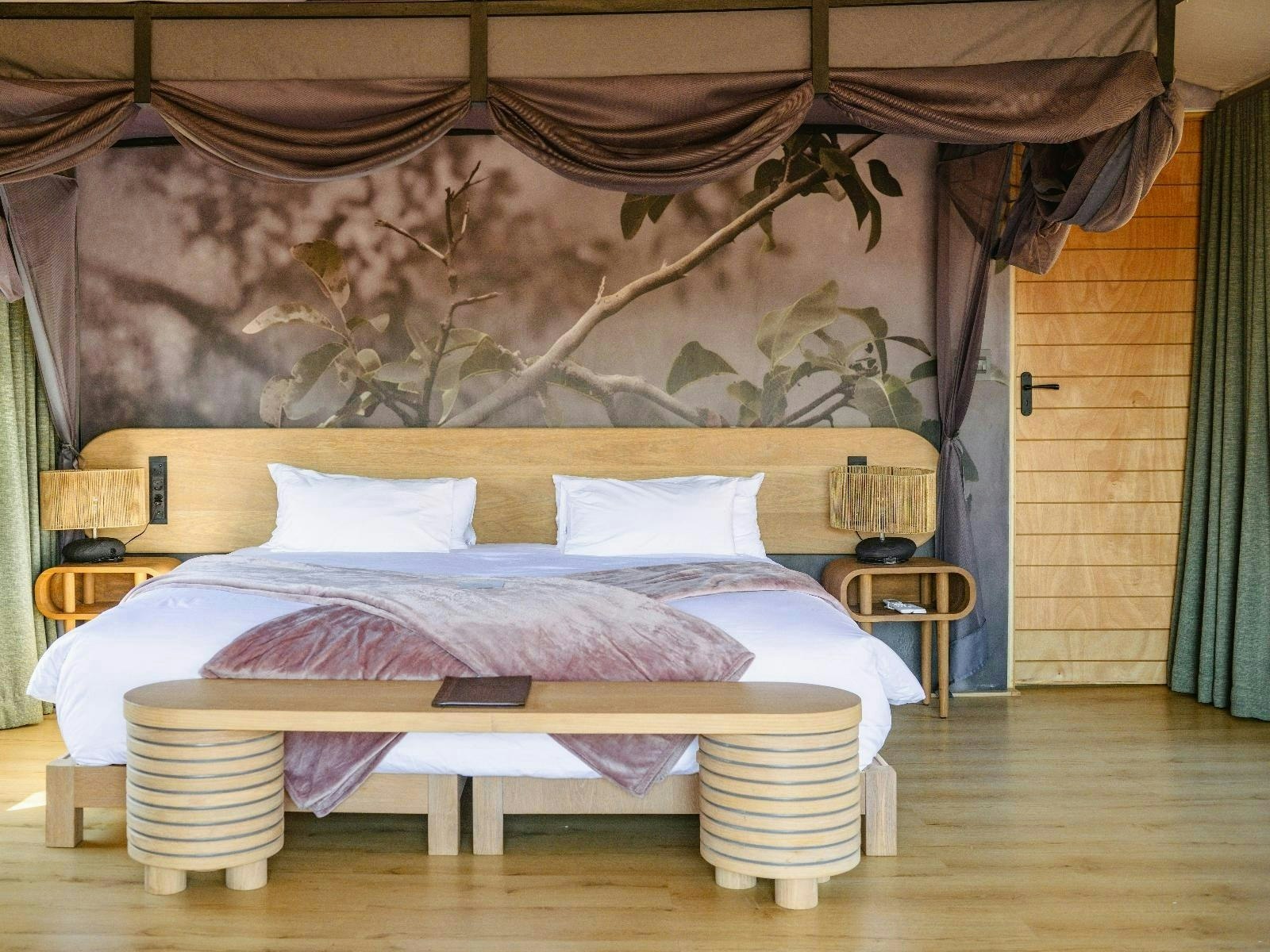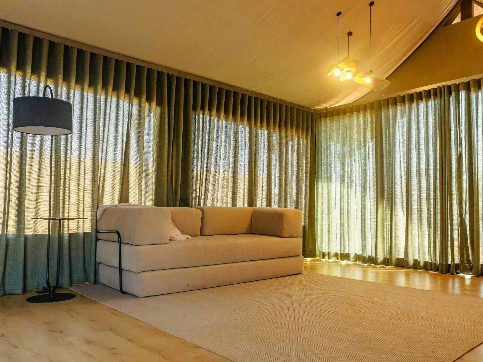 Die akkommodasie bestaan uit 9 luukse tent-suites, elk ontwerp om 2 tot 4 gaste te akkommodeer. Die suites is ruim, 100 m² groot, hoog bo die grond verhef en bied rustige bosuitsigte. Hulle is gemeubileer met super-koninggrootte beddens en beskik oor 'n dubbelslaapbank geskik vir 2 kinders. Elke suite het 'n en suite-badkamer met 'n dubbelwasbak, stort, bad en ingeslote toilet, sowel as 'n buitestort.