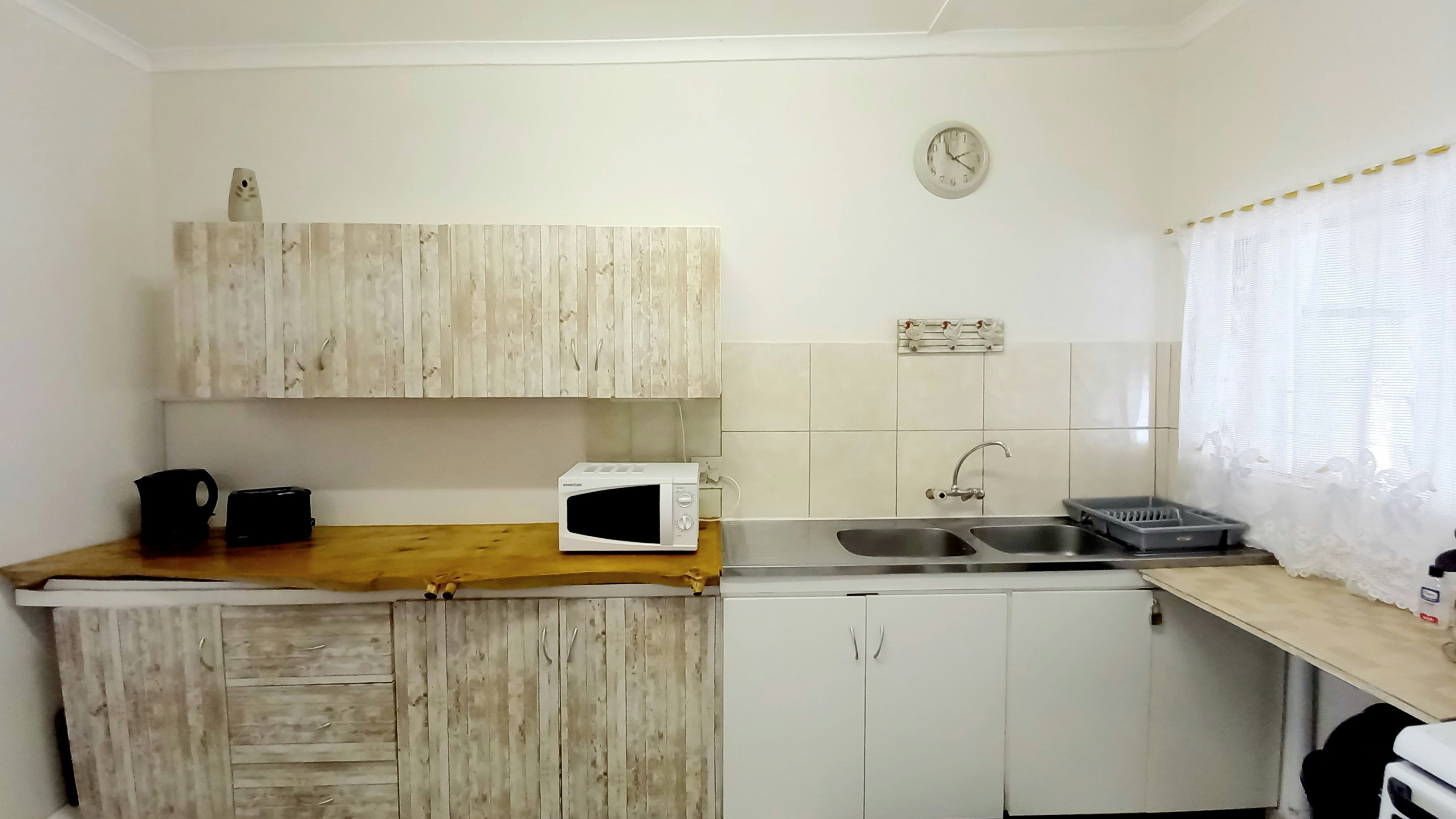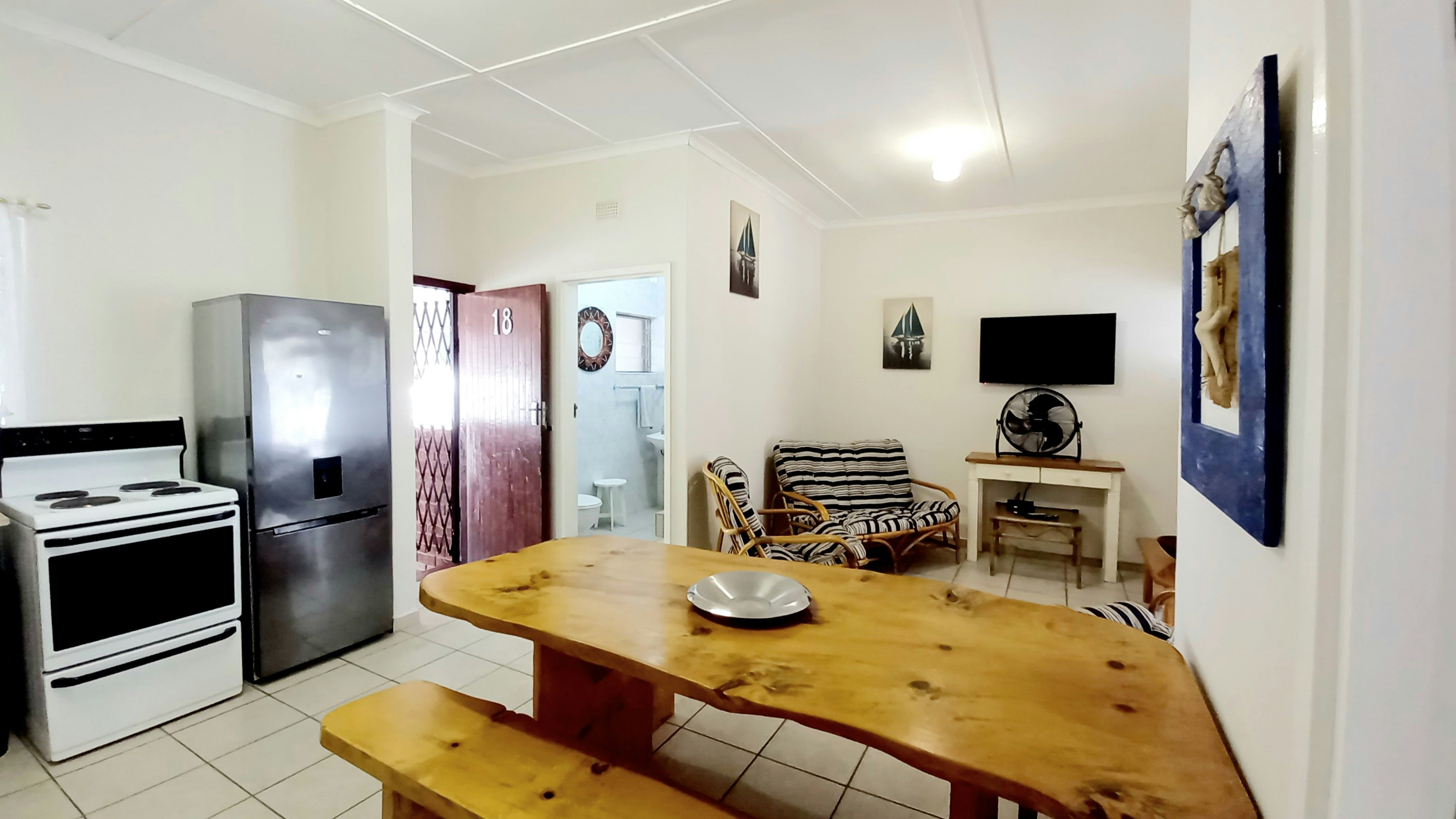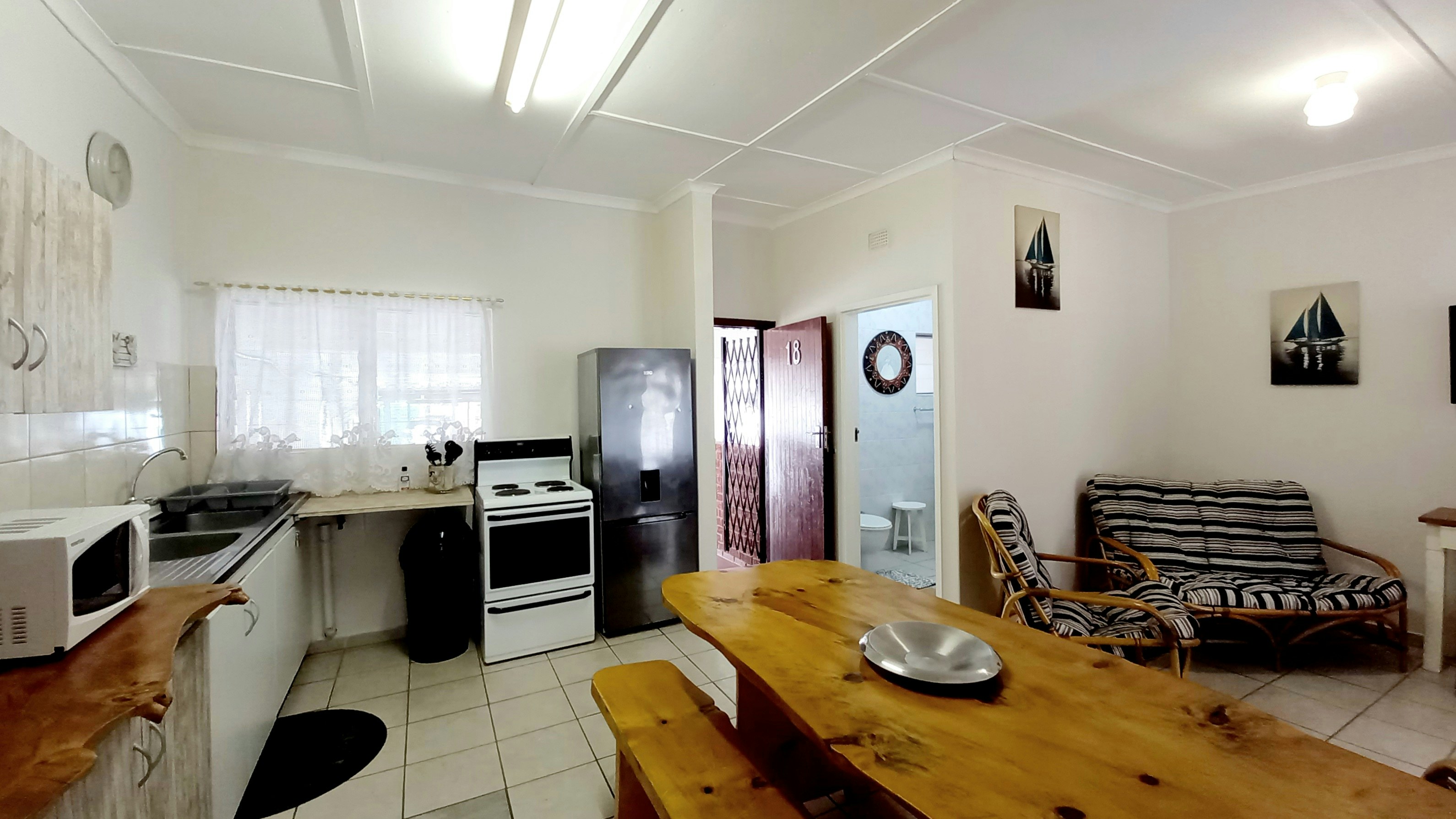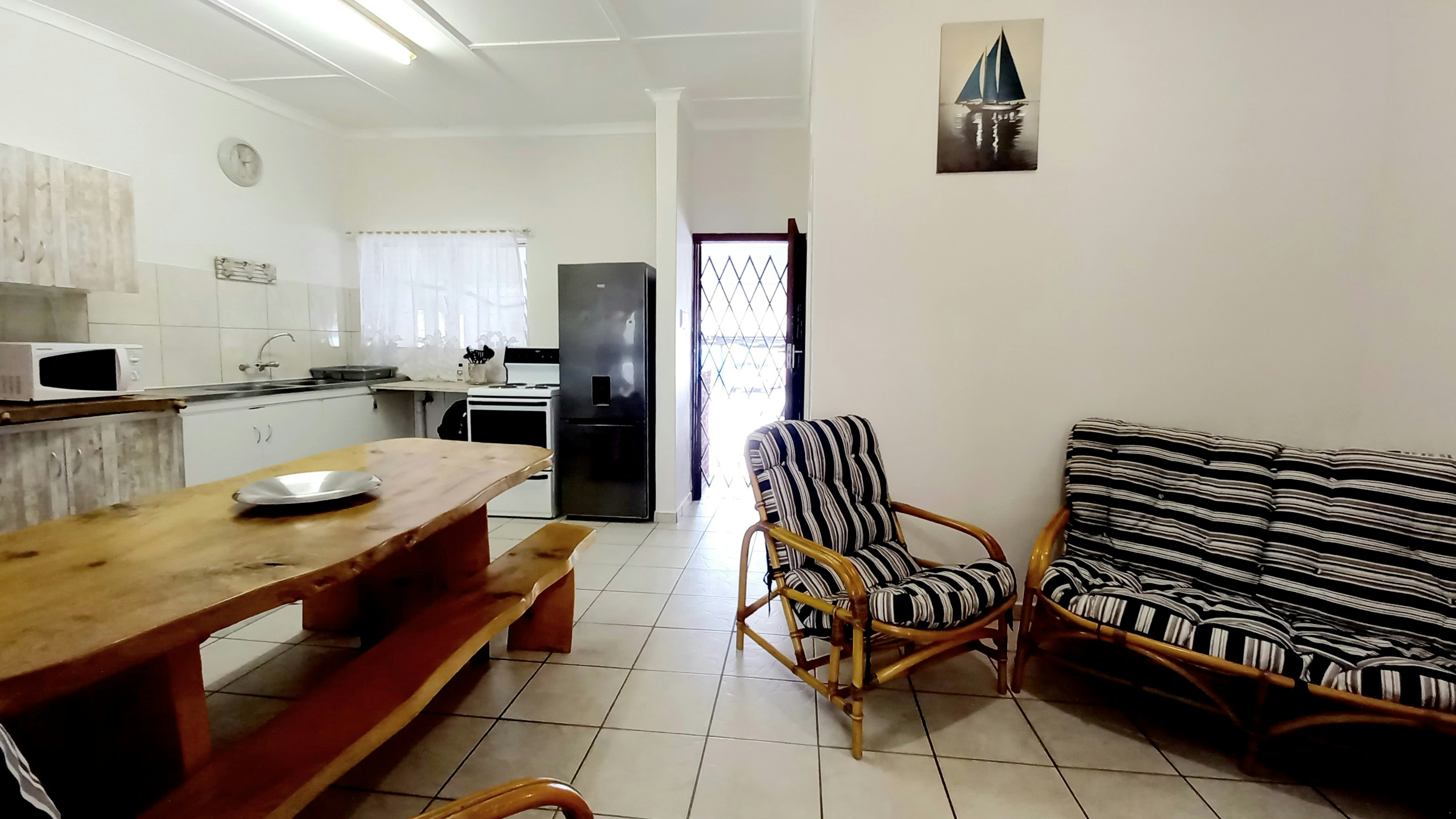 The lounge features a medium-sized flat-screen TV with basic DStv channels and the open-plan kitchen is fitted with a large fridge-freezer, a 4-plate stove, a microwave, kettle and toaster, and cutlery and crockery. Guests can enjoy their meals together at the large 6-seater wooden table with long benches in the kitchen. The unit is secured with a safety gate at the front door, which leads directly into the unit's 1 undercover parking area.