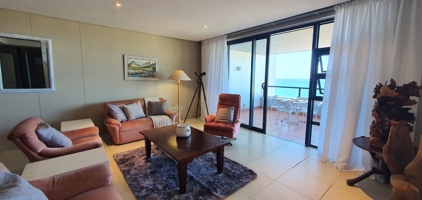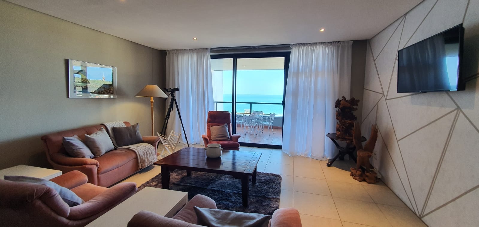 The kitchen is well-equipped for self-catering with a fridge-freezer, stove and oven, microwave, kettle, toaster, and a washing machine. The lounge area contains comfortable seating and a Smart TV. Wi-Fi internet access is available. The living area has sliding doors that open to the balcony with outdoor dining furniture and stunning views.