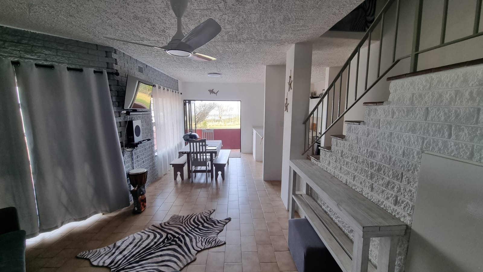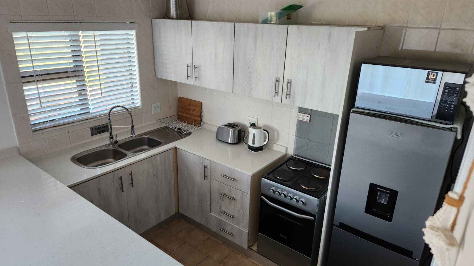 Die oopplan-leefarea is op die onderste verdieping en het 'n kombuis wat met 'n stoof en -oond, mikrogolf, yskas-vrieskas, eetgerei en breekware toegerus is. Die kombuis lei na die etenstafel met oorgenoeg sitplek. Die sitarea het gemaklike sitplek en 'n TV met OpenView-kanale. Daar is 'n hardeskyf met flieks op wat gaste kan kyk.