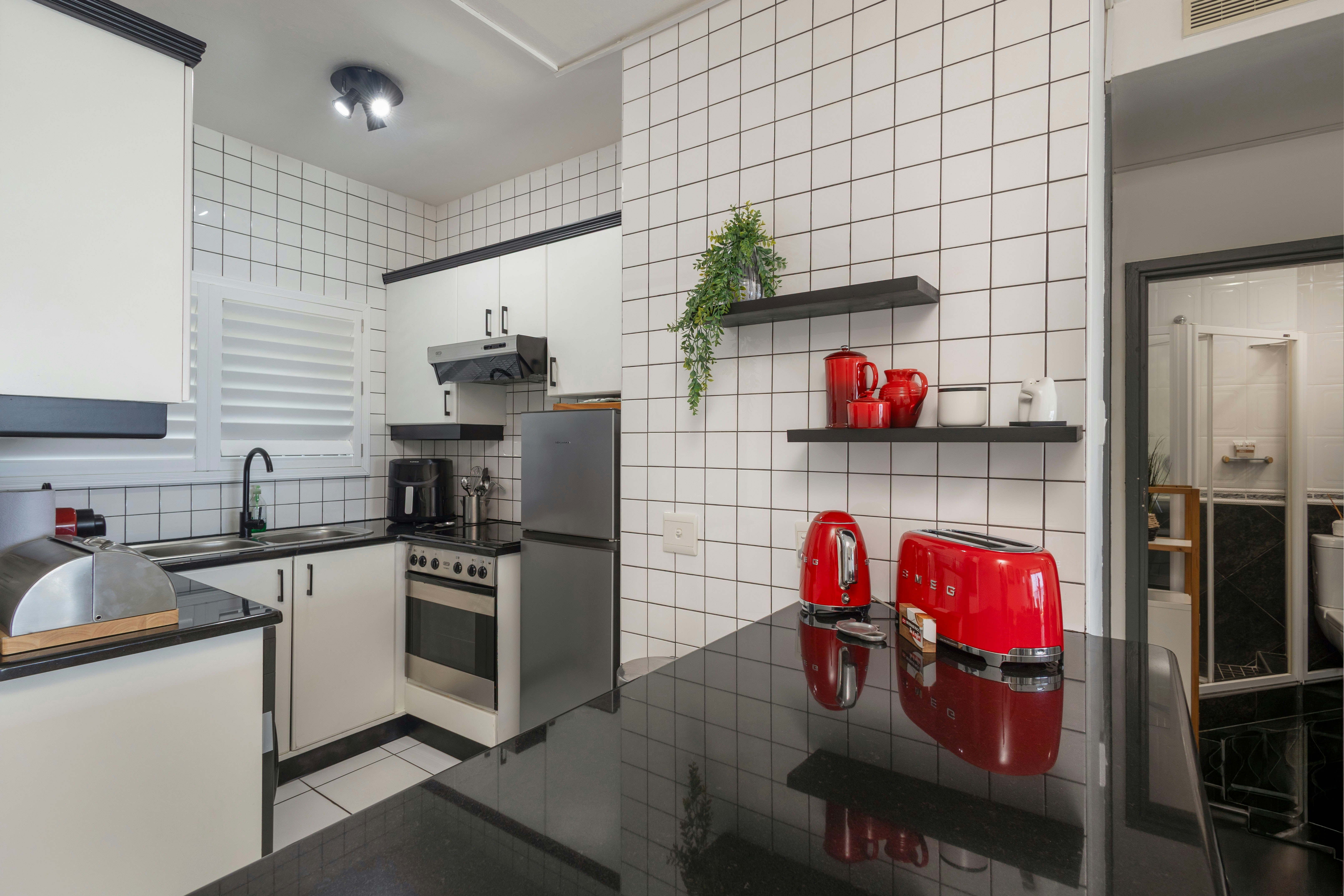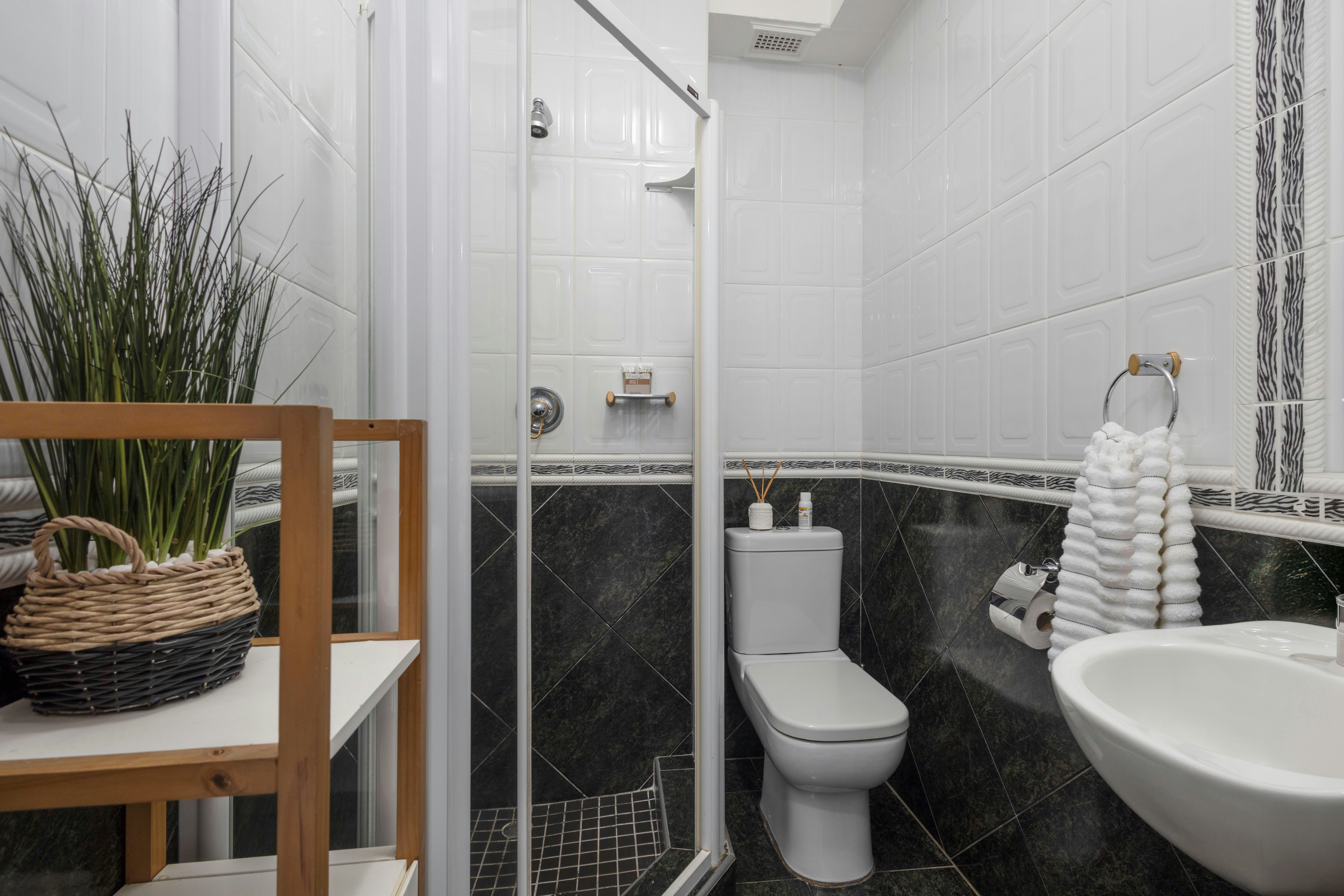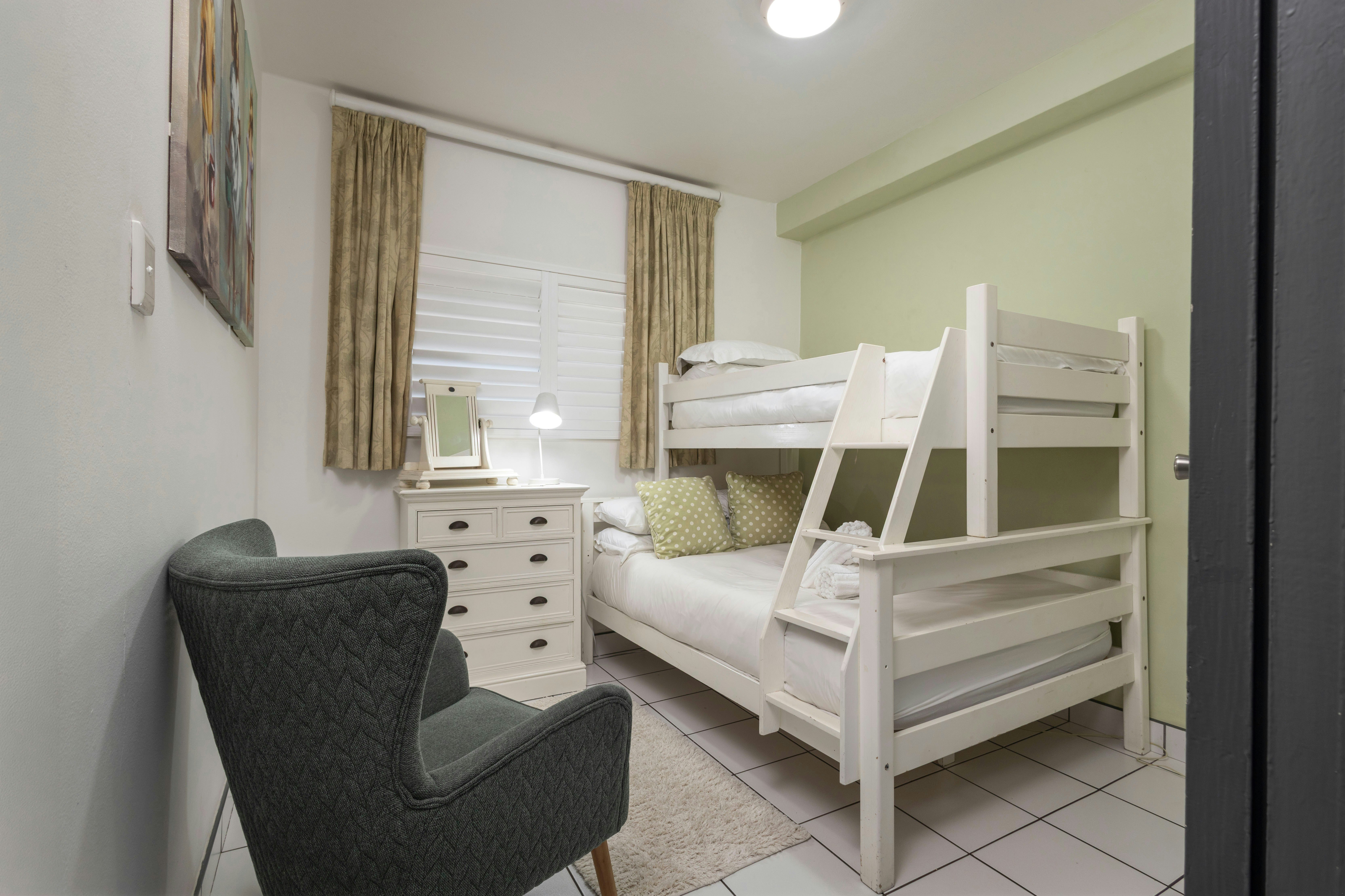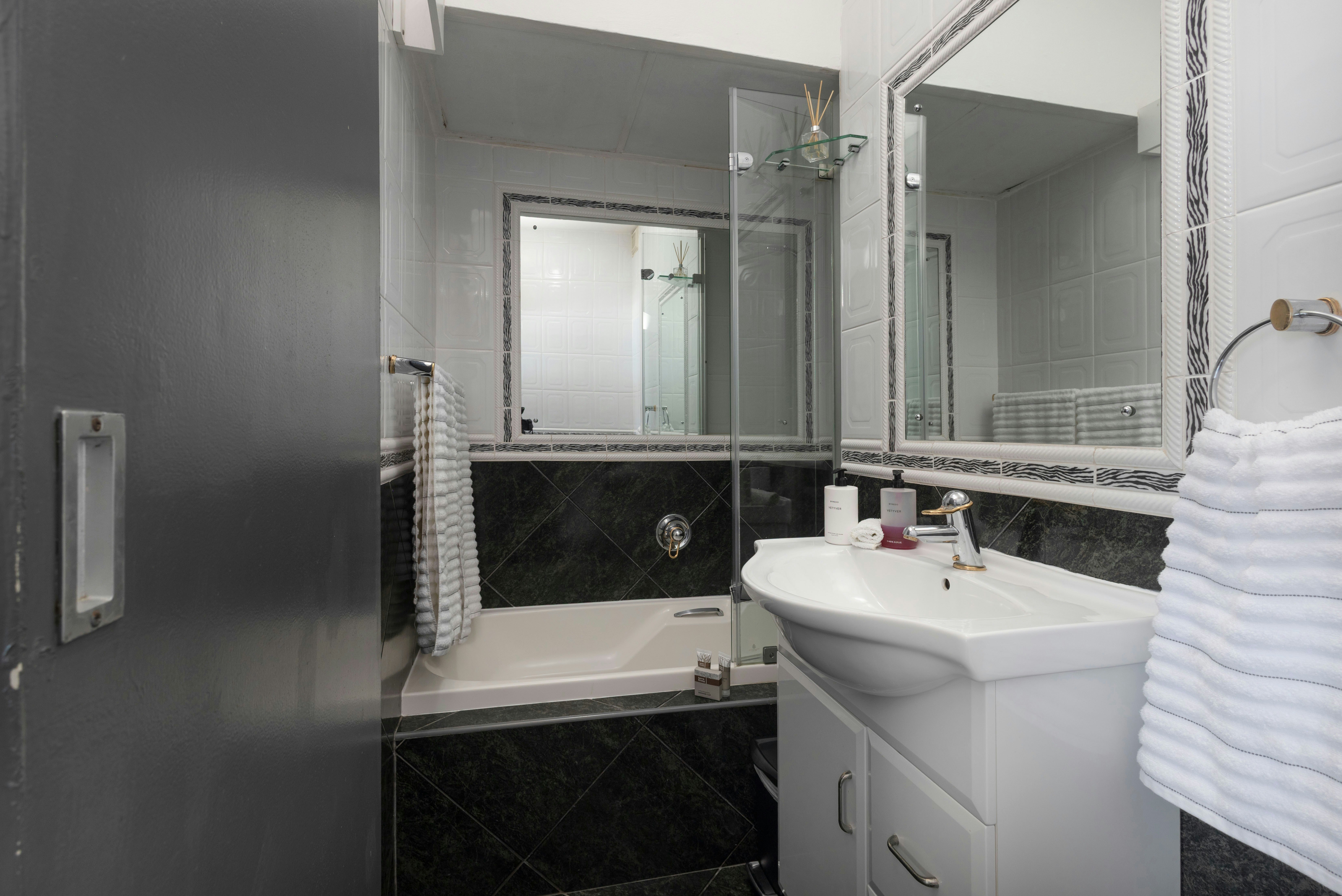The main bedroom opens onto the balcony and is furnished with a queen-size bed. The room also has an en-suite bathroom with a shower, a bath, and a toilet. The second bedroom contains a tri-bunk bed, the bottom bunk serves as a comfortable double bed, and the room makes use of a bathroom with a shower, a toilet, and no washing machine or tumble dryer. For convenience, quality linen, and bath towels are provided, and guests please need to bring their own beach towels.