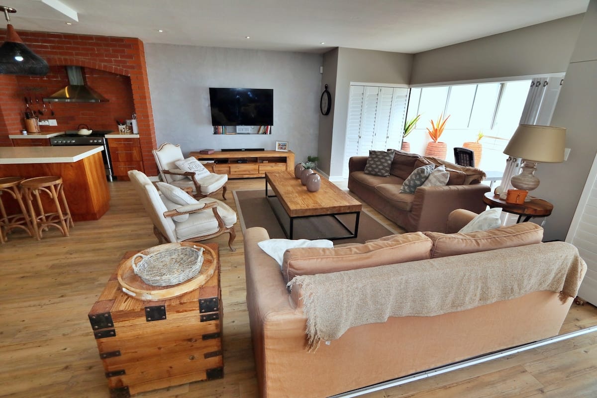 Die oopplan-leefarea word met trappe bereik en het 'n kombuis, sitarea en eetarea. Die kombuis is met 'n yskas, gasstoof en mikrogolf toegerus. Daar is 'n graniettoonbank met stoele en 'n etenstafel met sitplek vir 12 gaste. Die sitarea het 'n ingeboude braai-area, oorgenoeg sitplek en 'n TV met satelliet-kanale. Die leefarea lei na die balkon met 'n eet- en sitarea en 'n uitsig oor die see.