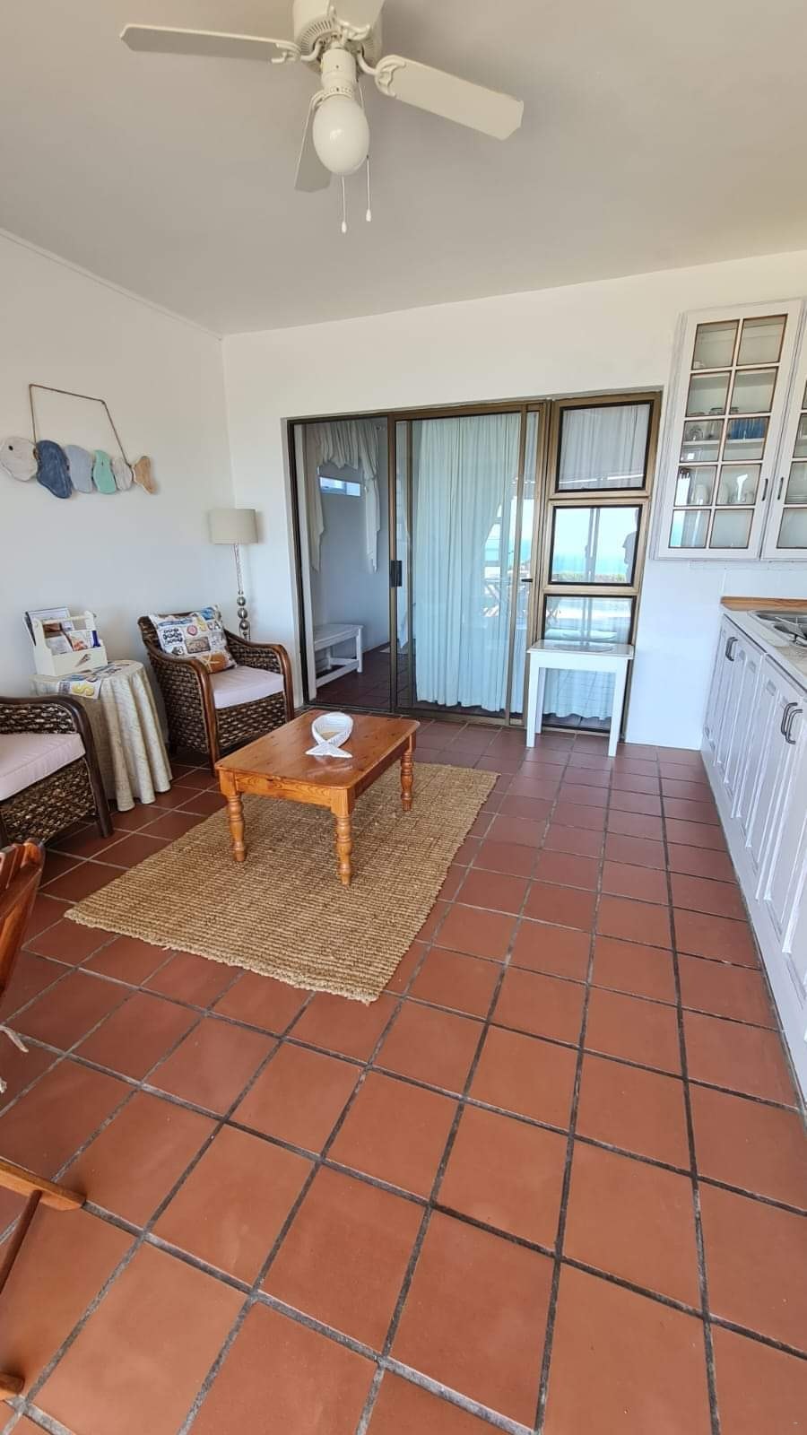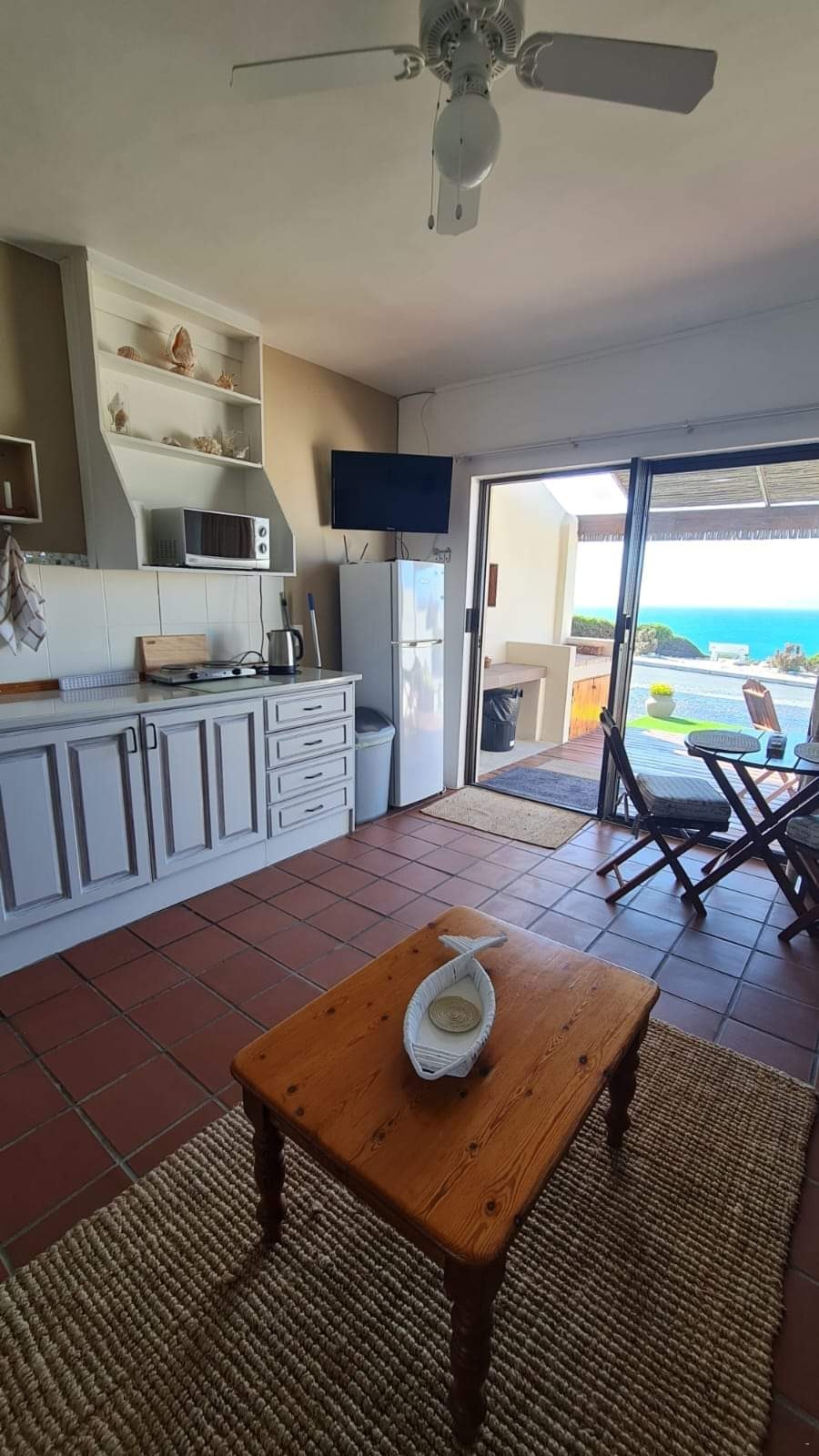 The apartment opens onto a wooden deck with an outdoor dining table and braai facilities overlooking the ocean. Guests are afforded access to free Wi-Fi and off-street parking.