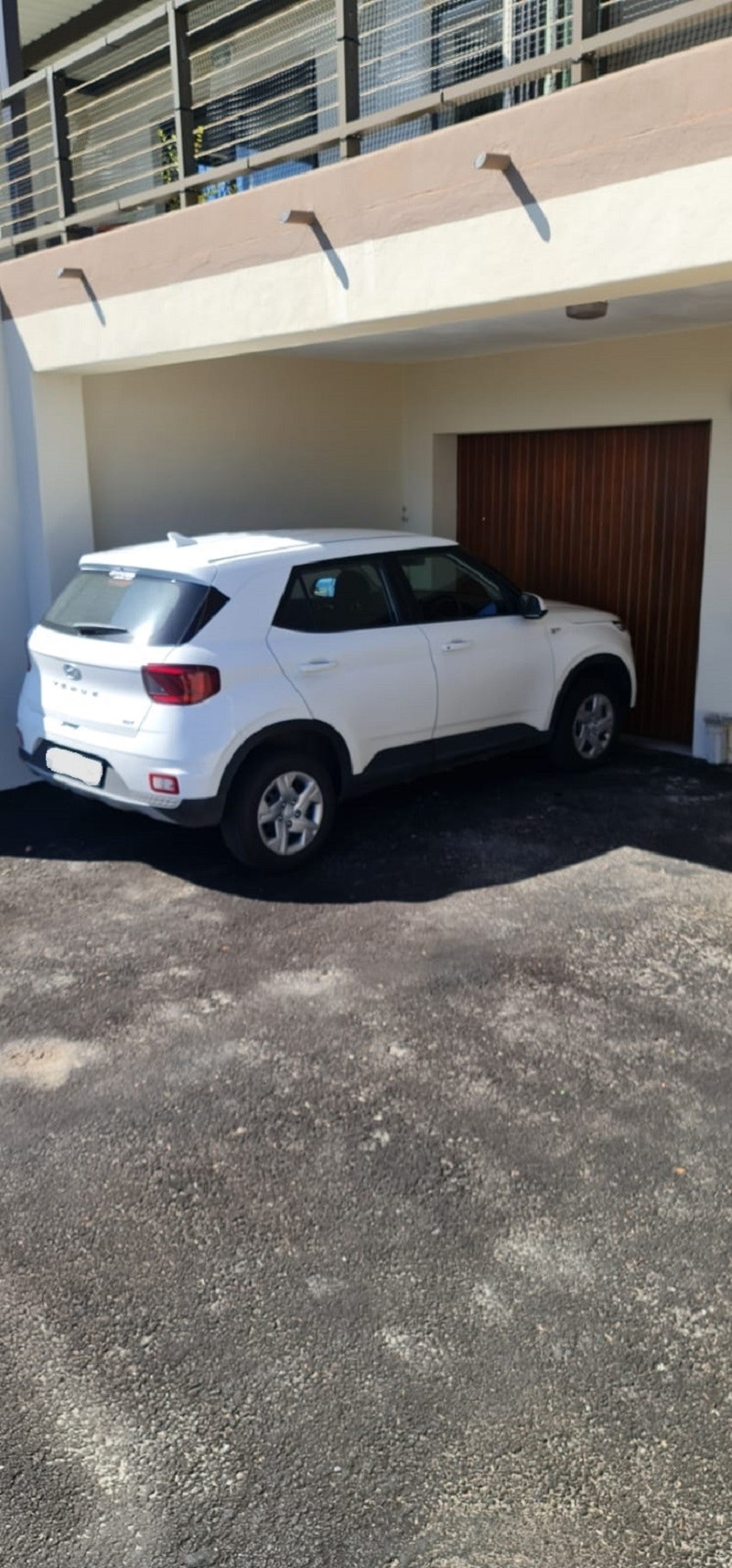 The open-plan kitchen is equipped with a fridge-freezer, 2-plate stove, microwave, and kettle. The living area has a 2-seater dining table, 2 chairs, and a TV with DStv.